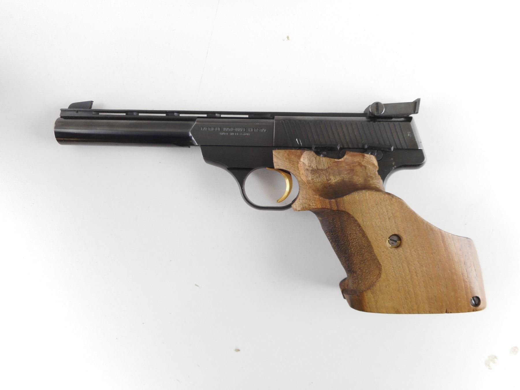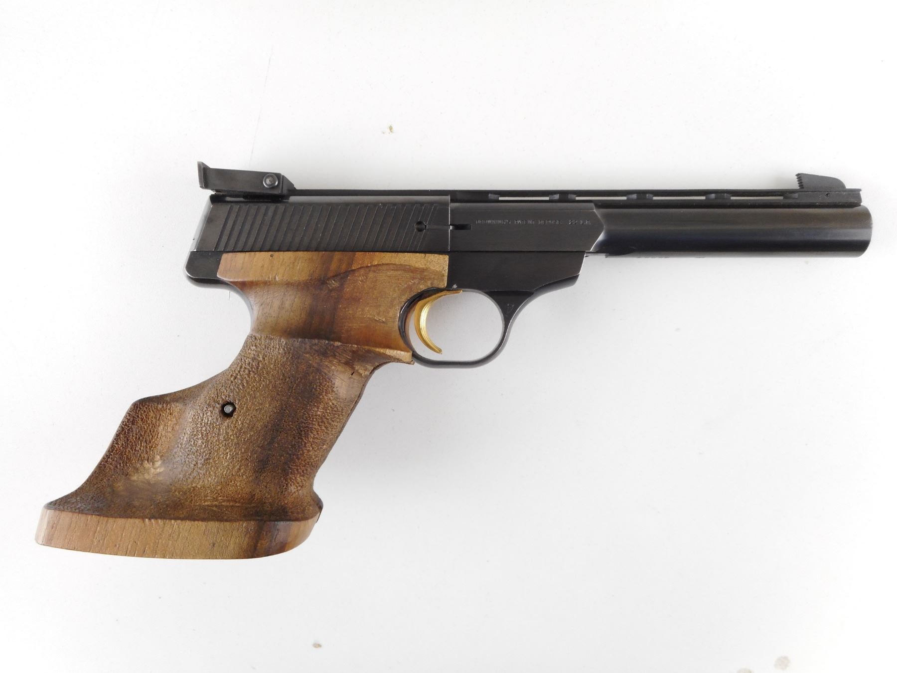 FN BROWNING , MODEL: MEDALIST , CALIBER: 22 LR , COMES WITH MAGAZINE. BORE IS VERY GOOD. BLADE FRONT AND ADJUSTABLE REAR SIGHT. STIPPLED ERGONOMIC GRIPS. GOLD TRIGGER. SOME LIGHT SURFACE RUST ON THE RECEIVER. SHOWS SOME HANDLING MARKS. ACTION: SEMI-AUTOMATIC HANDGUN , BARREL LENGTH: 152MM , SERIAL # 56887T73 , CONDITION: 6/10 , CLASS: CANADIAN RESTRICTED CLASS