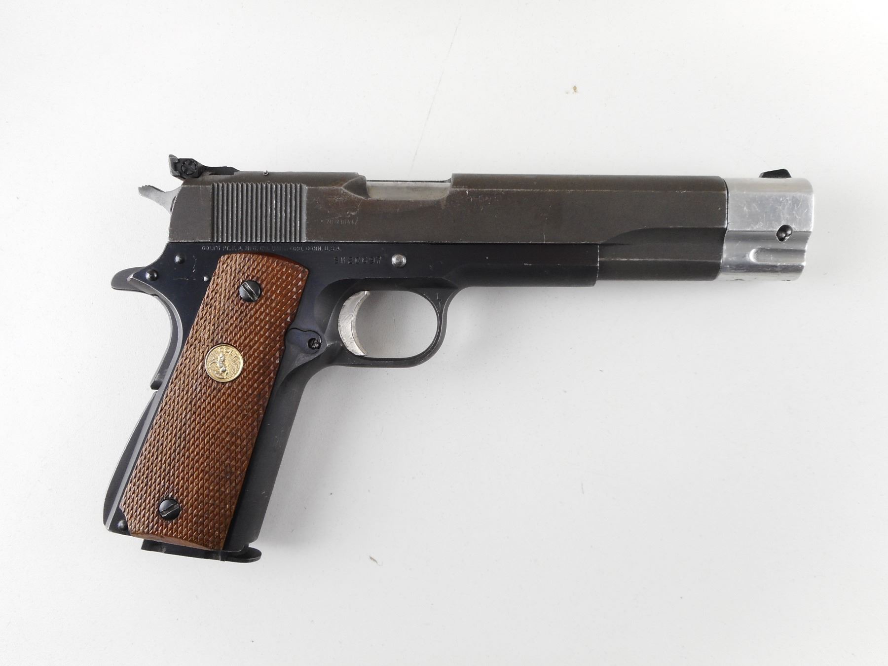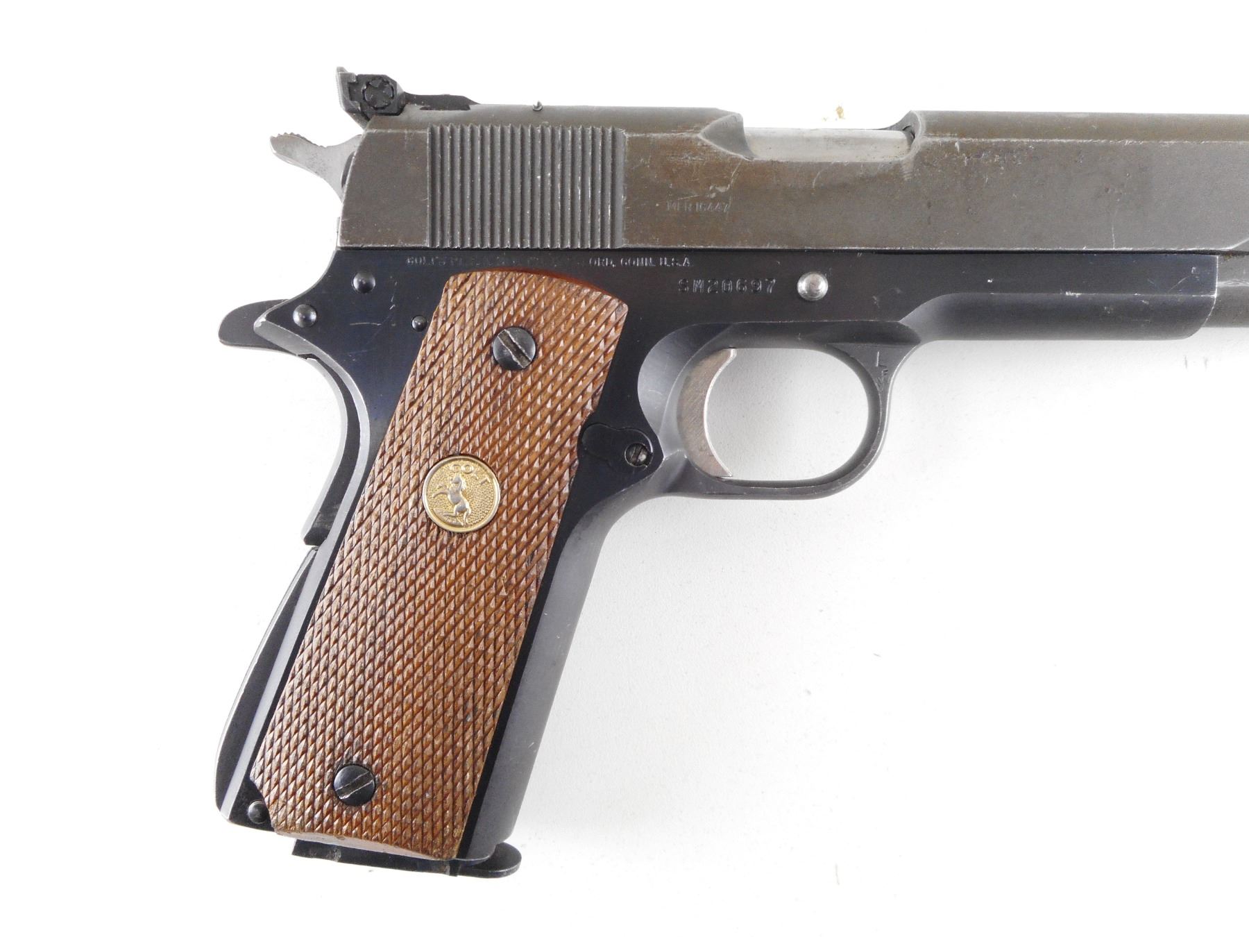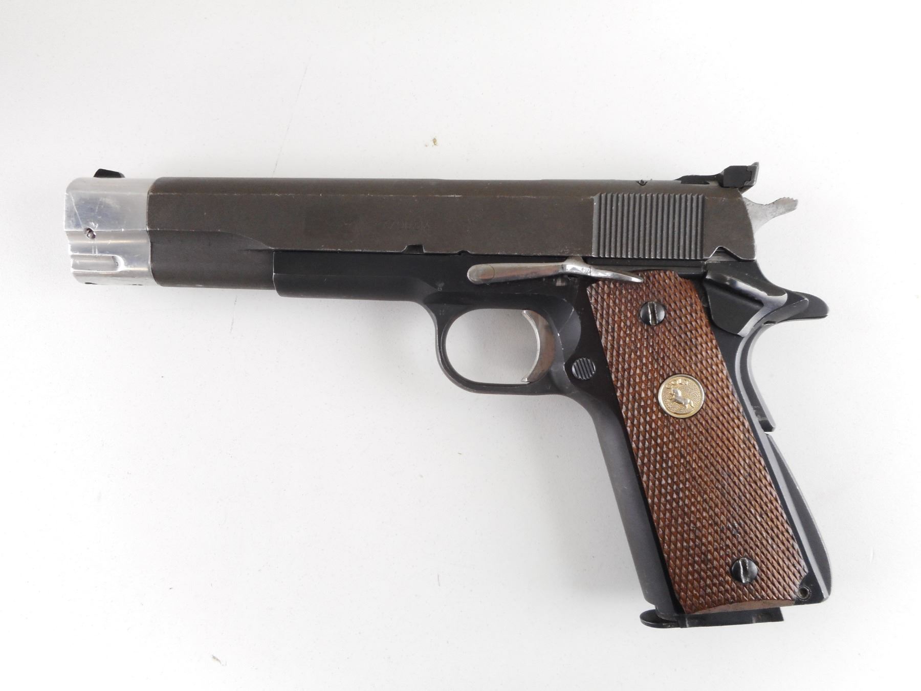 COLT , MODEL: 1911-A1 , CALIBER: 45 ACP , COMES WITH MAGAZINE. BORE IS EXCELLENT. BLADE FRONT AND ADJUSTABLE REAR SIGHT. CHECKERED TWO PIECE GRIPS WITH COLT LOGO. EXTENDED SLIDE RELEASE. EXTENDED MUZZLE ATTACHMENT. SHOWS SOME HANDLING MARKS. ACTION: SEMI-AUTOMATIC HANDGUN , BARREL LENGTH: 119MM , SERIAL # SM20697 , CONDITION: 6/10 , CLASS: CANADIAN RESTRICTED CLASS