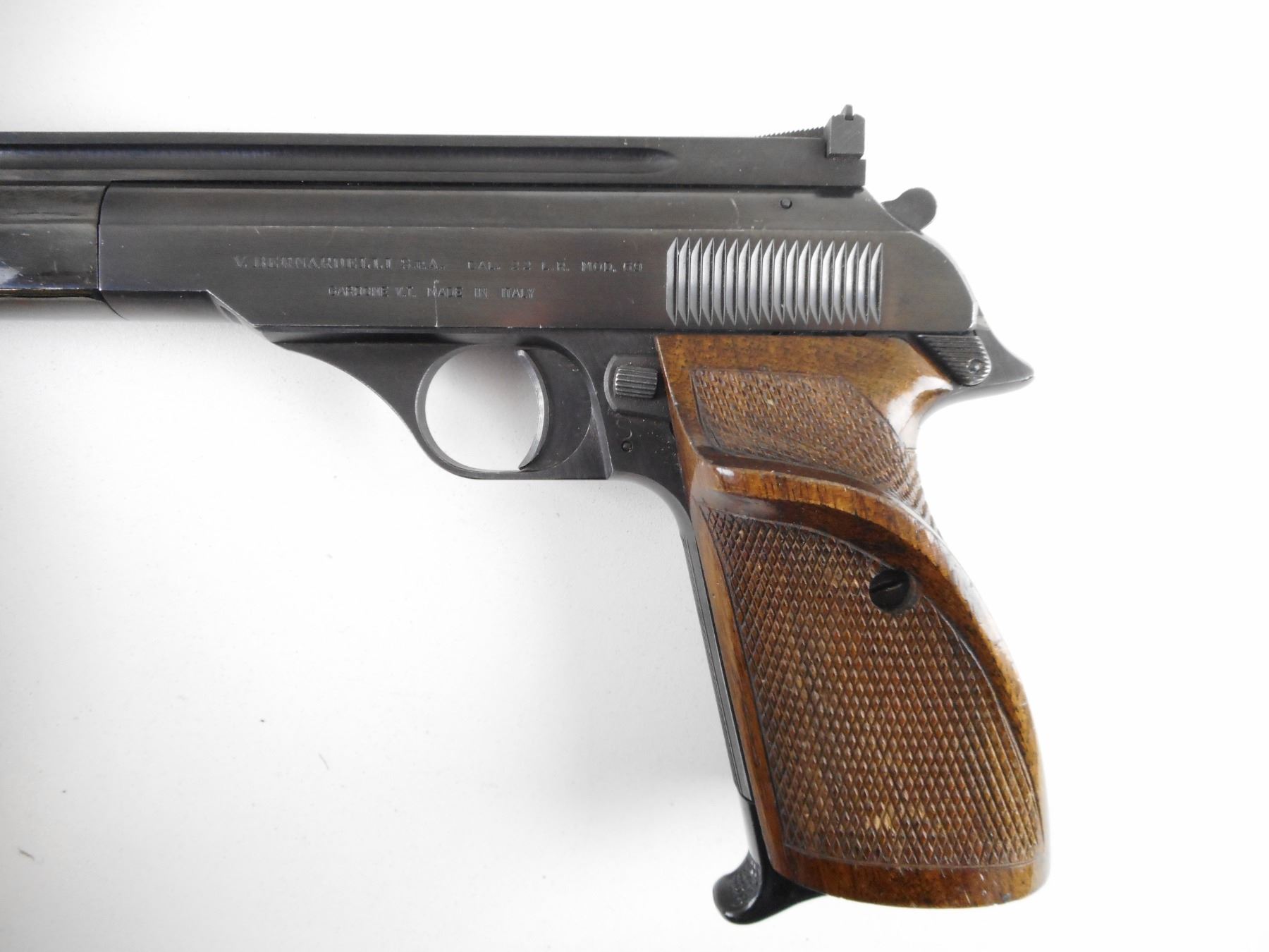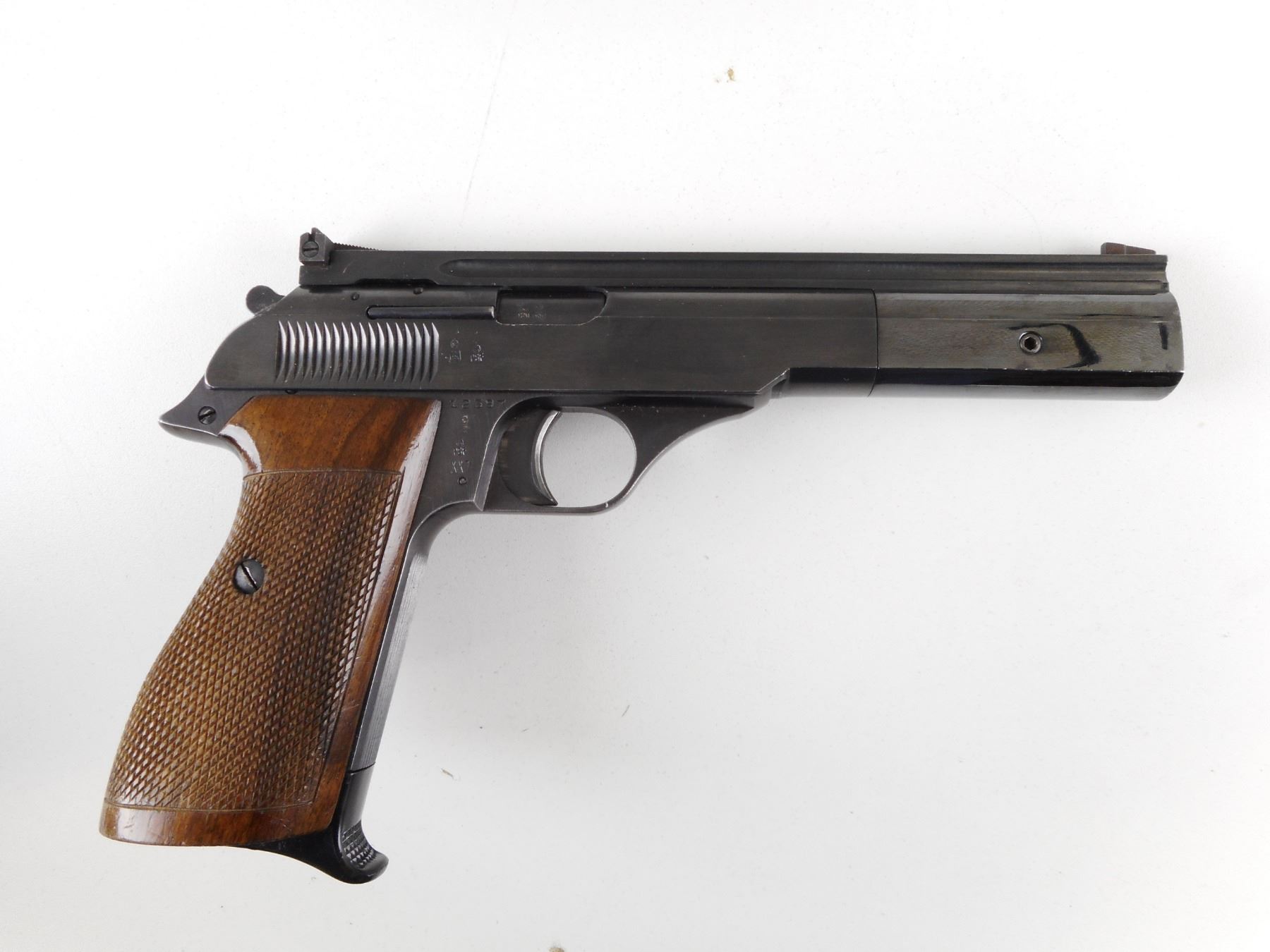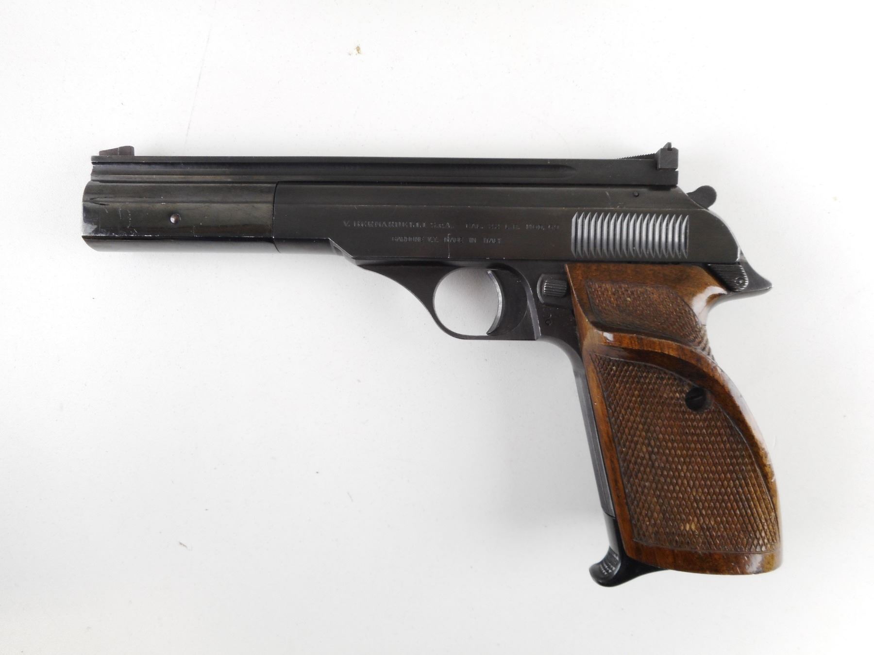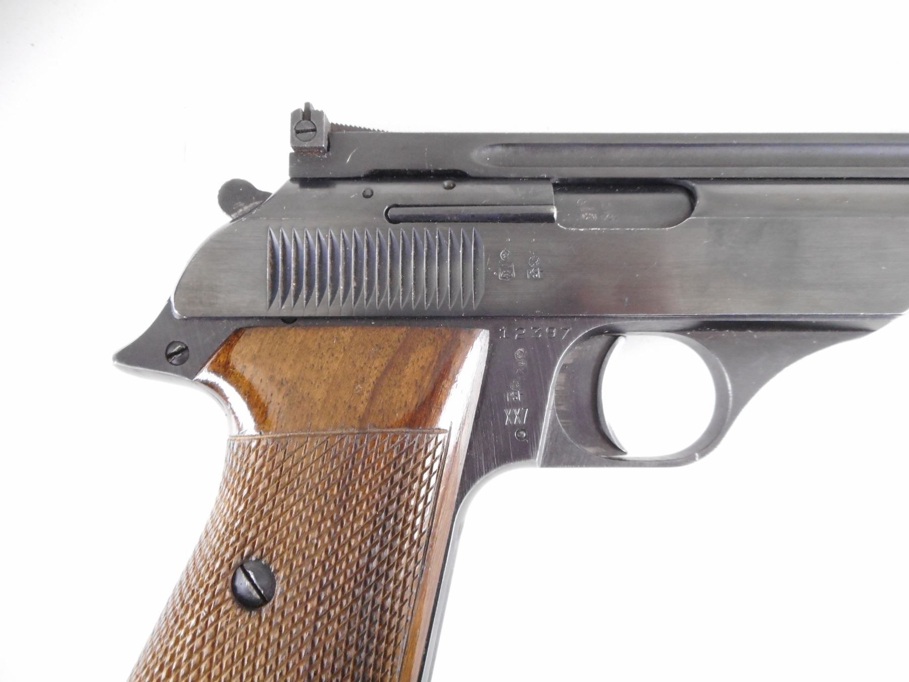 BERNARDELLI VINCENZO , MODEL: 69 , CALIBER: 22 LR , COMES WITH MAGAZINE. BORE IS GOOD. BLADE FRONT AND ADJUSTABLE REAR SIGHTS. CHECKERED TWO PIECE HARDWOOD GRIPS WITH THUMB REST. SHOWS VERY LITTLE HANDLING MARKS. ACTION: SEMI-AUTOMATIC HANDGUN , BARREL LENGTH: 146MM , SERIAL # 12397 , CONDITION: 7/10 , CLASS: CANADIAN RESTRICTED CLASS