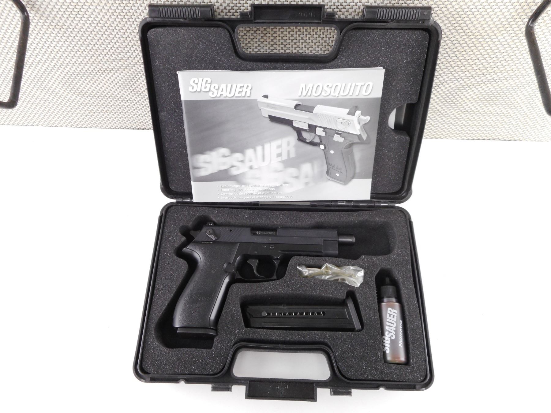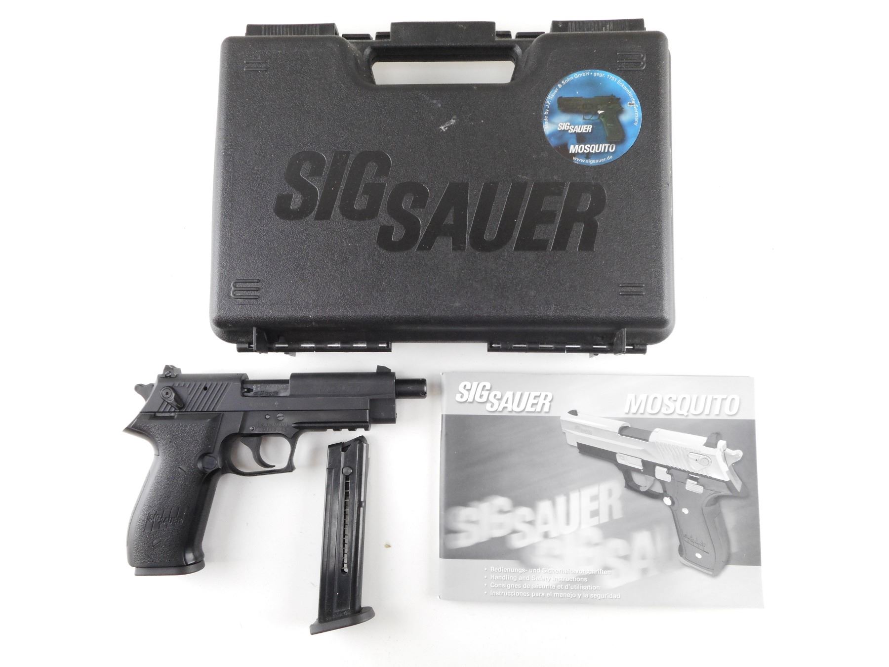 SIG SAUER , MODEL: MOSQUITO , CALIBER: 22 LR , COMES WITH HARD CASE AND TWO MAGAZINE. BORE IS VERY GOOD. YELLOW 3 DOT SIGHT SYSTEM. STIPPLED BLACK SYNTHETIC GRIP PANELS. MUZZLE EXTENSION. SHOWS VERY LITTLE HANDLING MARKS. ACTION: SEMI-AUTOMATIC HANDGUN , BARREL LENGTH: 119MM , SERIAL # A024062 , CONDITION: 8/10 , CLASS: CANADIAN RESTRICTED CLASS