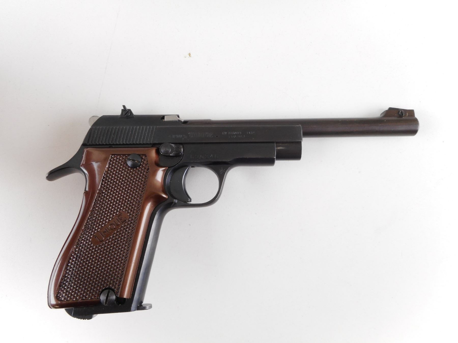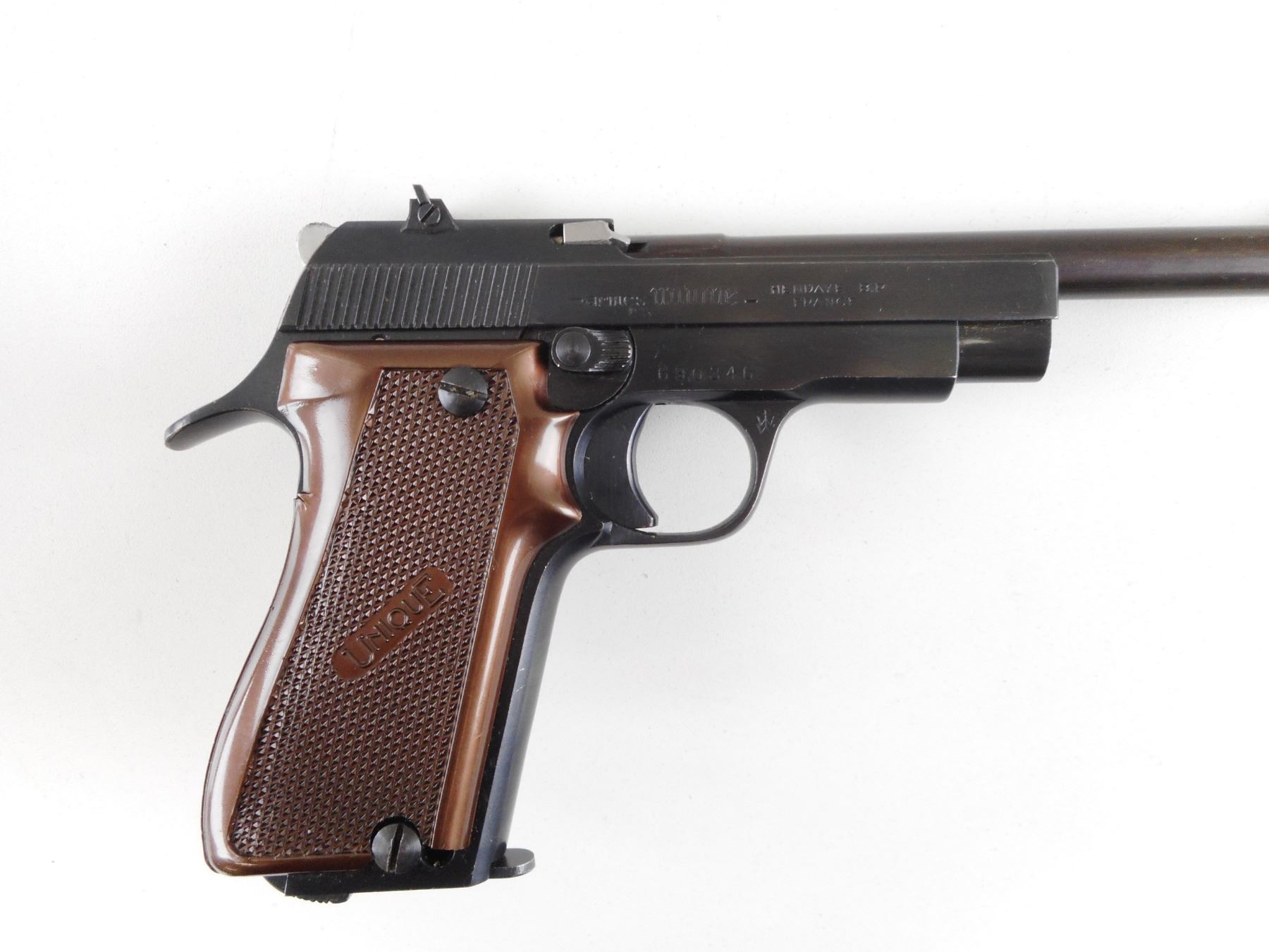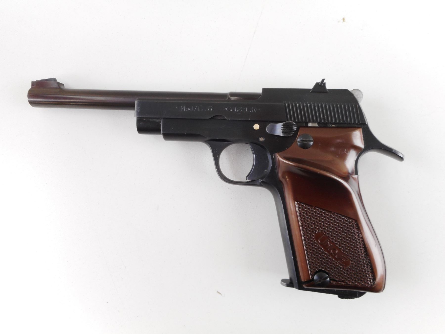 UNIQUE , MODEL: D6 , CALIBER: 22 LR , COMES WITH MAGAZINE. BORE IS EXCELLENT. BLADE FRONT AND FIXED REAR SIGHTS. TWO PIECE BROWN PLASTIC GRIP PANELS WITH UNIQUE LOGO. BOTH GRIP PANELS ARE CRACKED AND CHIPPED AT THE BASE. SHOWS SOME HANDLING MARKS. ACTION: SEMI-AUTOMATIC HANDGUN , BARREL LENGTH: 152MM , SERIAL # 690346 , CONDITION: 7/10 , CLASS: CANADIAN RESTRICTED CLASS