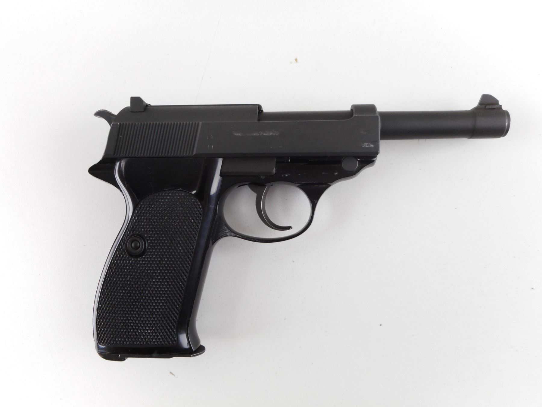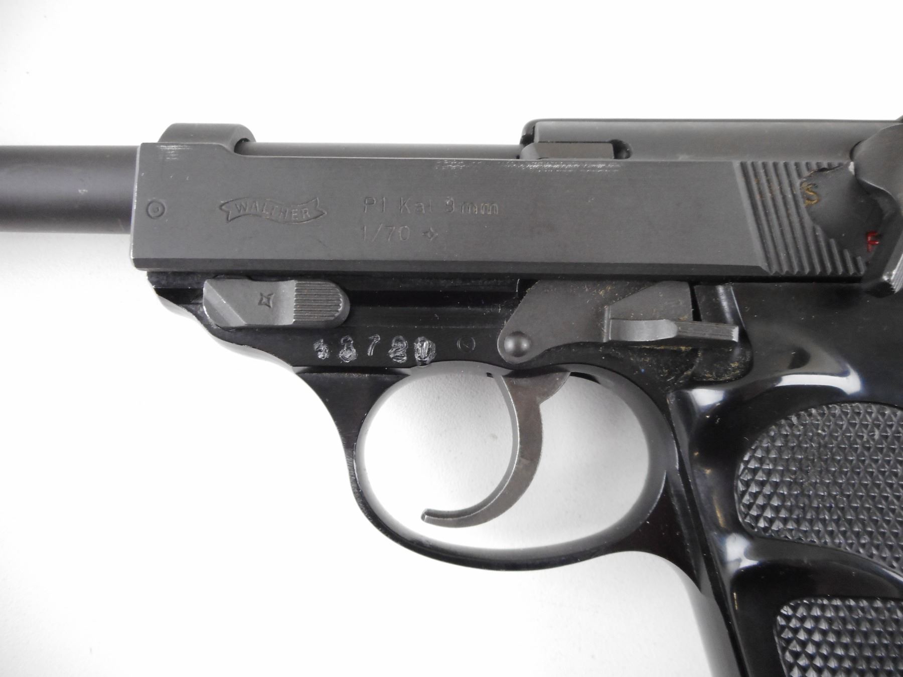 WALTHER , MODEL: P1 , CALIBER: 9MM LUGER , COMES WITH MAGAZINE. BORE IS VERY GOOD. BLADE FRONT AND FIXED REAR SIGHTS. TWO PIECE CHECKERED BLACK PLASTIC GRIP PANELS. MATTE GREY FINISH. SHOWS SOME HANDLING MARKS. ACTION: SEMI-AUTOMATIC HANDGUN , BARREL LENGTH: 121MM , SERIAL # 43721 , CONDITION: 7/10 , CLASS: CANADIAN RESTRICTED CLASS