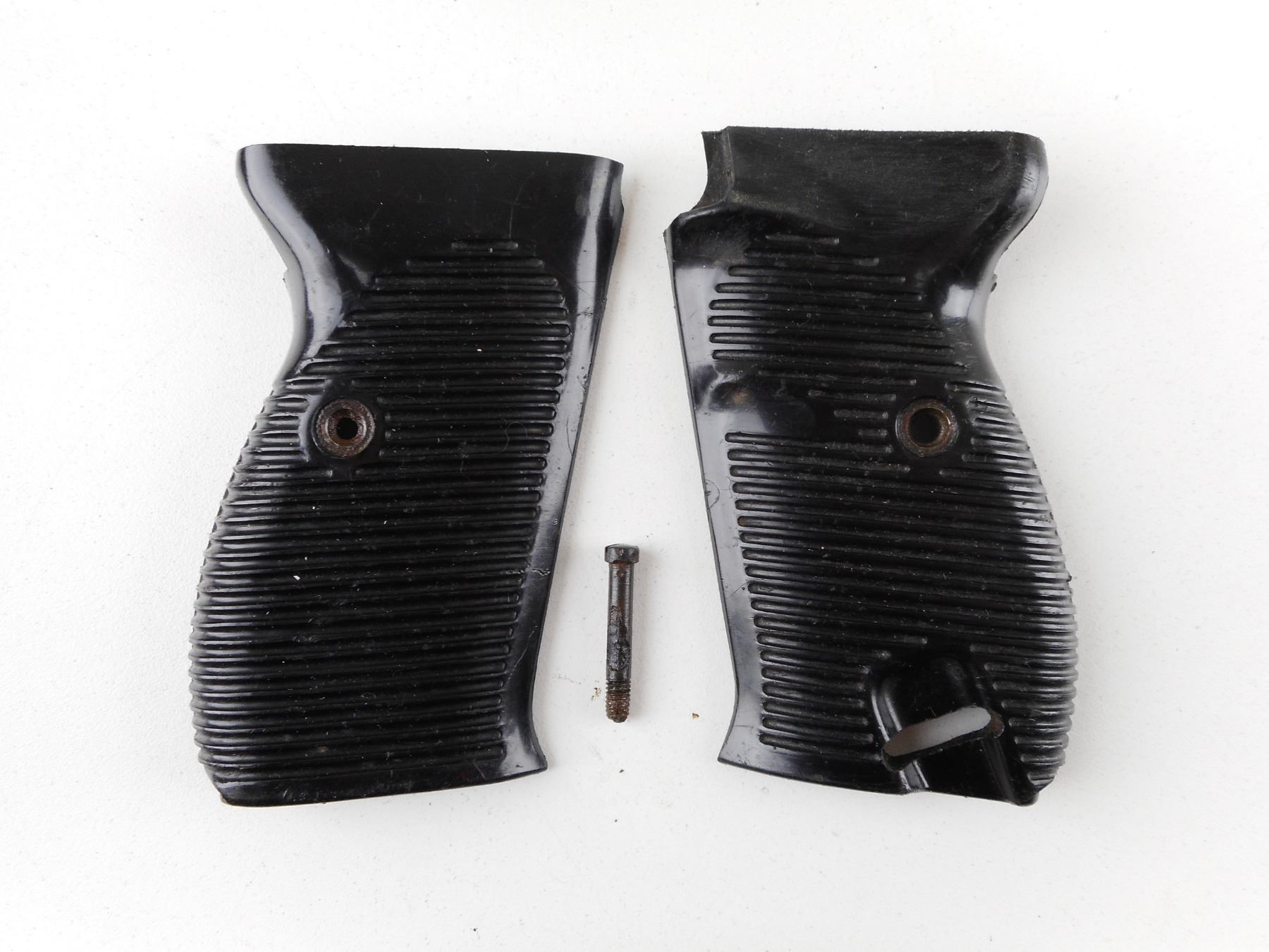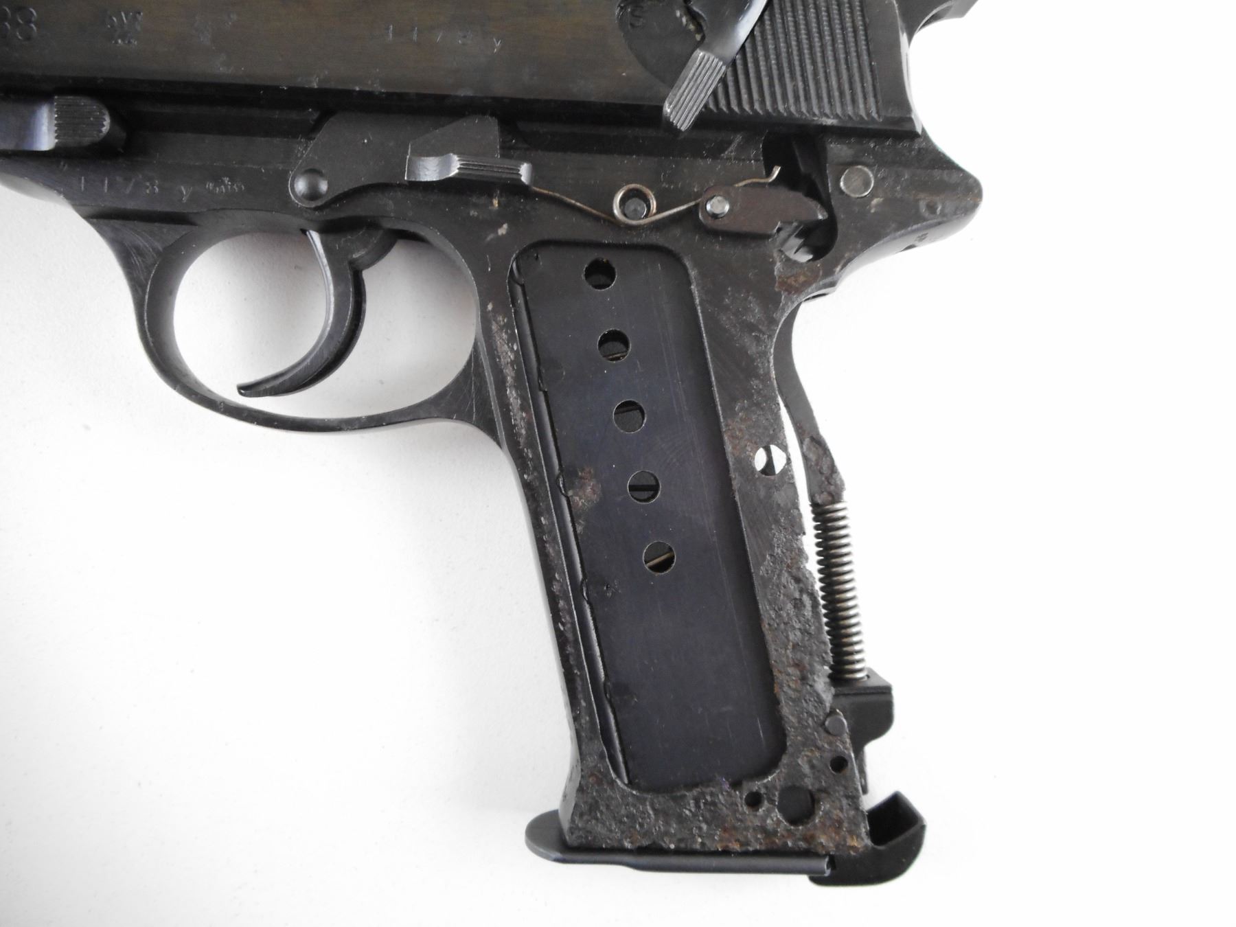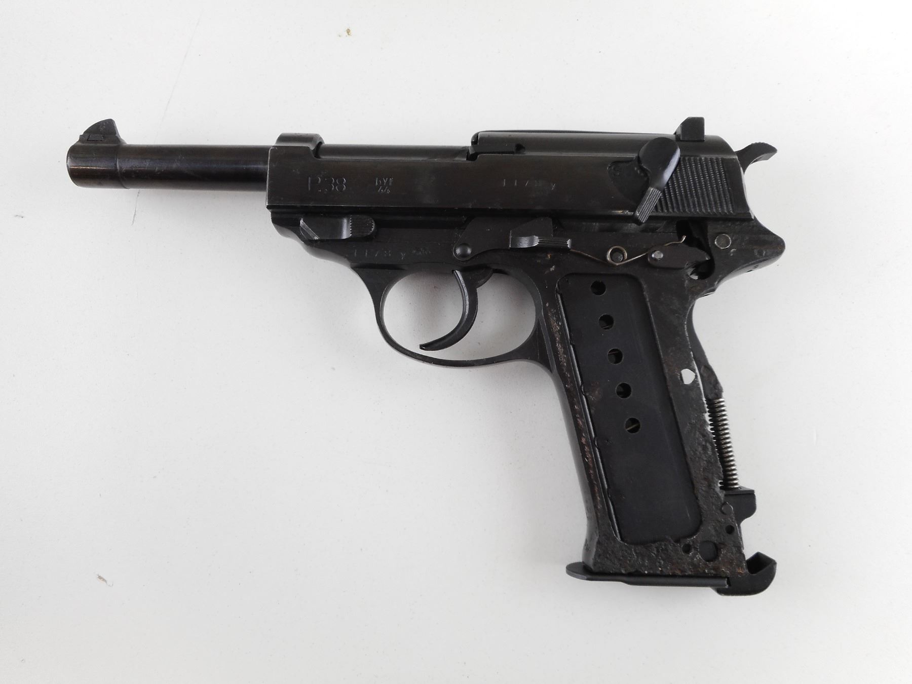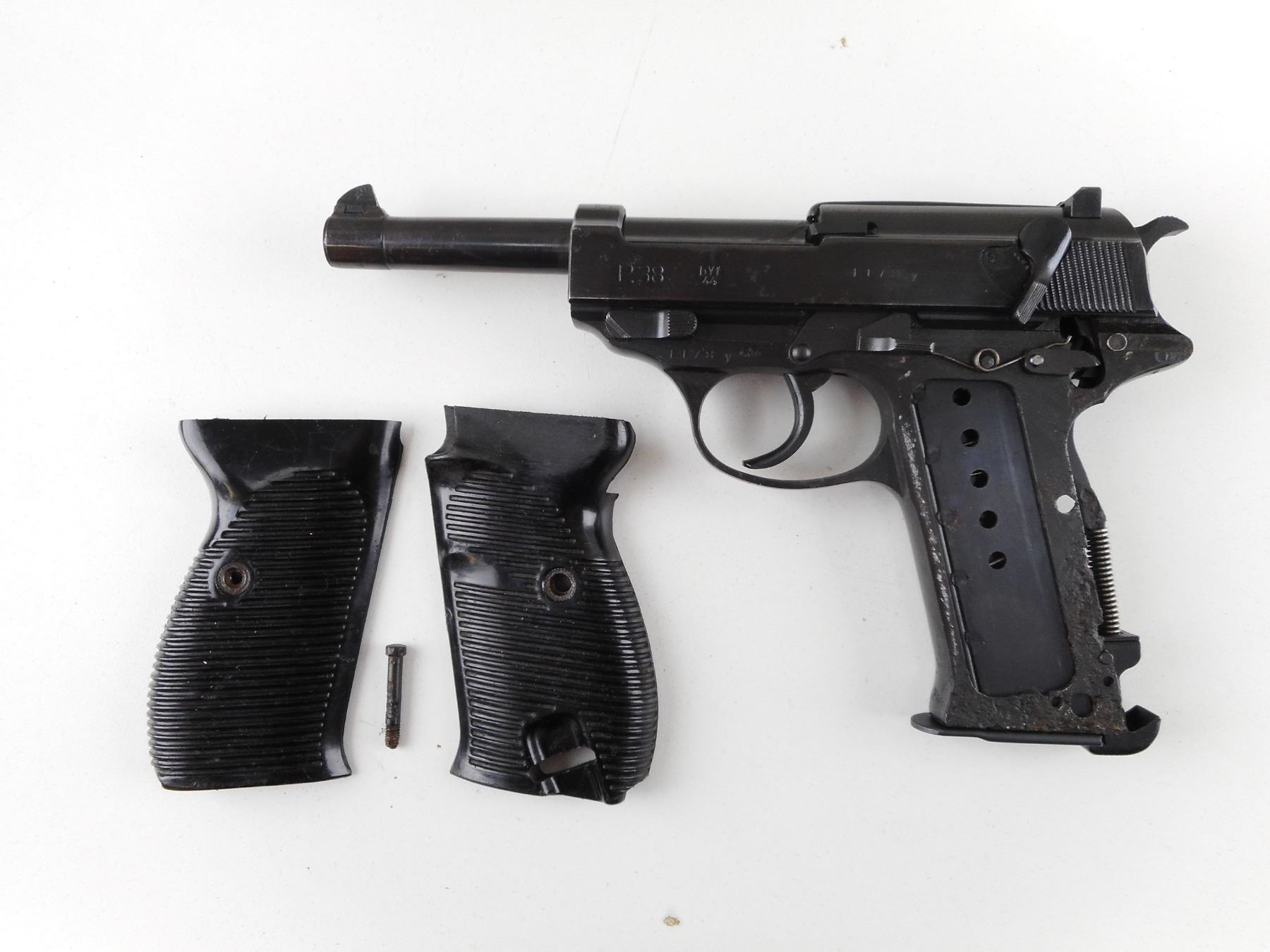 WWII ERA, WALTHER , MODEL: P38 , CALIBER: 9MM LUGER , MARKED BYF44, IT IS A MAUSER 1944. NUMEROUS GERMAN MILITARY MARKINGS AND WAFFEN AMPS. GOOD BORE. BLADE FRONT AND FIXED REAR SIGHTS. BARREL, SLIDE AND RECEIVER ARE MATCHING BY SERIAL#. DETACHED SYNTHETIC GRIP PANELS. EXTREMLEY PITTED RECEIVER FRAME. SHOWS SOME HANDLING MARKS. ACTION: SEMI-AUTOMATIC HANDGUN , BARREL LENGTH: 123MM , SERIAL # 1178Y , CONDITION: 4/10 , CLASS: CANADIAN RESTRICTED CLASS