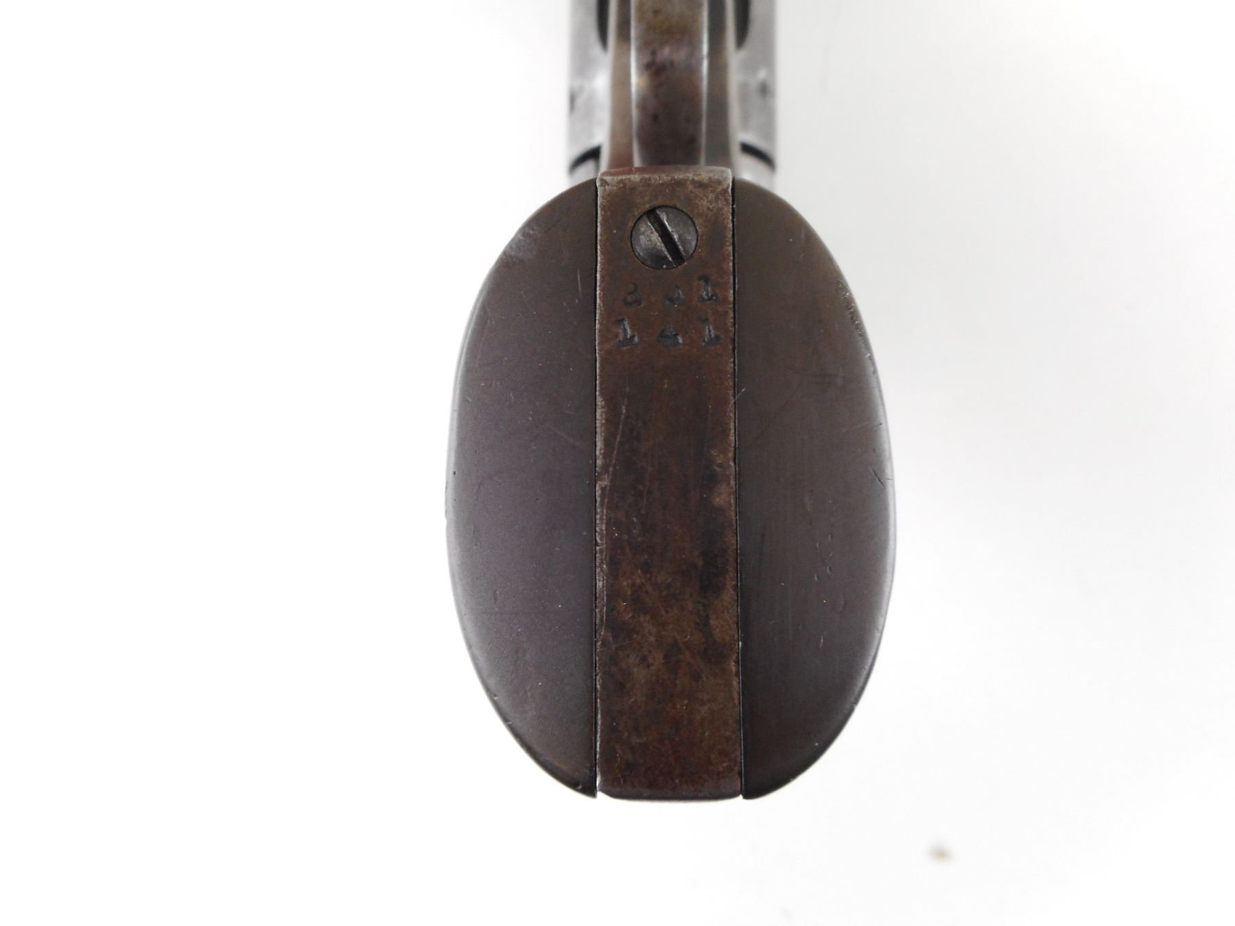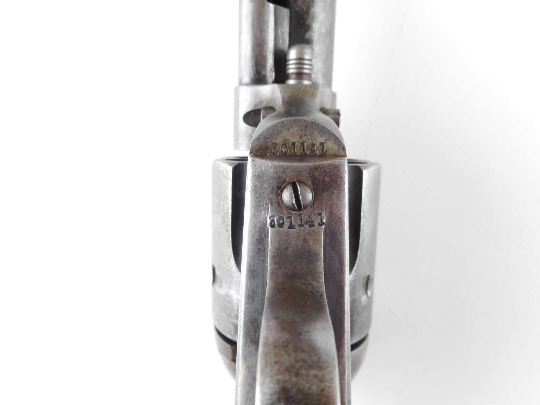 COLT , MODEL: BISLEY , CALIBER: 38 WCF , 6 SHOT CAPACITY, BORE IS GOOD. MANUFACTURED BETWEEN 1894 AND 1915. HOLDS COCK, INDEXES WELL, ACTION IS TIGHT. BLADE FRONT AND NOTCH REAR SIGHT. CHECKERED TWO PIECE BROWN GRIP PANELS WITH COLT LOGO. SOME LIGHT SURFACE DISCOLOURATION. OVERALL BROWN FINISH. SHOWS SOME HANDLING MARKS. ACTION: REVOLVER , BARREL LENGTH: 190MM , SERIAL # 301141 , CONDITION: 6/10 , CLASS: CANADIAN RESTRICTED CLASS
