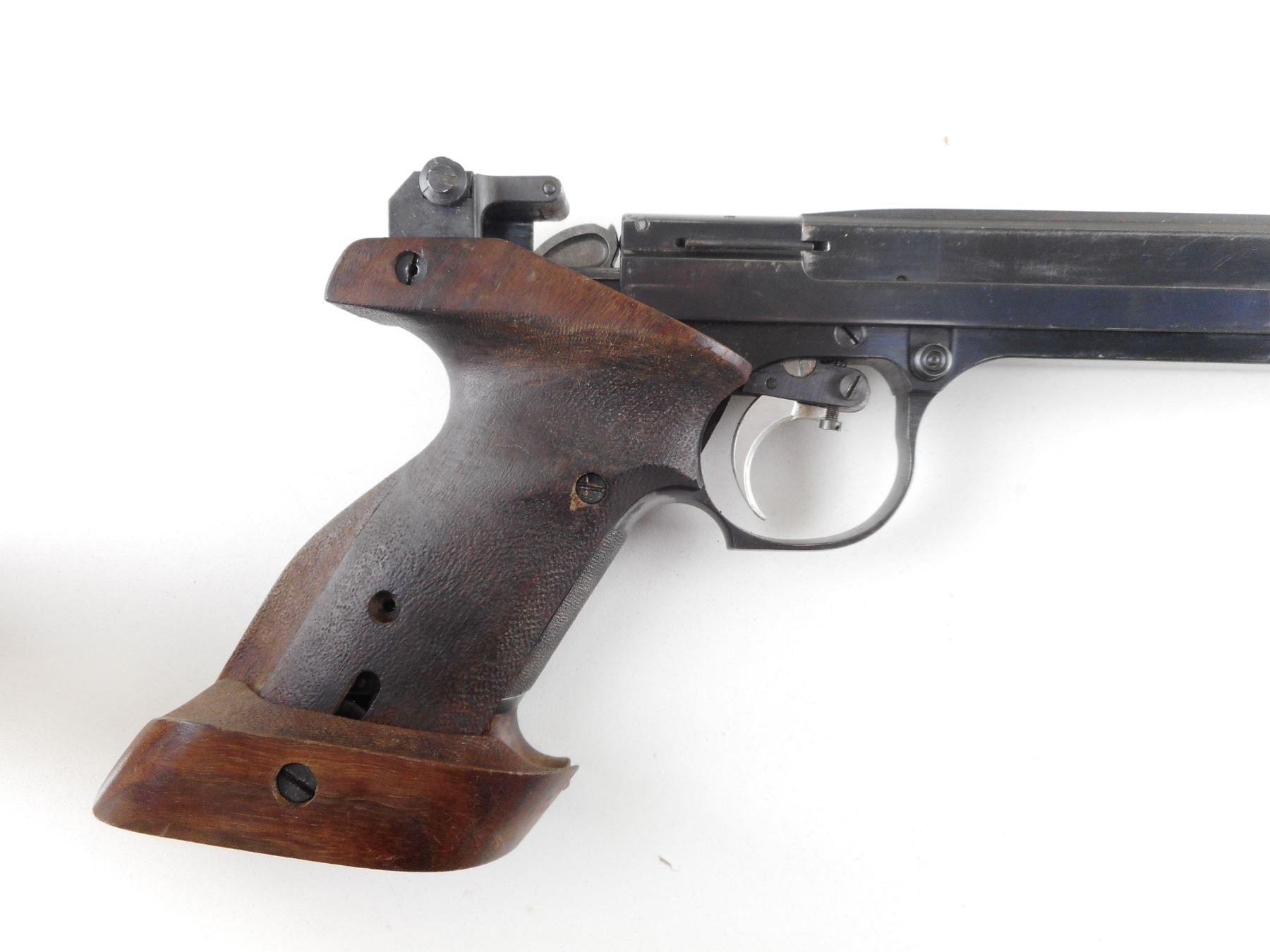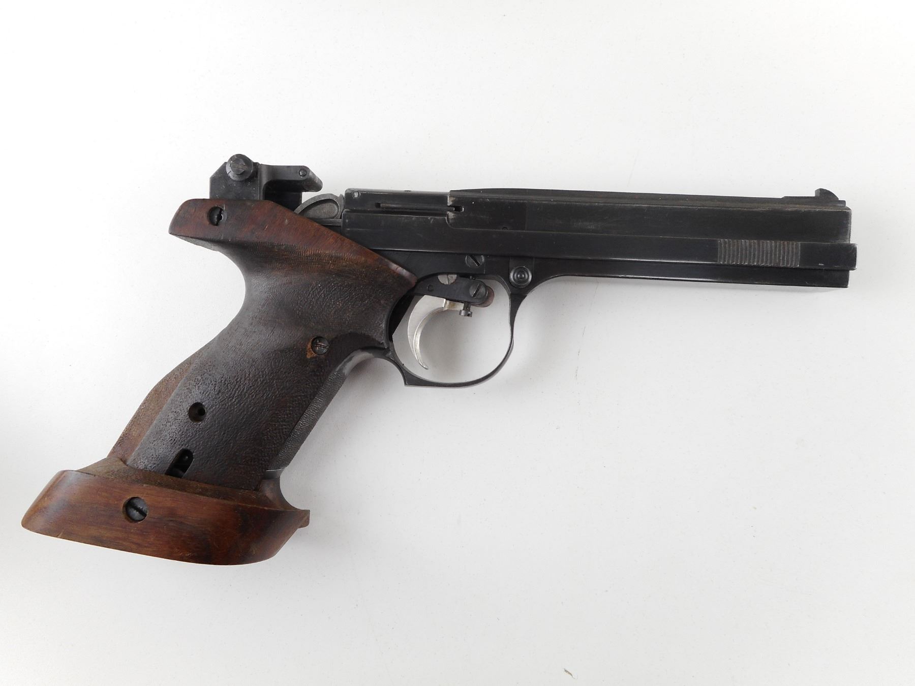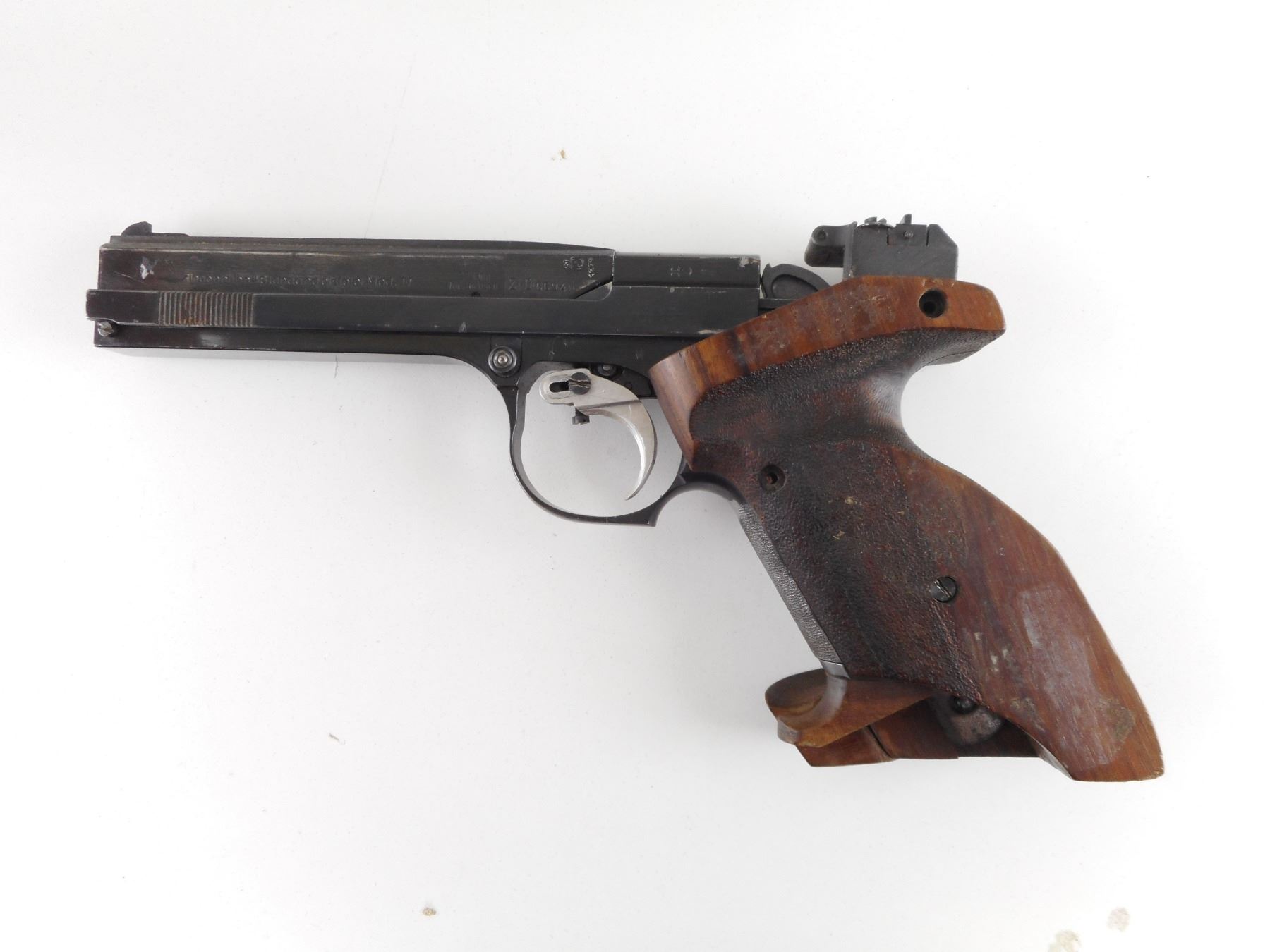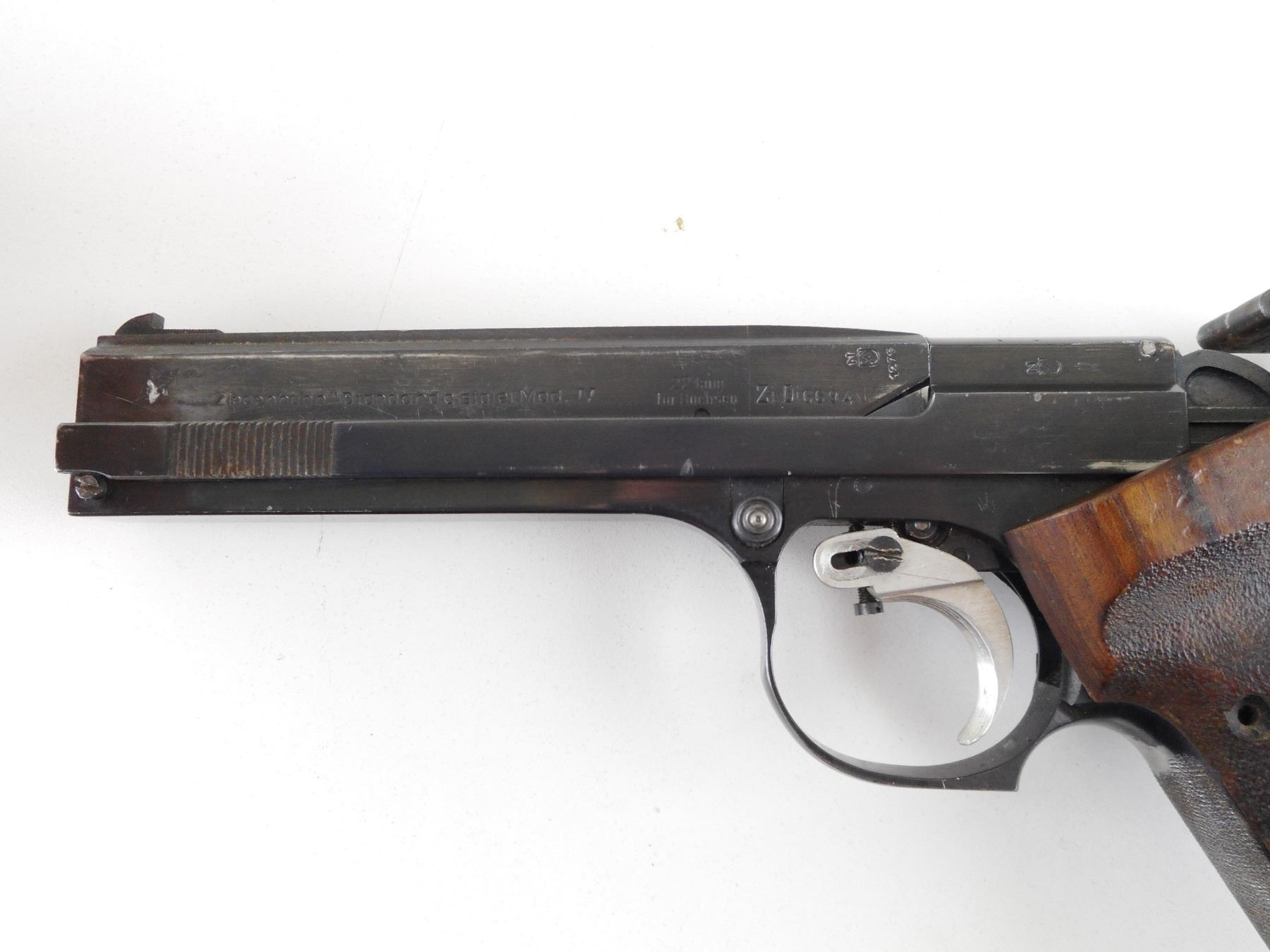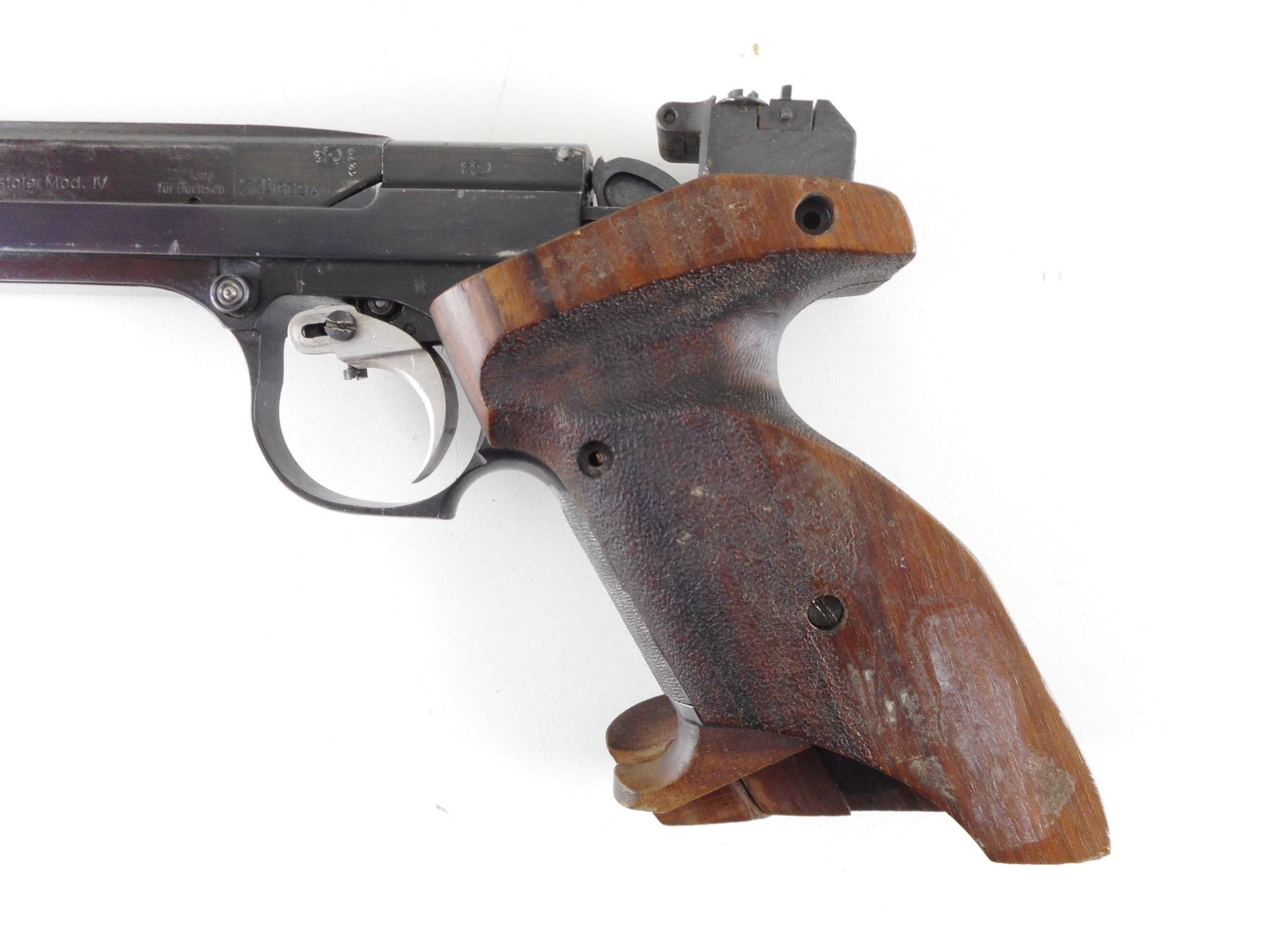 ZIEGENHAHN , MODEL: IV , CALIBER: 22 LR , COMES WITH MAGAZINE. BORE IS VERY GOOD. BLADE FRONT SIGHT AND ADJUSTABLE REAR SIGHT. STIPPLED WOOD GRIP PANELS THAT ARE FULLY ADJUSTABLE. SHOWS SOME HANDLING MARKS. ACTION: SEMI-AUTOMATIC HANDGUN , BARREL LENGTH: 152MM , SERIAL # 6694 , CONDITION: 6/10 , CLASS: CANADIAN RESTRICTED CLASS