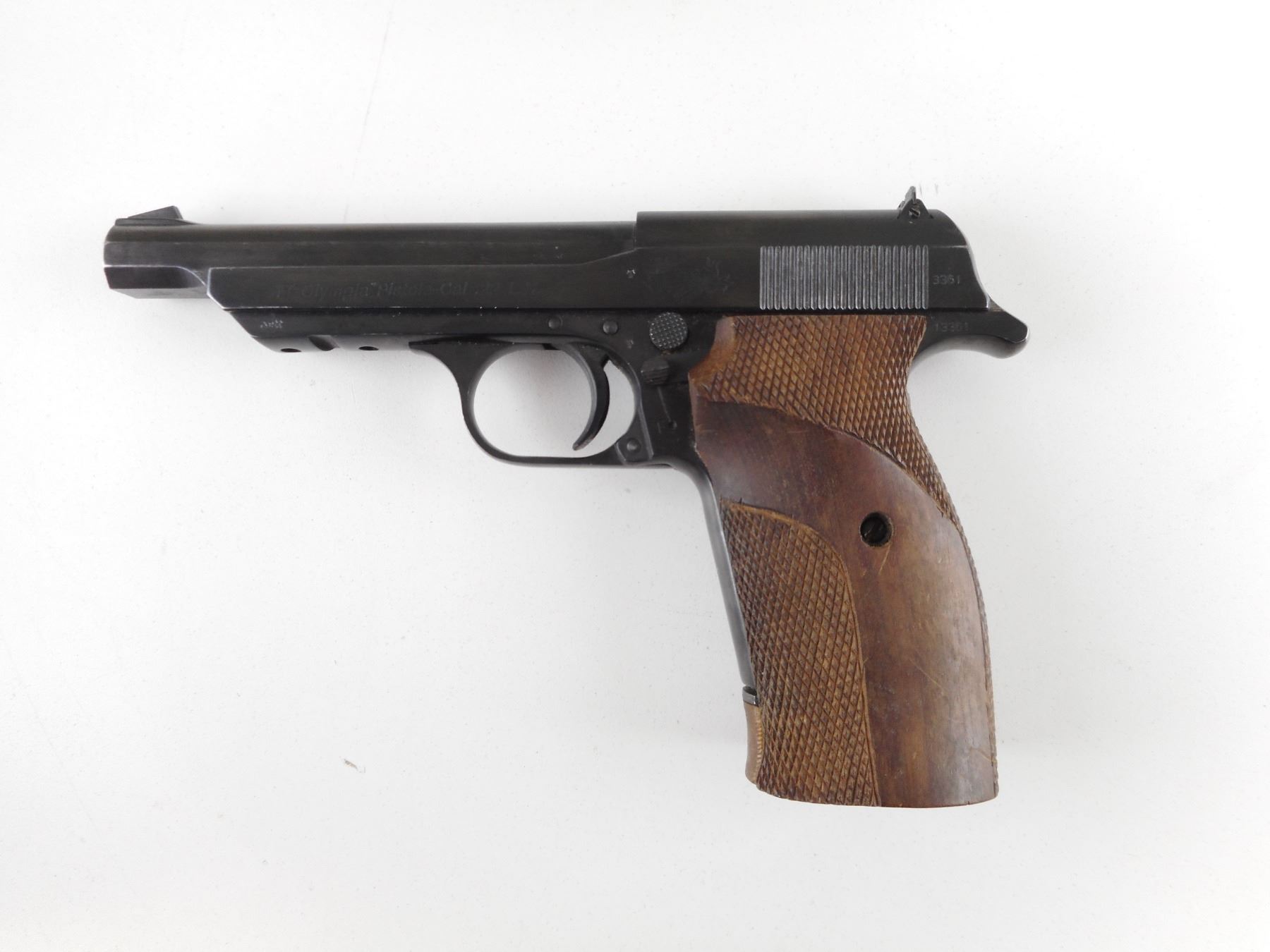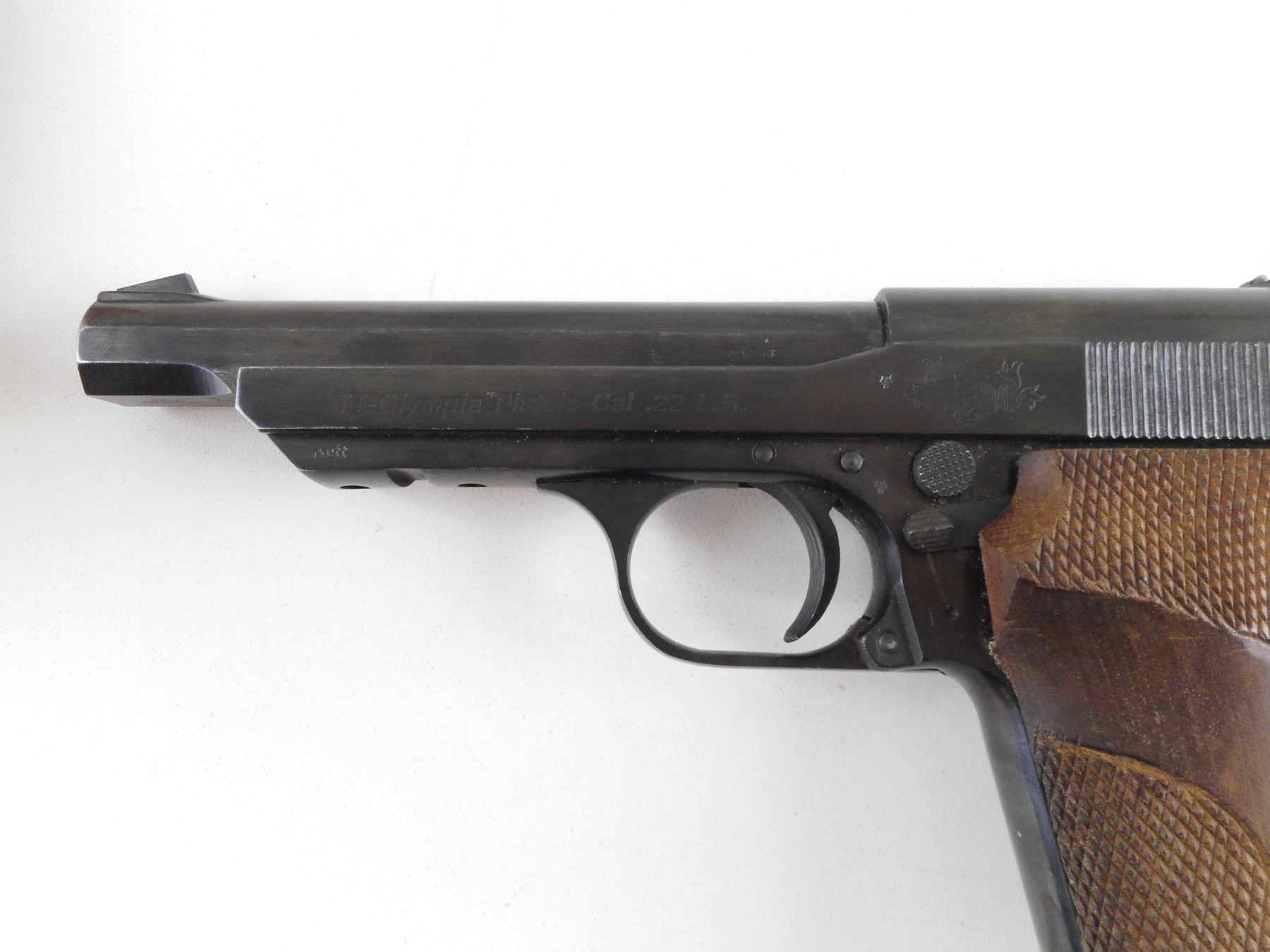 NORINCO , MODEL: TT OLYMPIA , CALIBER: 22 LR , COMES WITH MAGAZINE. BORE IS VERY GOOD. BLADE FRONT AND FIXED REAR SIGHTS. CHECKERED WOOD GRIP PANELS WITH THUMB REST. SHOWS SOME HANDLING MARKS. ACTION: SEMI-AUTOMATIC HANDGUN , BARREL LENGTH: 118MM , SERIAL # 3361 , CONDITION: 5/10 , CLASS: CANADIAN RESTRICTED CLASS