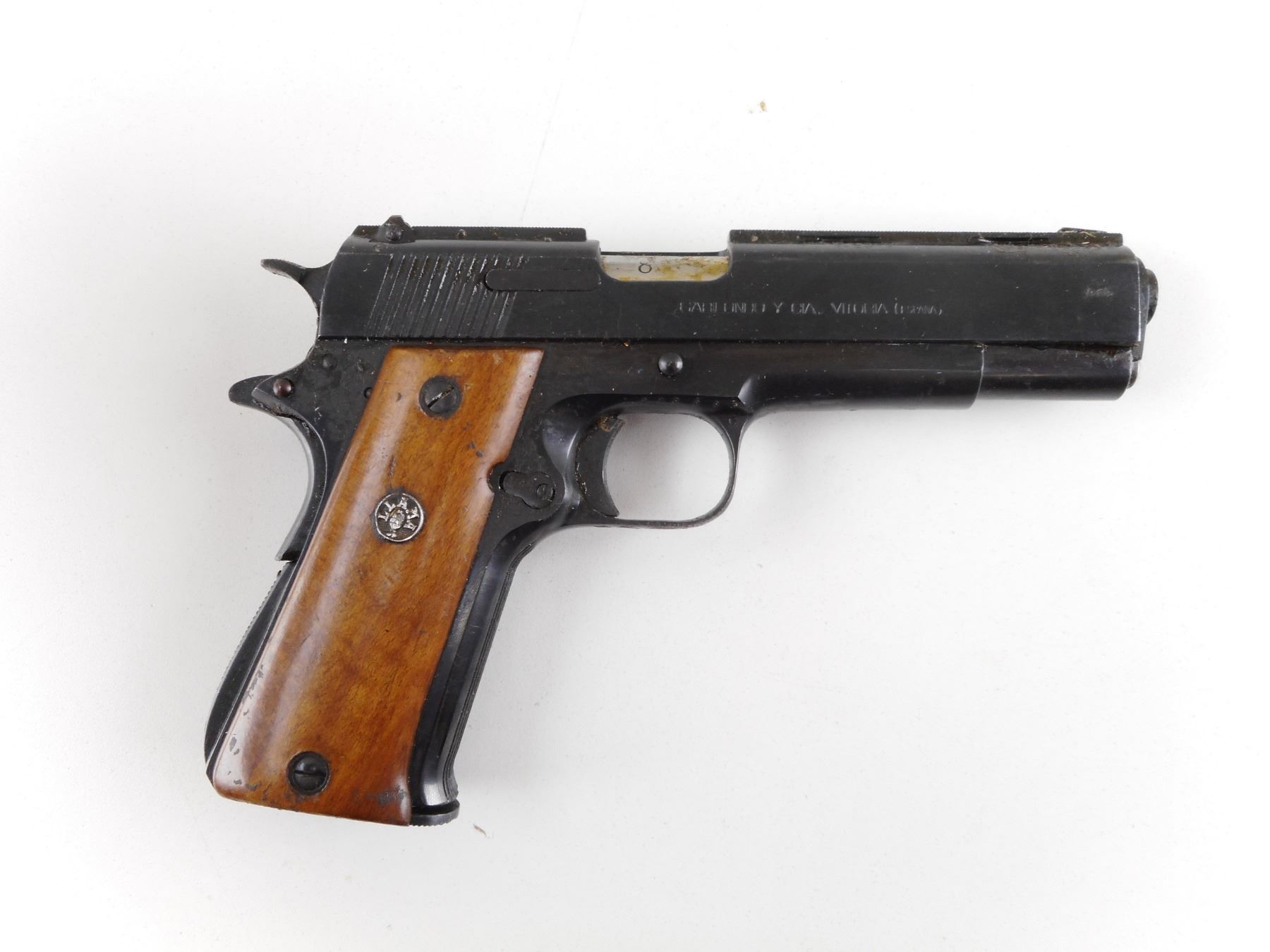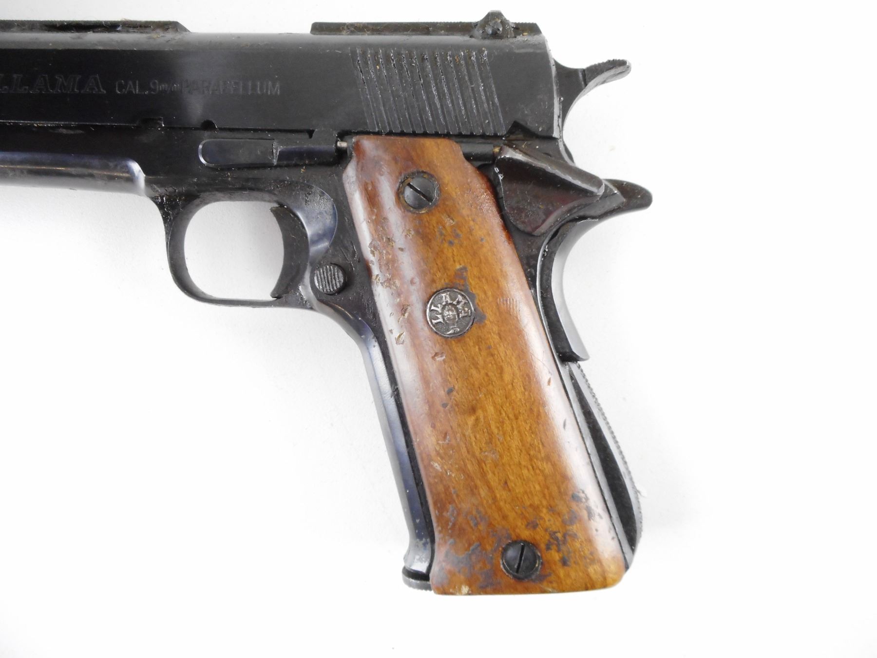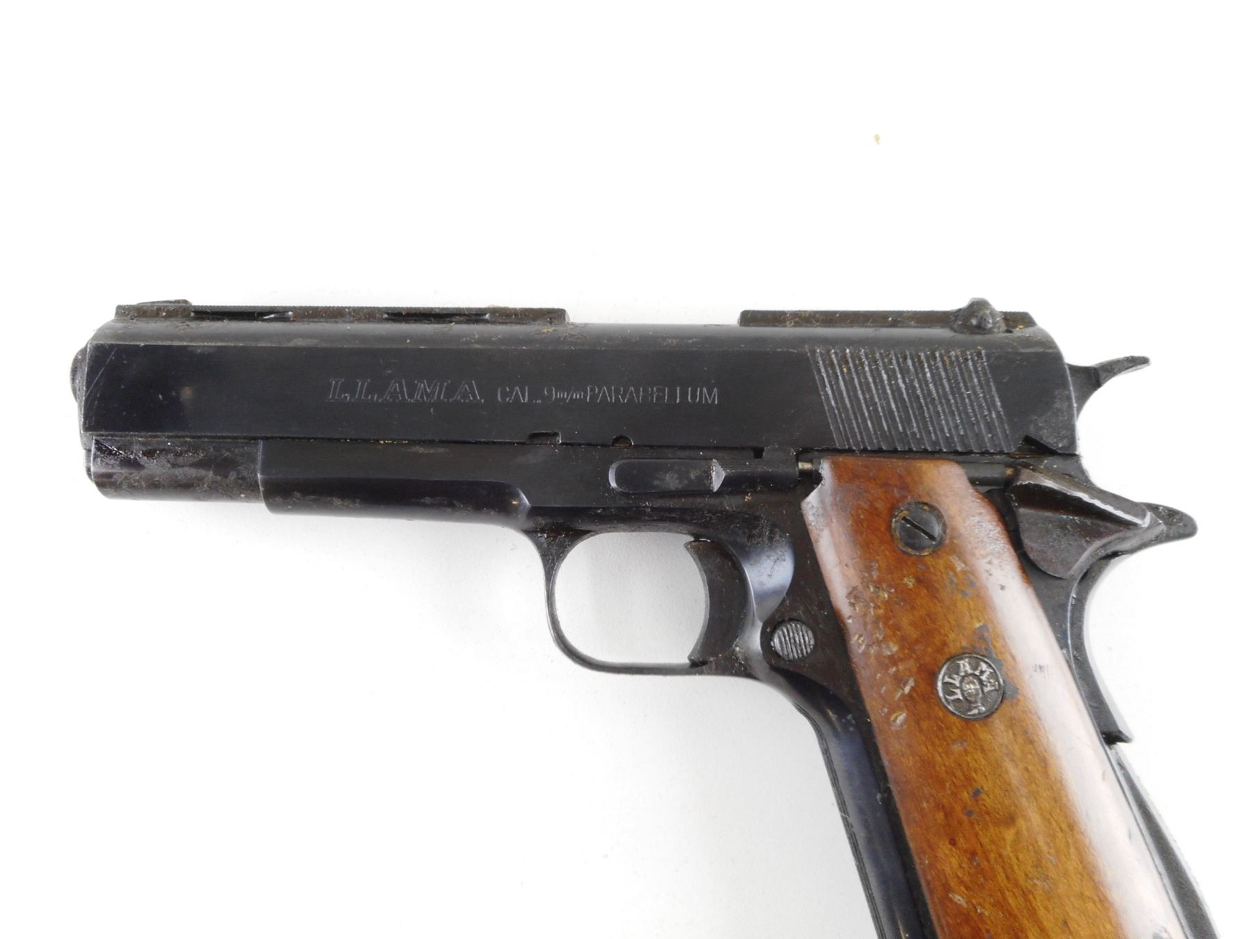 LLAMA , MODEL: IX A , CALIBER: 9MM LUGER , COMES WITH MAGAZINE. BORE IS GOOD. BLADE FRONT SIGHT ON A VENTED RIB BARREL. FIXED REAR SIGHT. TWO PIECE HARDWOOD GRIPS WITH LLAMA LOGO. COVERED WITH A THICK LAYER OF GREASE. SHOWS SOME HANDLING MARKS. ACTION: SEMI-AUTOMATIC HANDGUN , BARREL LENGTH: 127MM , SERIAL # 918683 , CONDITION: 7/10 , CLASS: CANADIAN RESTRICTED CLASS