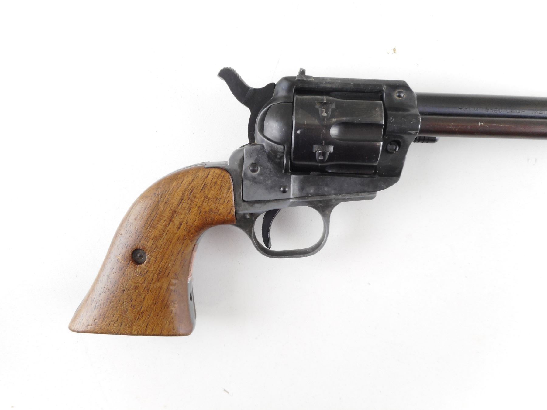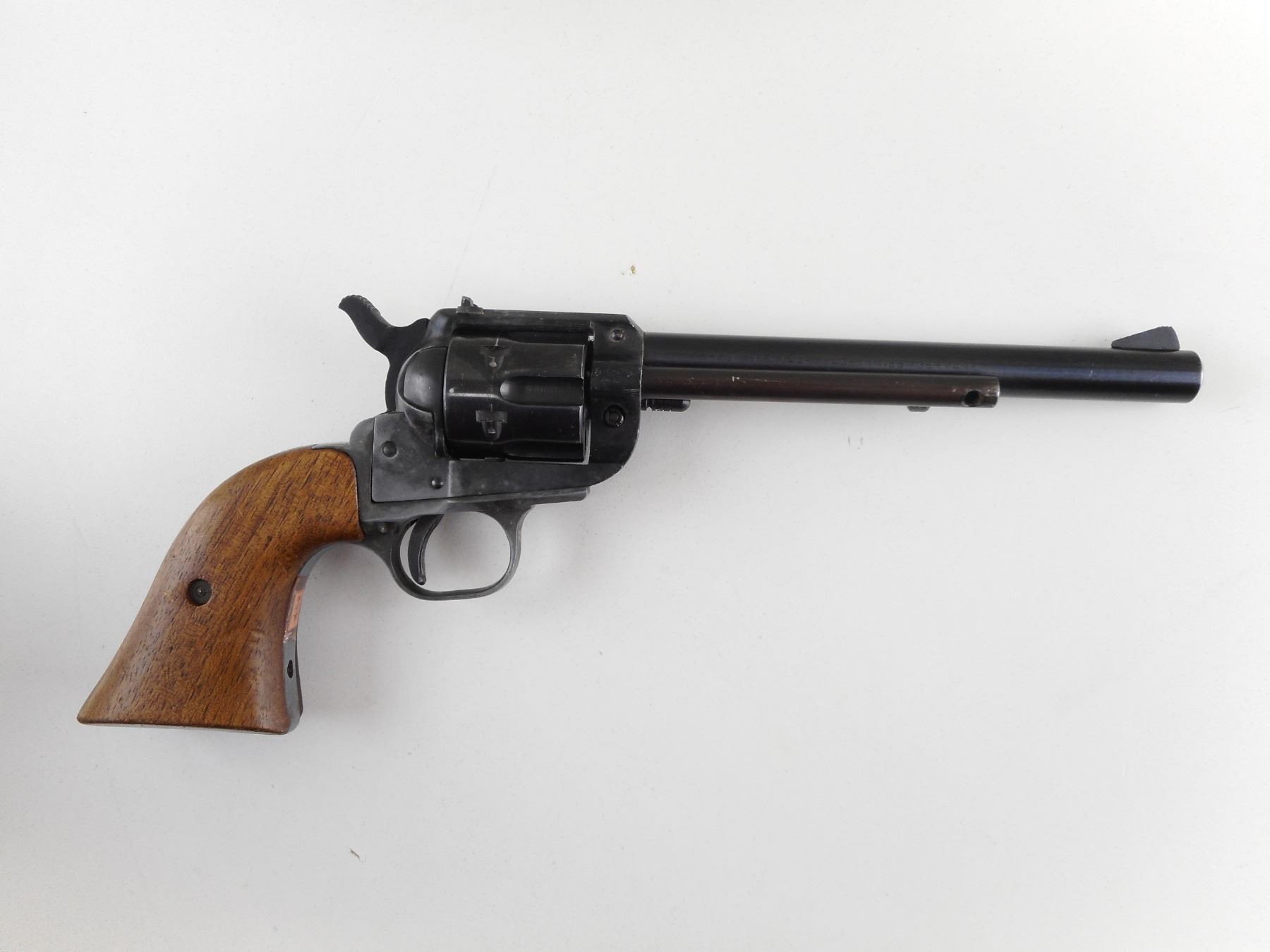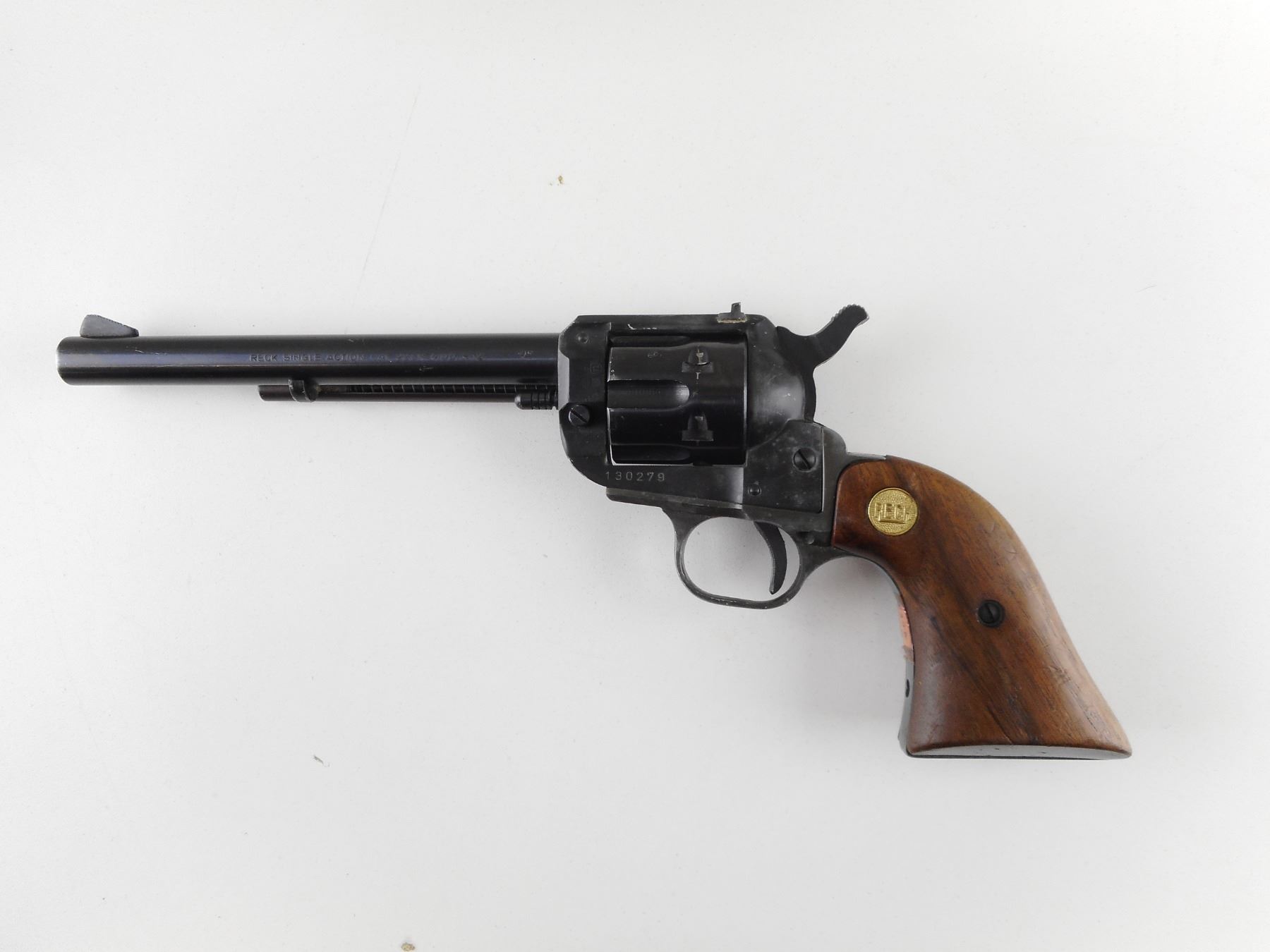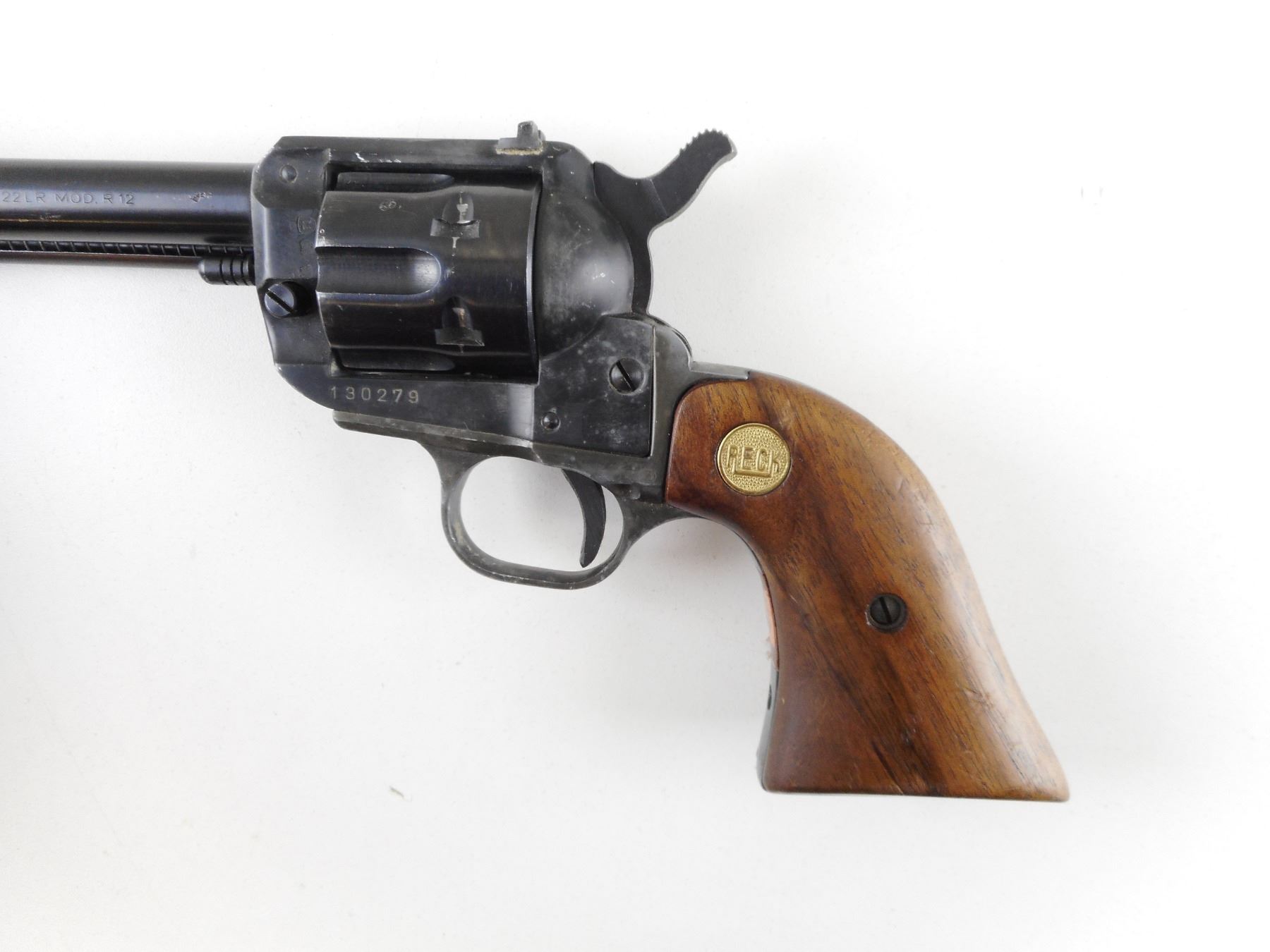 RECK , MODEL: R12 , CALIBER: 22 LR , 6 SHOT CAPACITY. HOLDS COCK, INDEXES WELL, ACTION IS TIGHT. WORKS ONLY IN THE SINGLE ACTION. BORE IS EXCELLENT. BLADE FRONT AND RAISED NOTCH REAR SIGHT. TWO PIECE HARDWOOD GRIPS. SHOWS SOME HANDLING MARKS ACTION: REVOLVER , BARREL LENGTH: 166MM , SERIAL # 130279 , CONDITION: 7/10 , CLASS: CANADIAN RESTRICTED CLASS