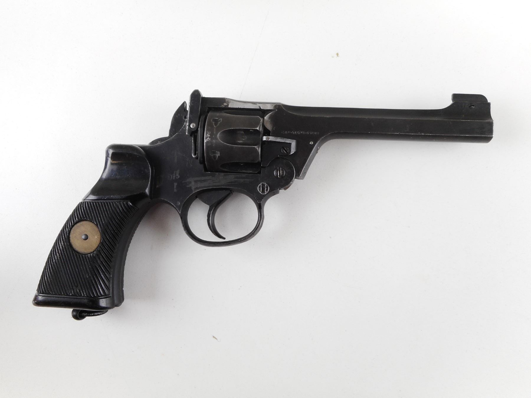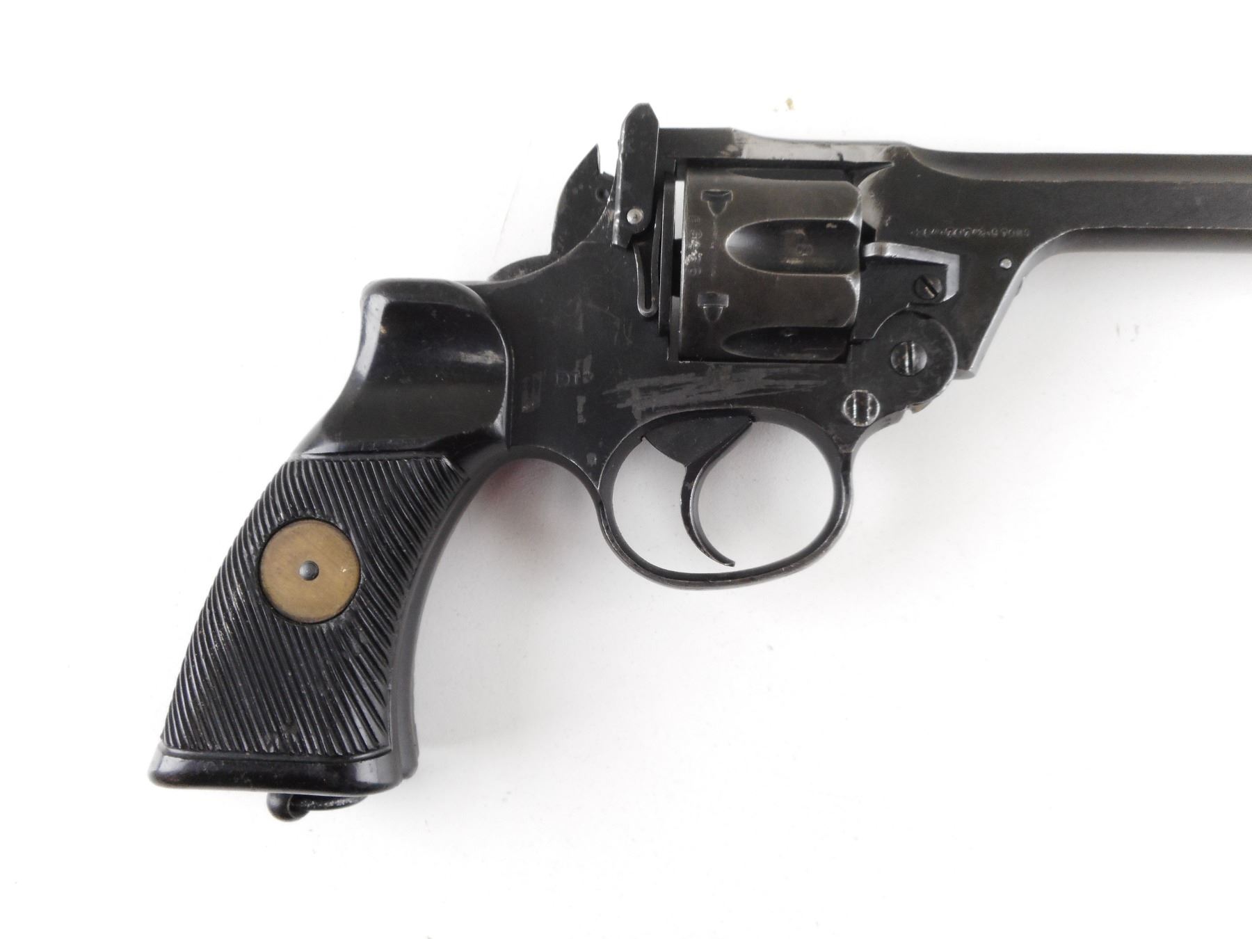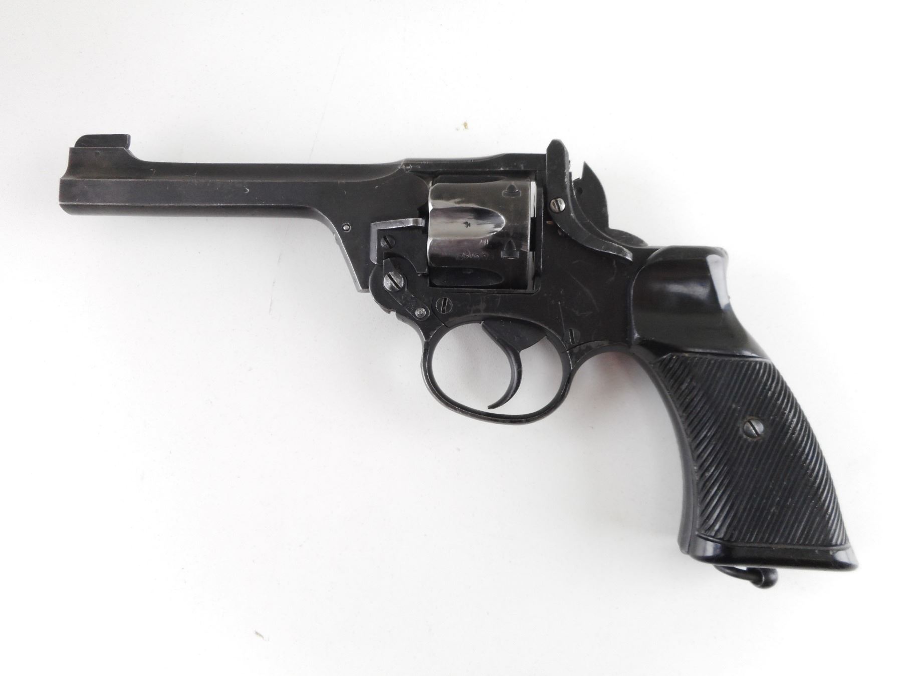 ENFIELD , MODEL: NO 2 MARK I , CALIBER: 38 S&W , BORE IS VERY GOOD. NUMEROUS MILITARY MARKS AND BRD ARROW, DATED 1941. DOUBLE ACTION ONLY. INDEXES WELL. TWO PIECE BROWN PLASTIC GRIPS WITH LANYARD LOOP. SHOWS SOME DISCOLOURATION OF THE CYLINDER. BLADE FRONT AND NOTCH REAR SIGHTS. ACTION: REVOLVER , BARREL LENGTH: 127MM , SERIAL # P9466 , CONDITION: 5/10 , CLASS: CANADIAN RESTRICTED CLASS