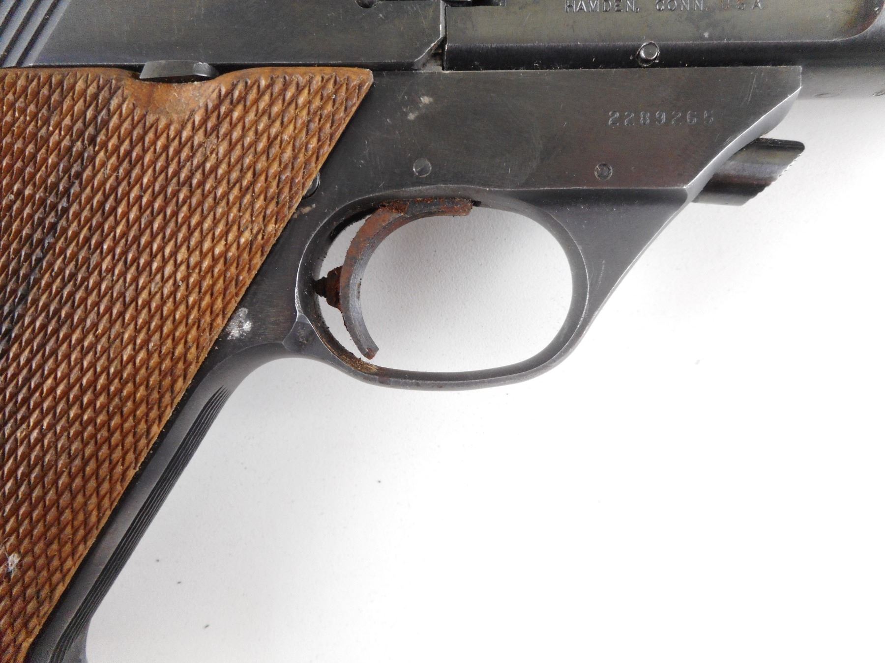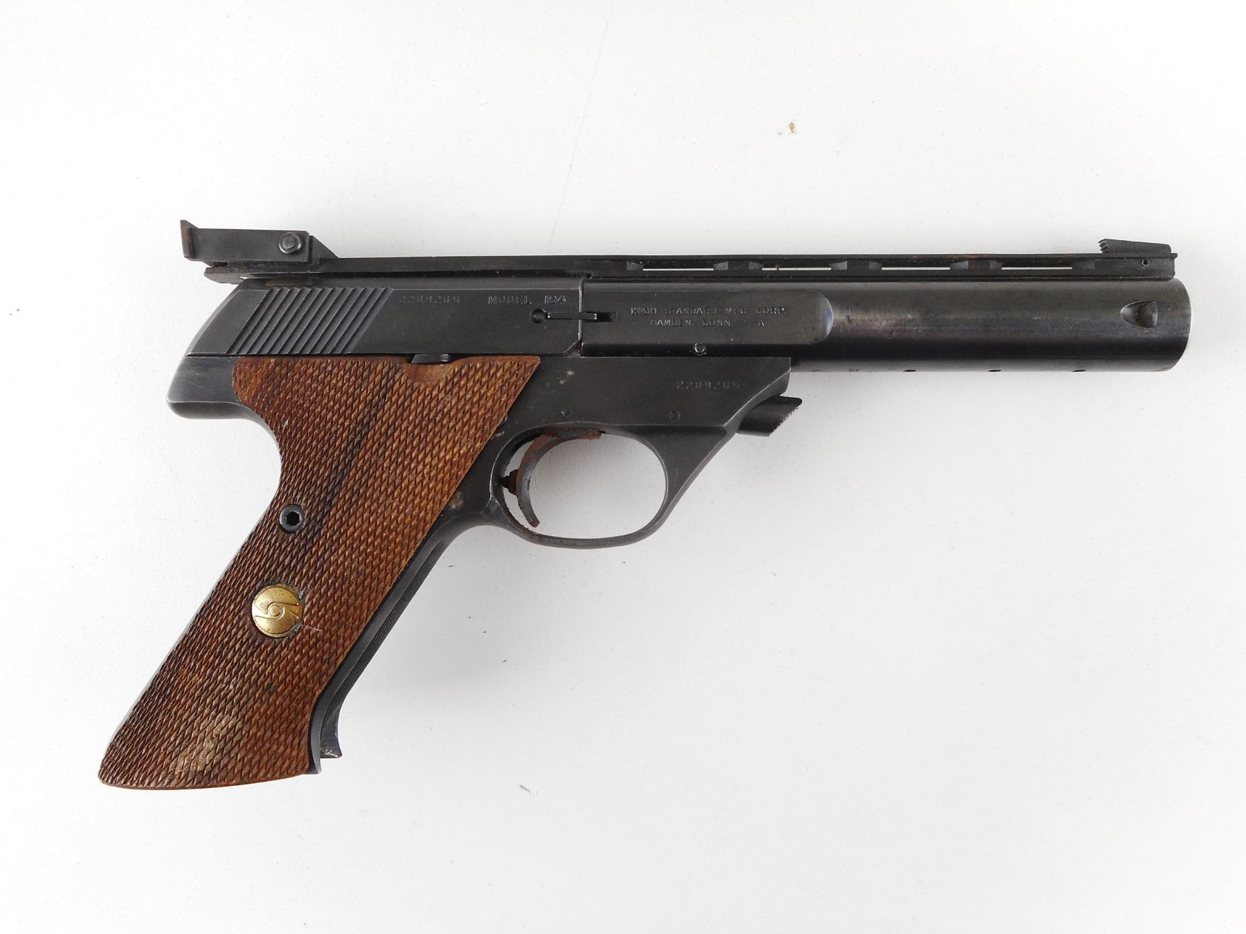 HIGH STANDARD , MODEL: SUPERMATIC CITATION 104 , CALIBER: 22 LR , DOES NOT COME WITH MAGAZINE. BORE IS GOOD. BLADE FRONT AND ADJUSTABLE REAR SIGHT ON A VENTED RIB BARREL. CHECKERED TWO PIECE HARDWOOD GRIPS WITH HIGH STANDARD LOGO. SOME LIGHT SURFACE RUST ON THE TRIGGER. SHOWS SOME HANDLING MARKS. ACTION: SEMI-AUTOMATIC HANDGUN , BARREL LENGTH: 140MM , SERIAL # 2289265 , CONDITION: 6/10 , CLASS: CANADIAN RESTRICTED CLASS