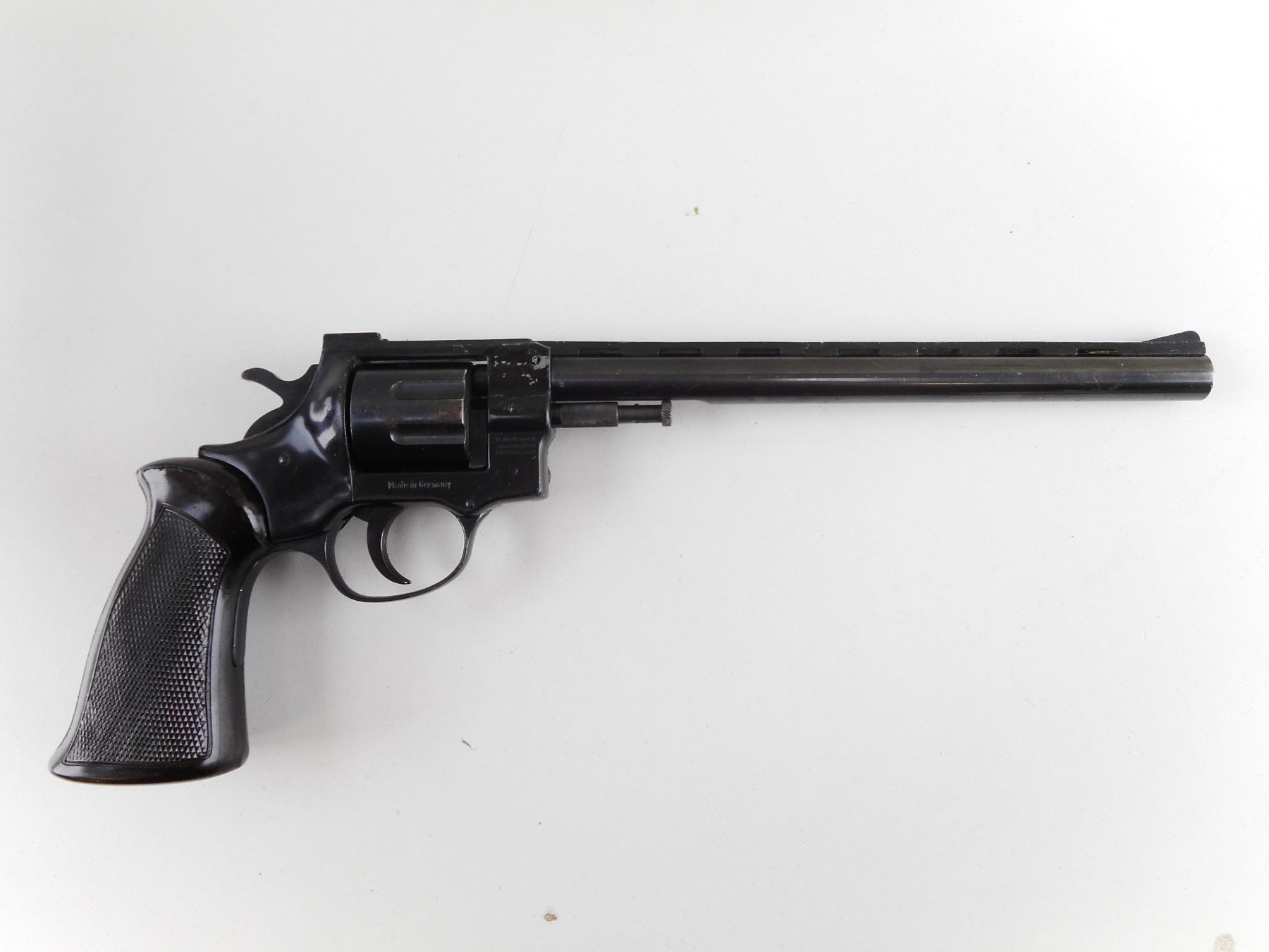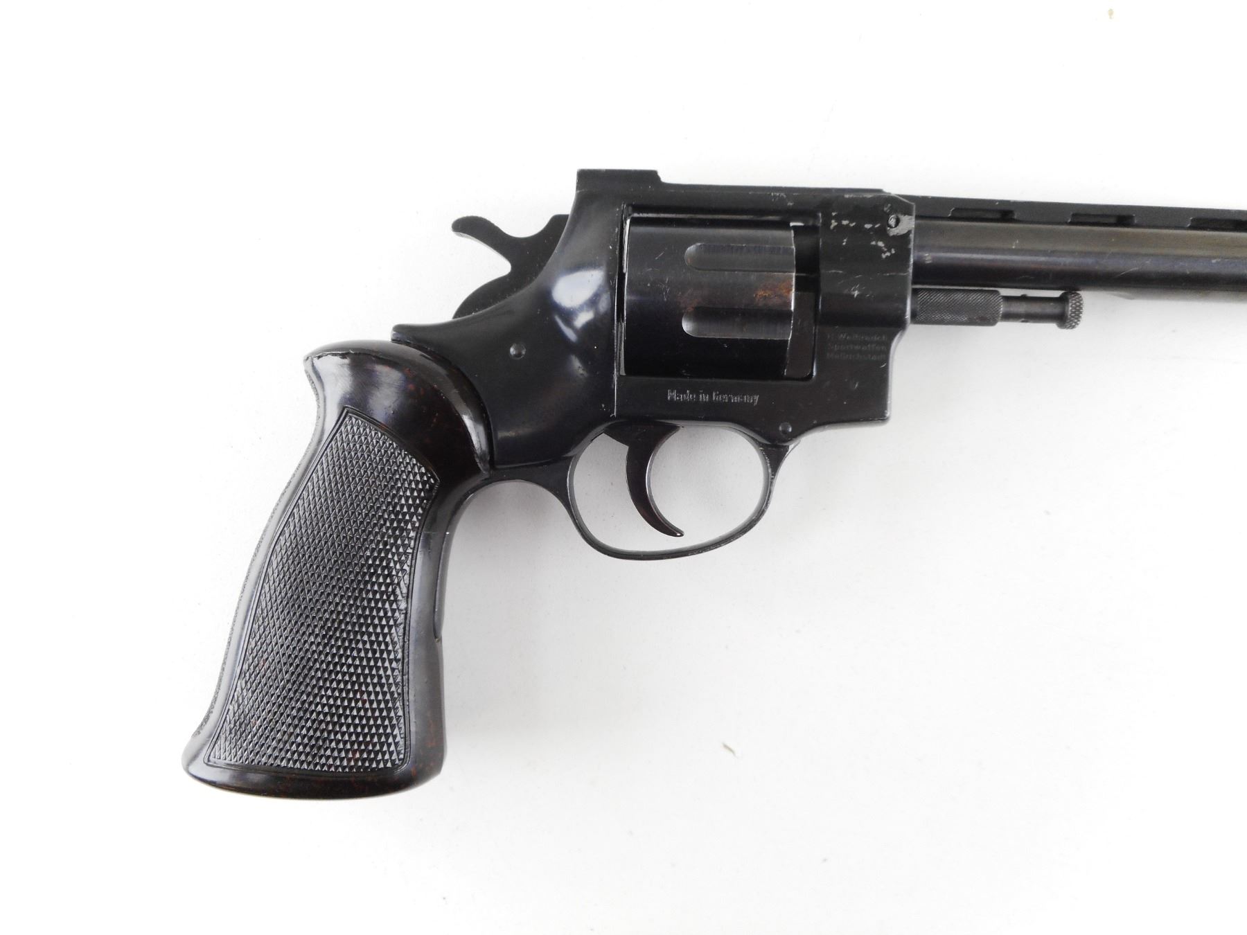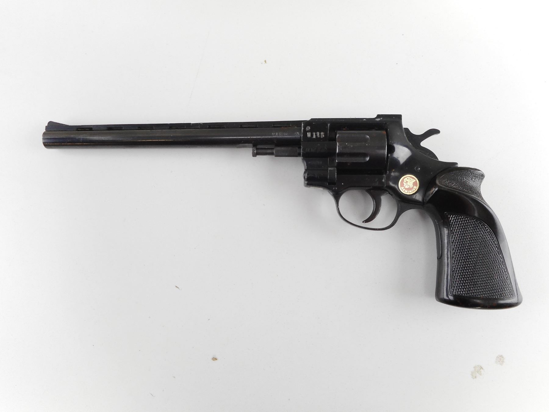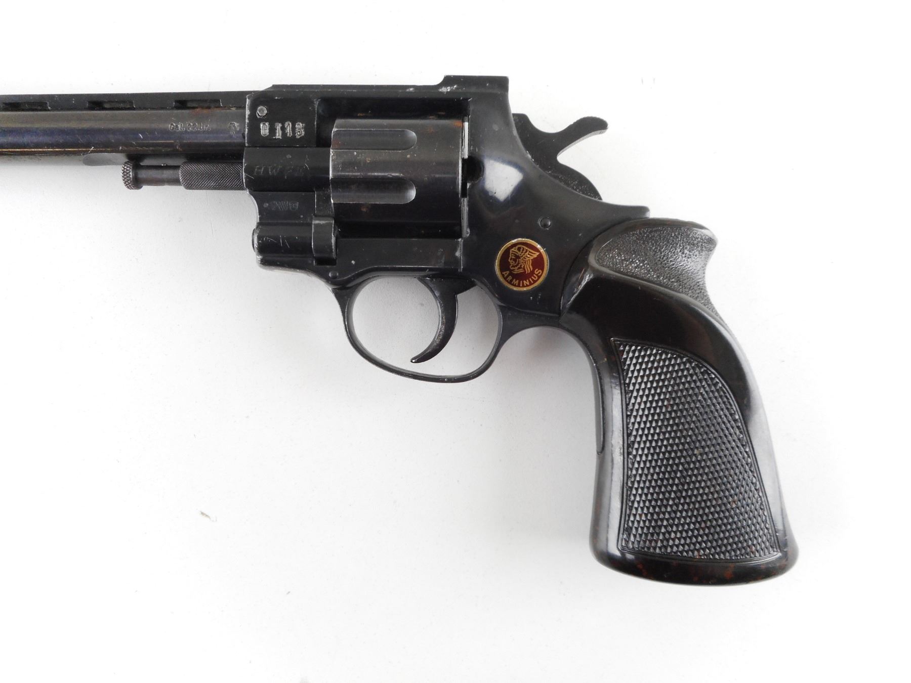 ARMINIUS , MODEL: HW7E , CALIBER: 22 LR , LOOKS LIKE A REVOLVER BUT HAS BEEN CONVERTED TO SINGLE SHOT. BORE IS VERY GOOD. RAMP FRONT SIGHT AND RAISED NOTCH REAR SIGHT ON A VENTED RIB BARREL. HOLDS COCK BUT DOES NOT INDEX. CHECKERED BROWN PLASTIC GRIP PANELS WITH THUMB REST. SHOWS SOME HANDLING MARKS. ACTION: CONVERTED TO SINGLE SHOT , BARREL LENGTH: 230MM , SERIAL # 0113 , CONDITION: 5/10 , CLASS: CANADIAN RESTRICTED CLASS