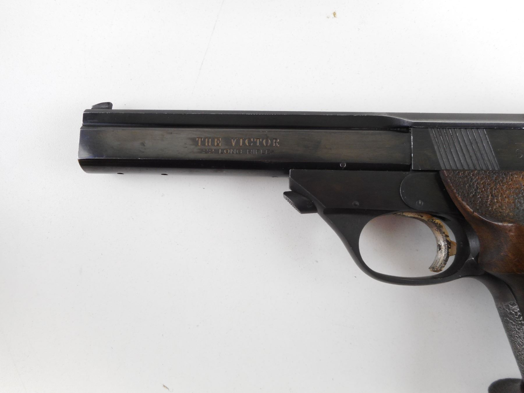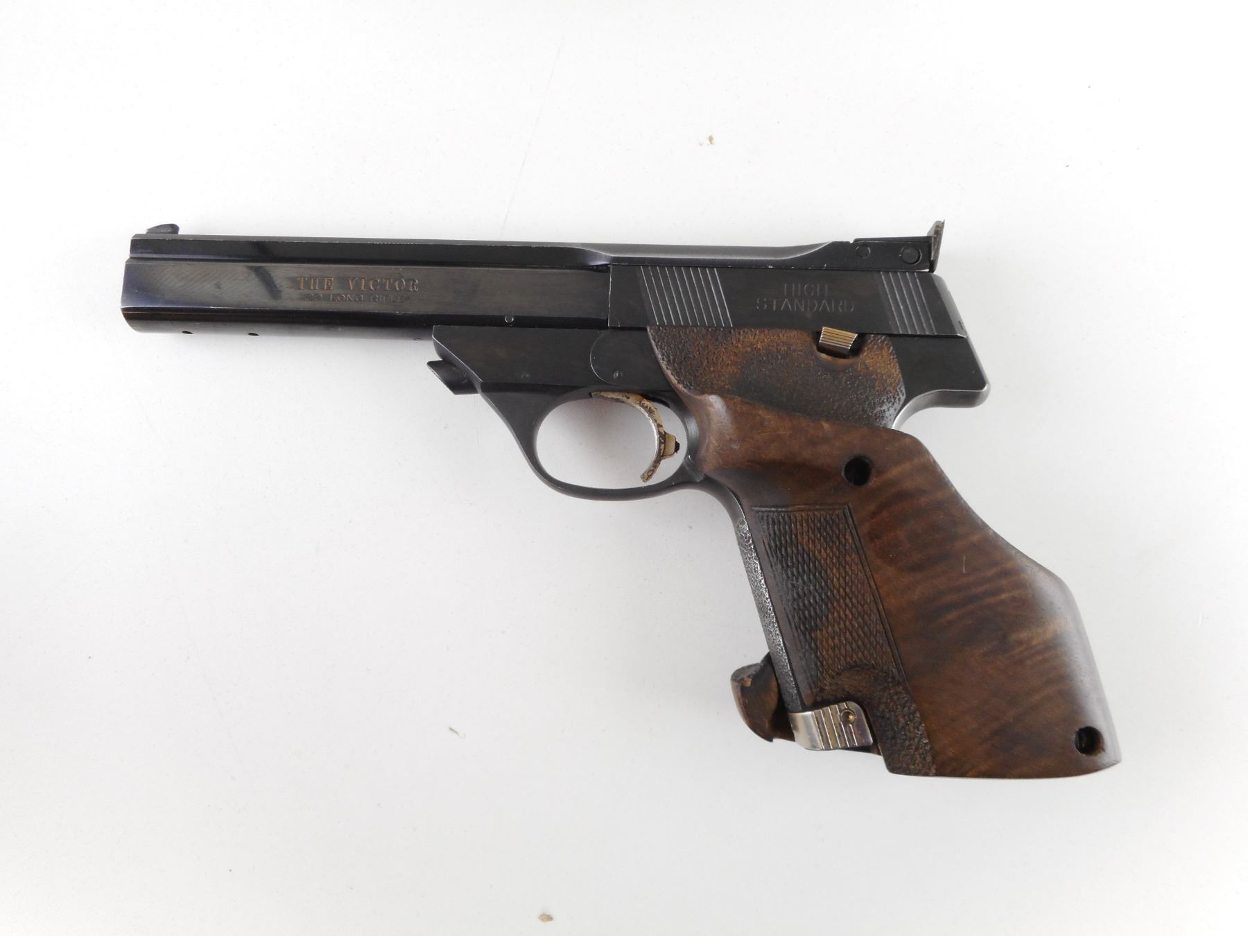 HIGH STANDARD , MODEL: VICTOR , CALIBER: 22 LR , DOES NOT COME WITH MAGAZINE. BORE IS VERY GOOD. BLADE FRONT AND ADJUSTABLE REAR SIGHT. STIPPLED ERGONOMIC WOOD GRIP PANELS. SHOWS SOME HANDLING MARKS. ACTION: SEMI-AUTOMATIC HANDGUN , BARREL LENGTH: 140MM , SERIAL # ML09024 , CONDITION: 5/10 , CLASS: CANADIAN RESTRICTED CLASS