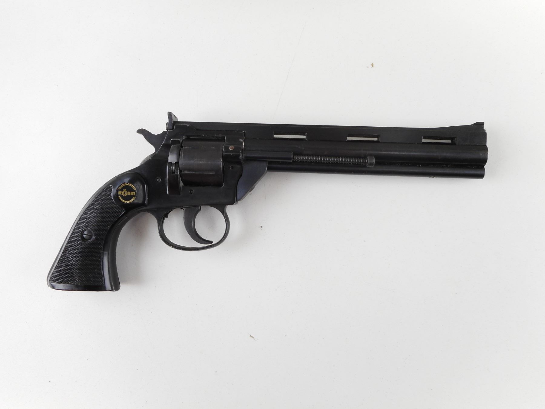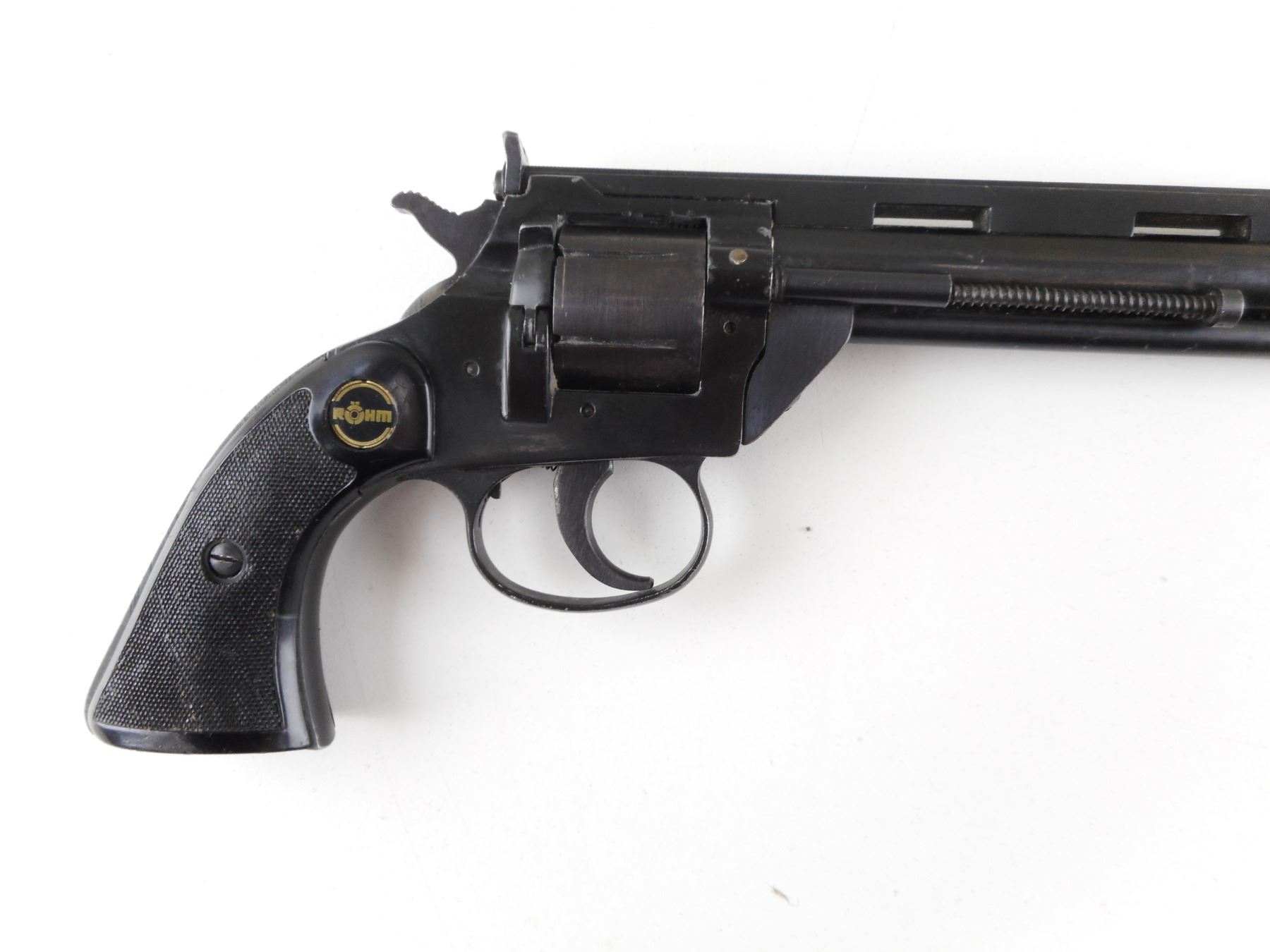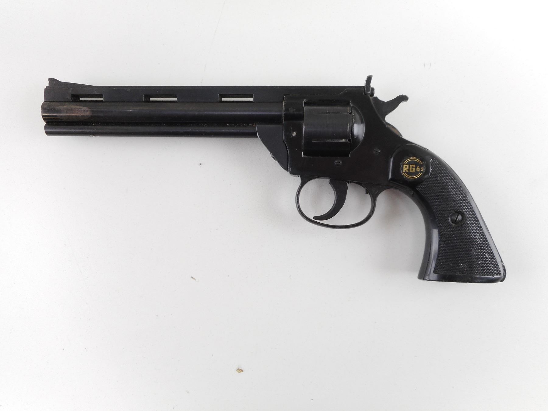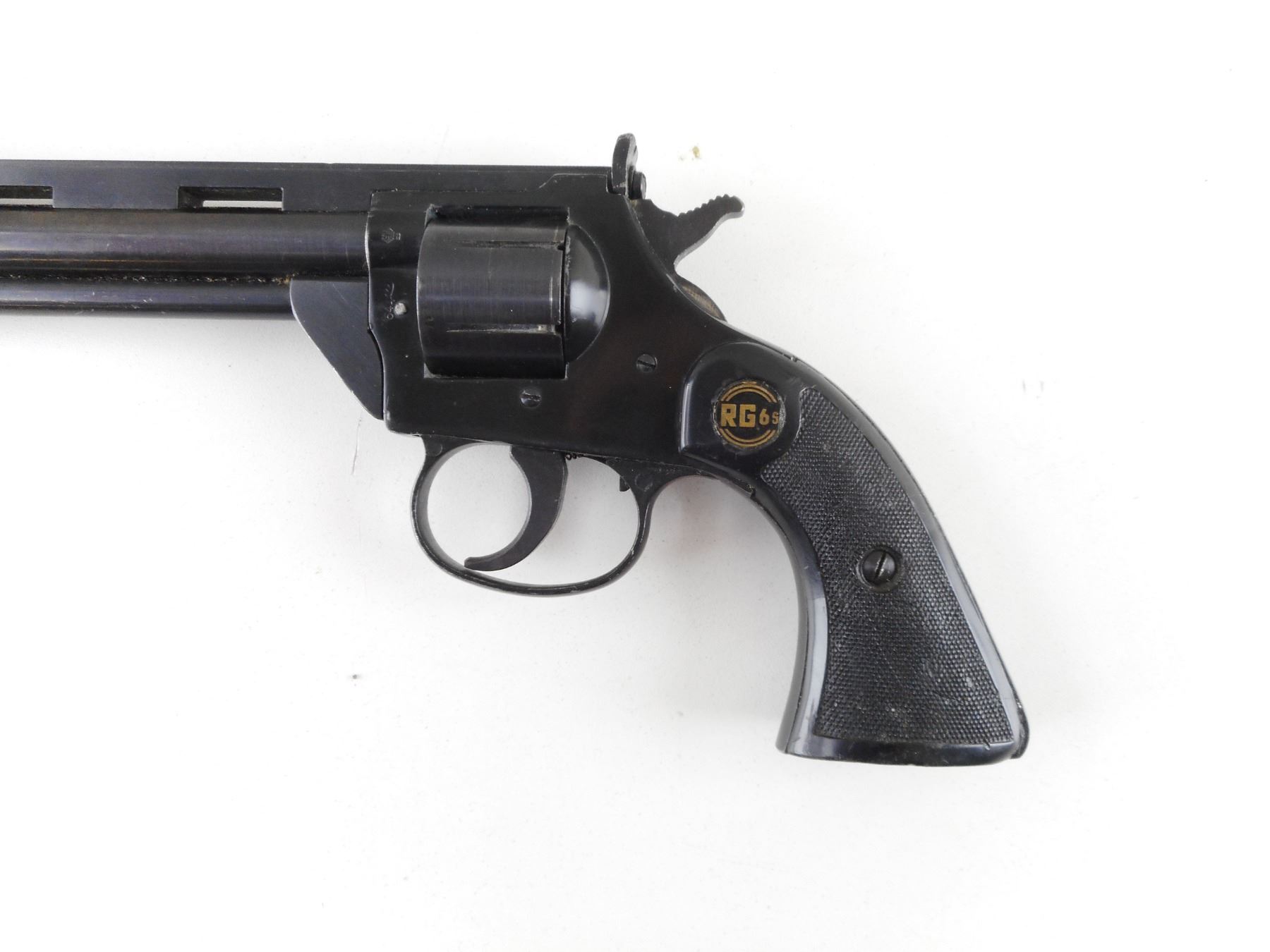 ROHM , MODEL: RG66 , CALIBER: 22 LR , BORE IS VERY GOOD. HOLDS COCK, INDEXES WELL, ACTION IS TIGHT. RAMP FRONT AND RAISED NOTCH REAR SIGHT. BLACK CHECKERED PLASTIC GRIP PANELS WITH RG LOGO. SHOWS SOME HANDLING MARKS. ACTION: REVOLVER , BARREL LENGTH: 156MM , SERIAL # F266631 , CONDITION: 6/10 , CLASS: CANADIAN RESTRICTED CLASS
