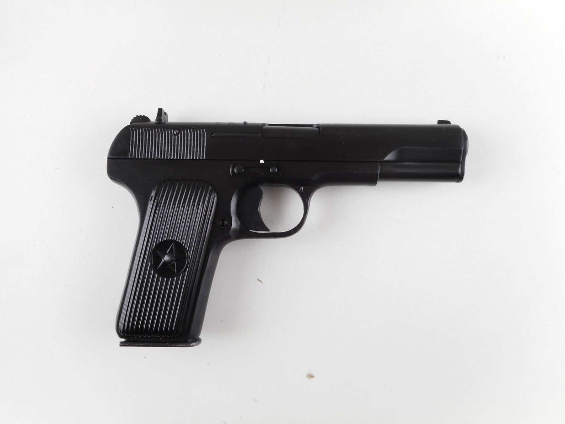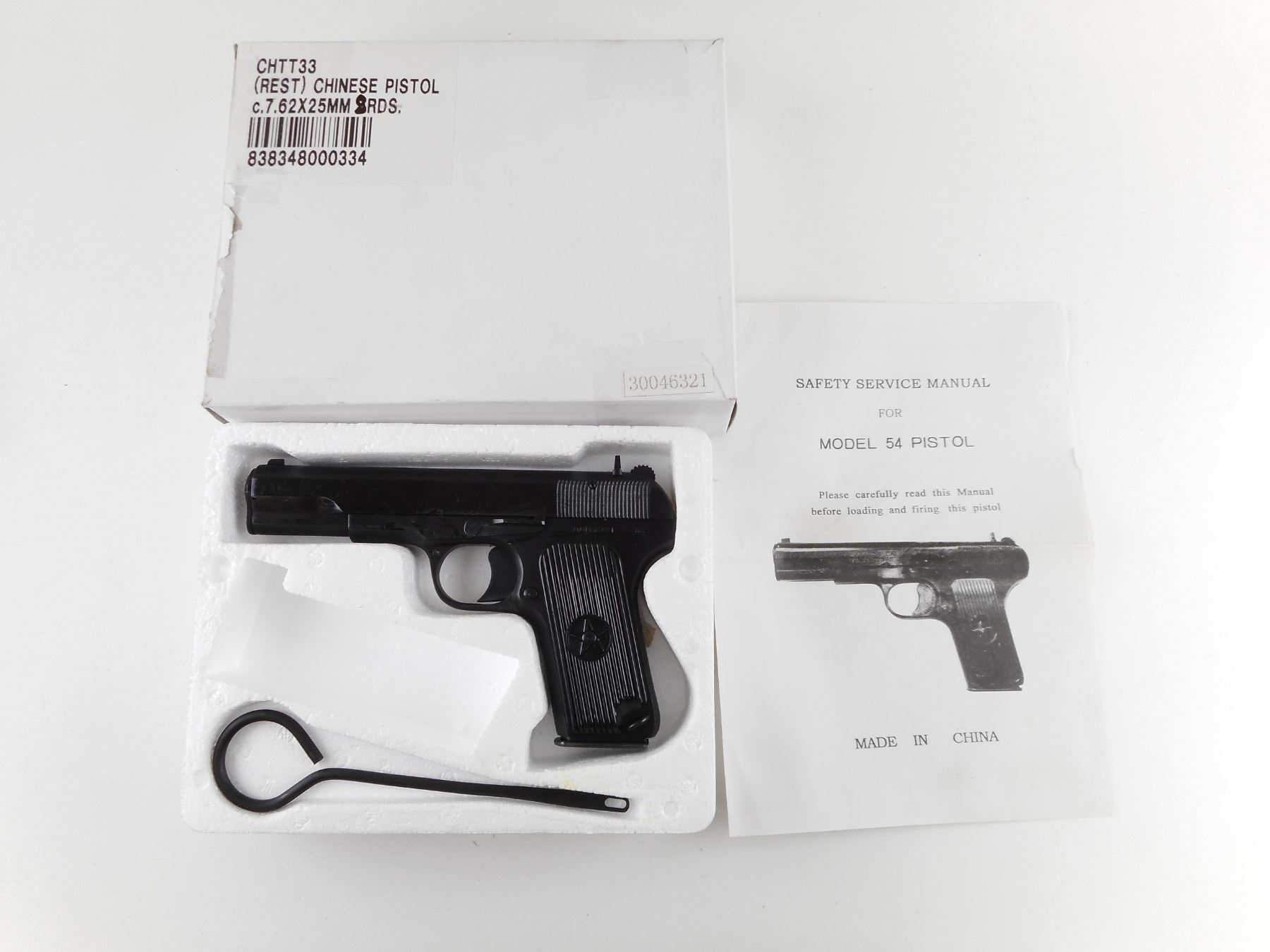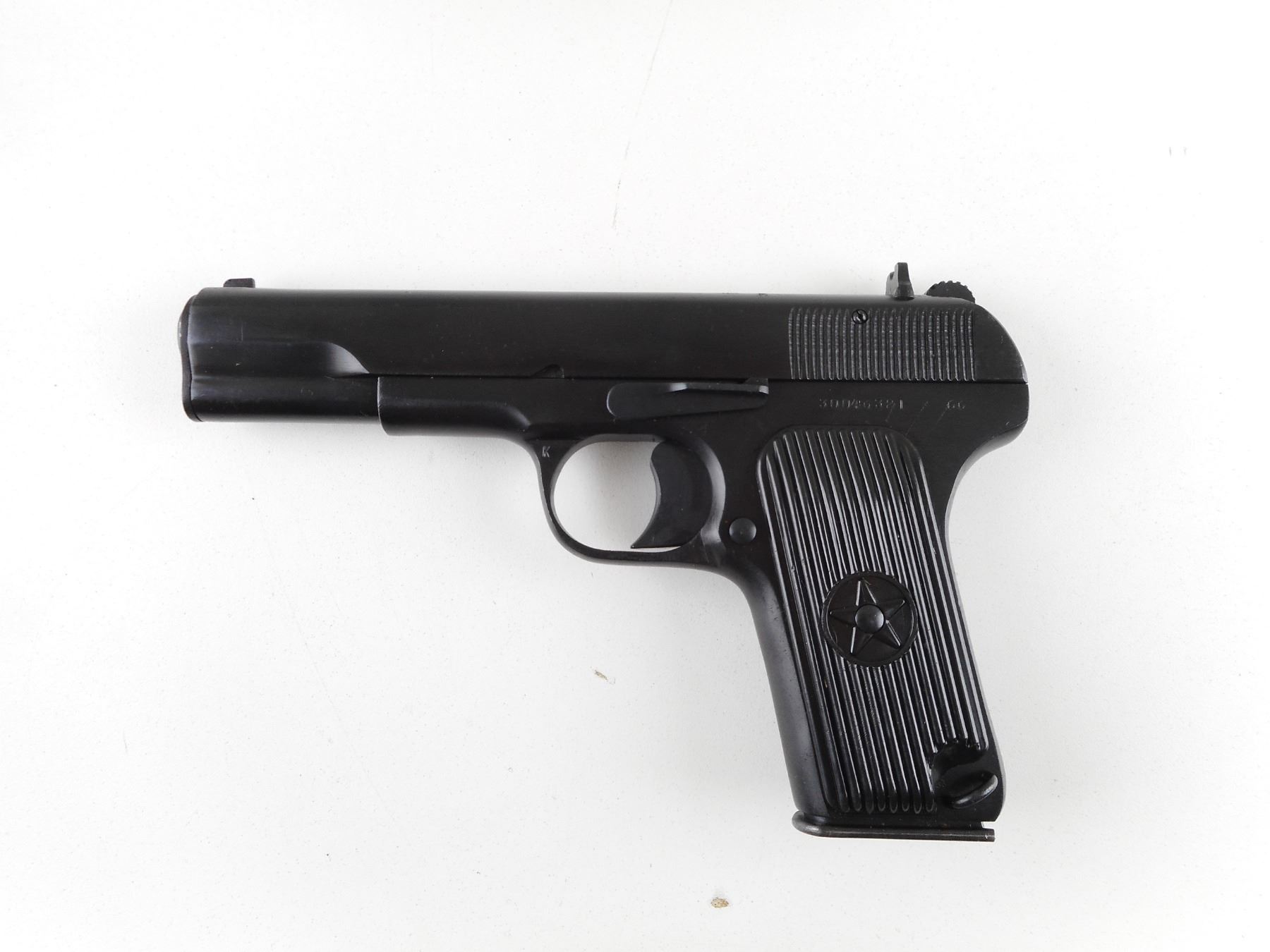 TOKAREV , MODEL: TYPE 54 , CALIBER: 7.62X 25 TOKAREV , COMES IN BOX, WITH MAGAZINE AND CLEANING ROD. BORE IS EXCELLENT, APPEARS AS NEW, MAY HAVE BEEN TEST FIRED. BLADE FRONT AND RAISED NOTCH REAR SIGHT. TWO PIECE PLASTIC GRIP PANELS WITH STAR LOGO. LANYARD LOOP. SHOWS VIRTUALLY NO HANDLING MARKS. ACTION: SEMI-AUTOMATIC HANDGUN , BARREL LENGTH: 110MM , SERIAL # 30046321 , CONDITION: AS NEW IN BOX , CLASS: CANADIAN RESTRICTED CLASS