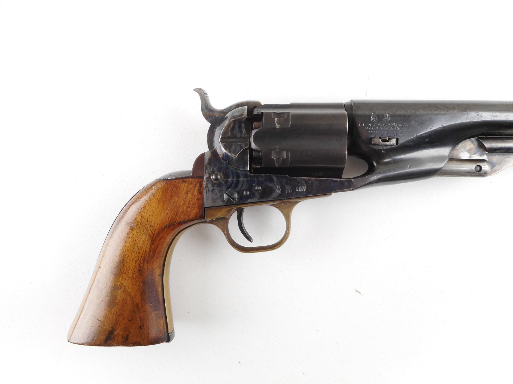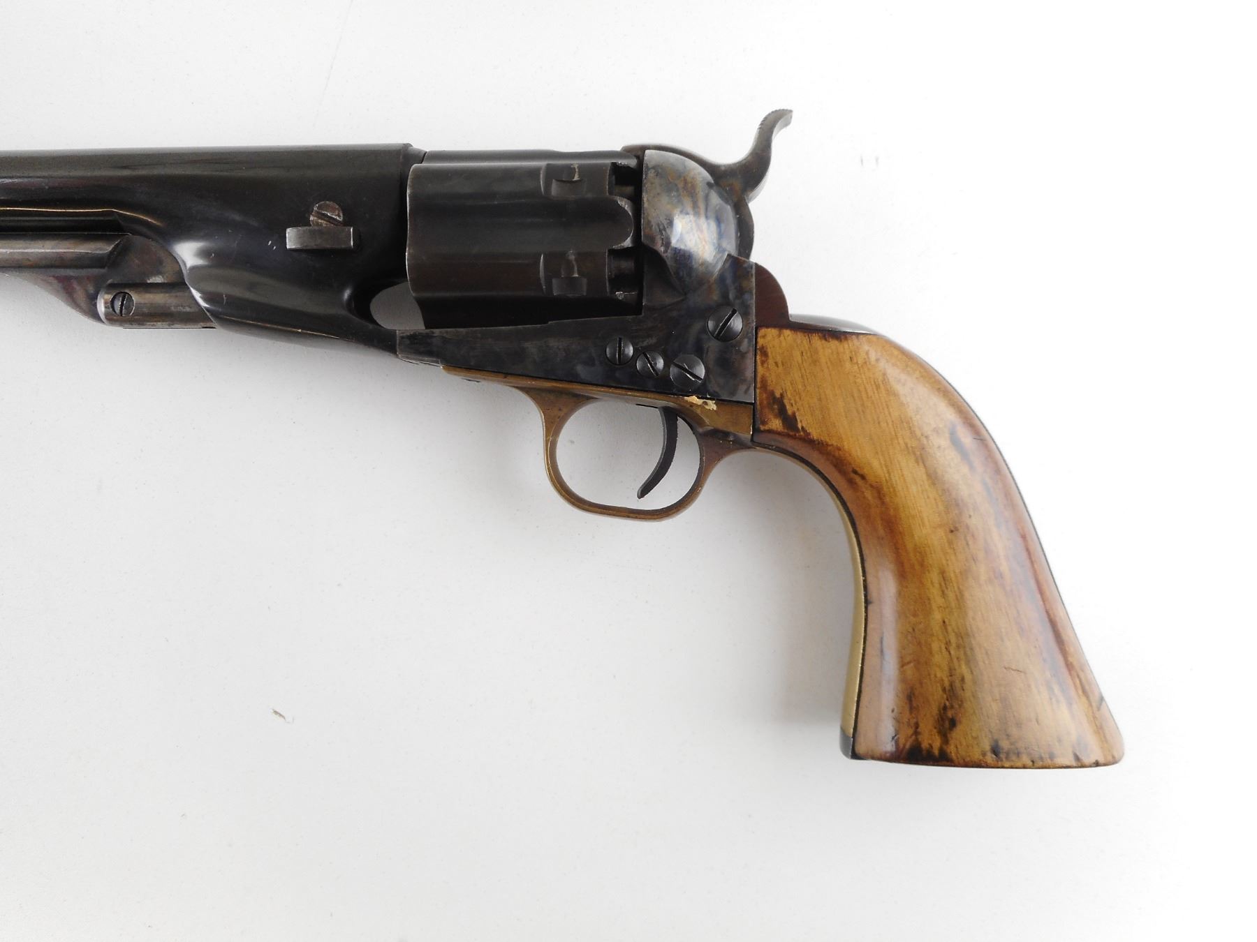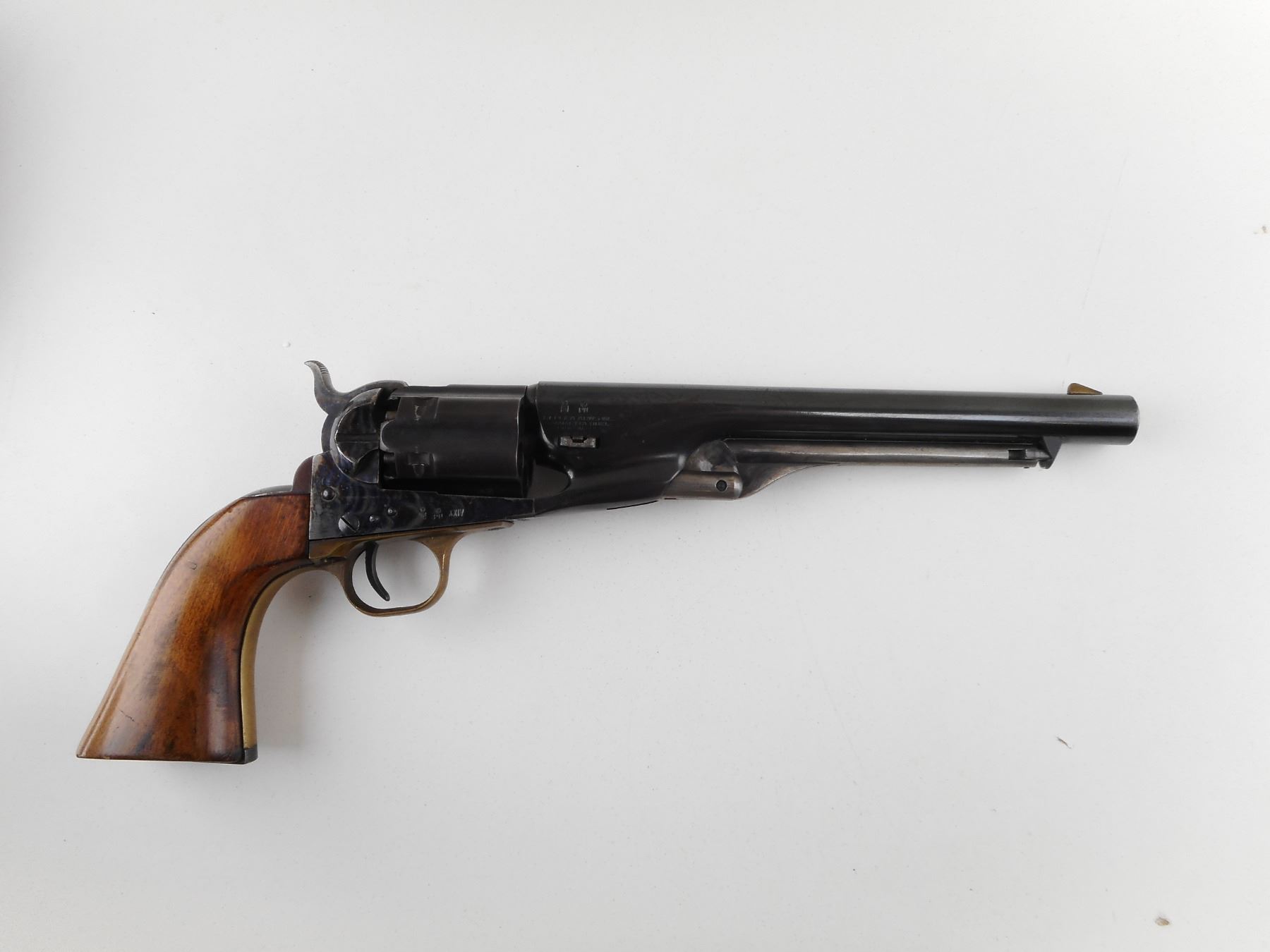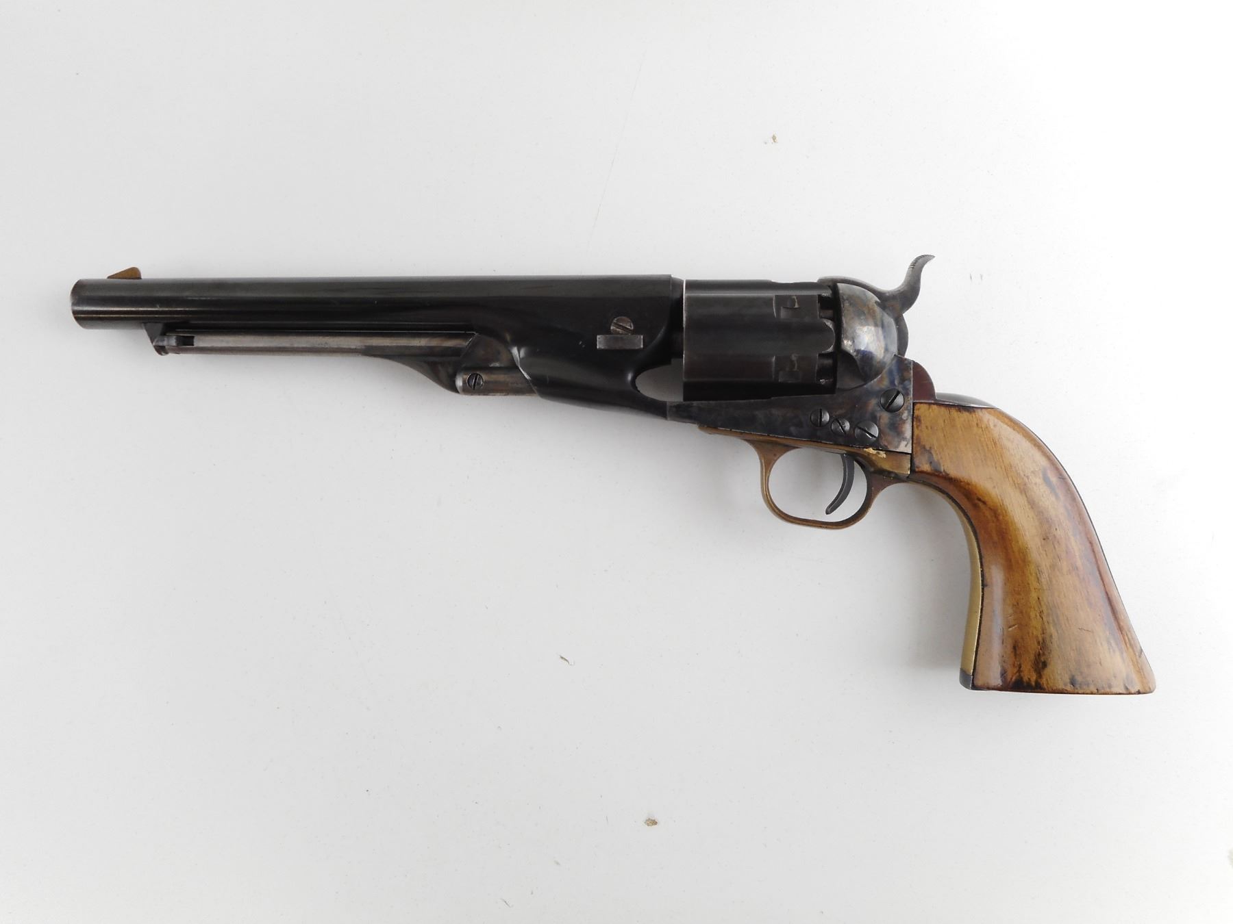 REPLICA ARMS , MODEL: COLT 1860 ARMY REPRODUCTION , CALIBER: 44 CAL PERC , BORE IS GOOD. HOLDS COCK, INDEXES WELL, ACTION IS TIGHT. BLADE FRONT AND NOTCH HAMMER REAR SIGHT. PLAIN WOOD GRIP PANELS. RICHLY CASE HARDENED RECEIVER. SHOWS SOME HANDLING MARKS. ACTION: REVOLVER , BARREL LENGTH: 203MM , SERIAL # A3561 , CONDITION: 6/10 , CLASS: CANADIAN RESTRICTED CLASS