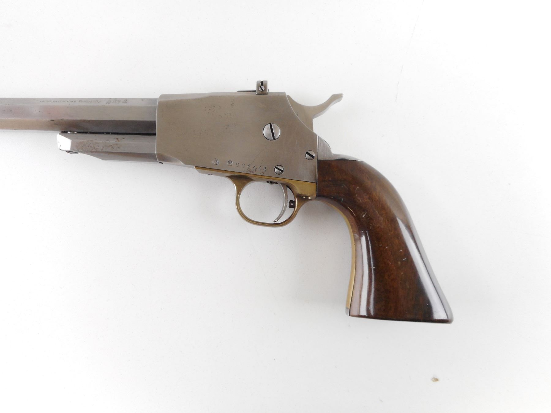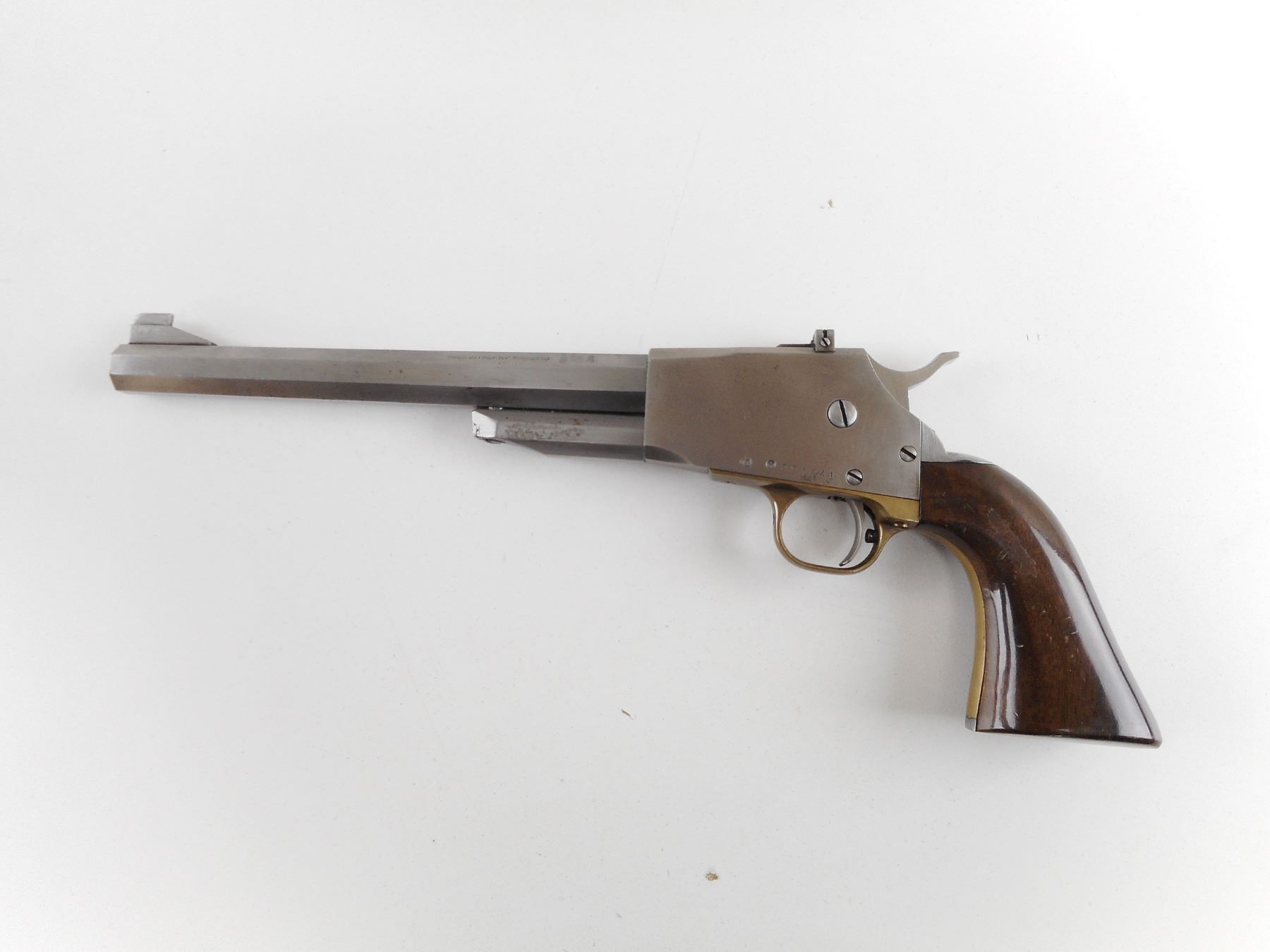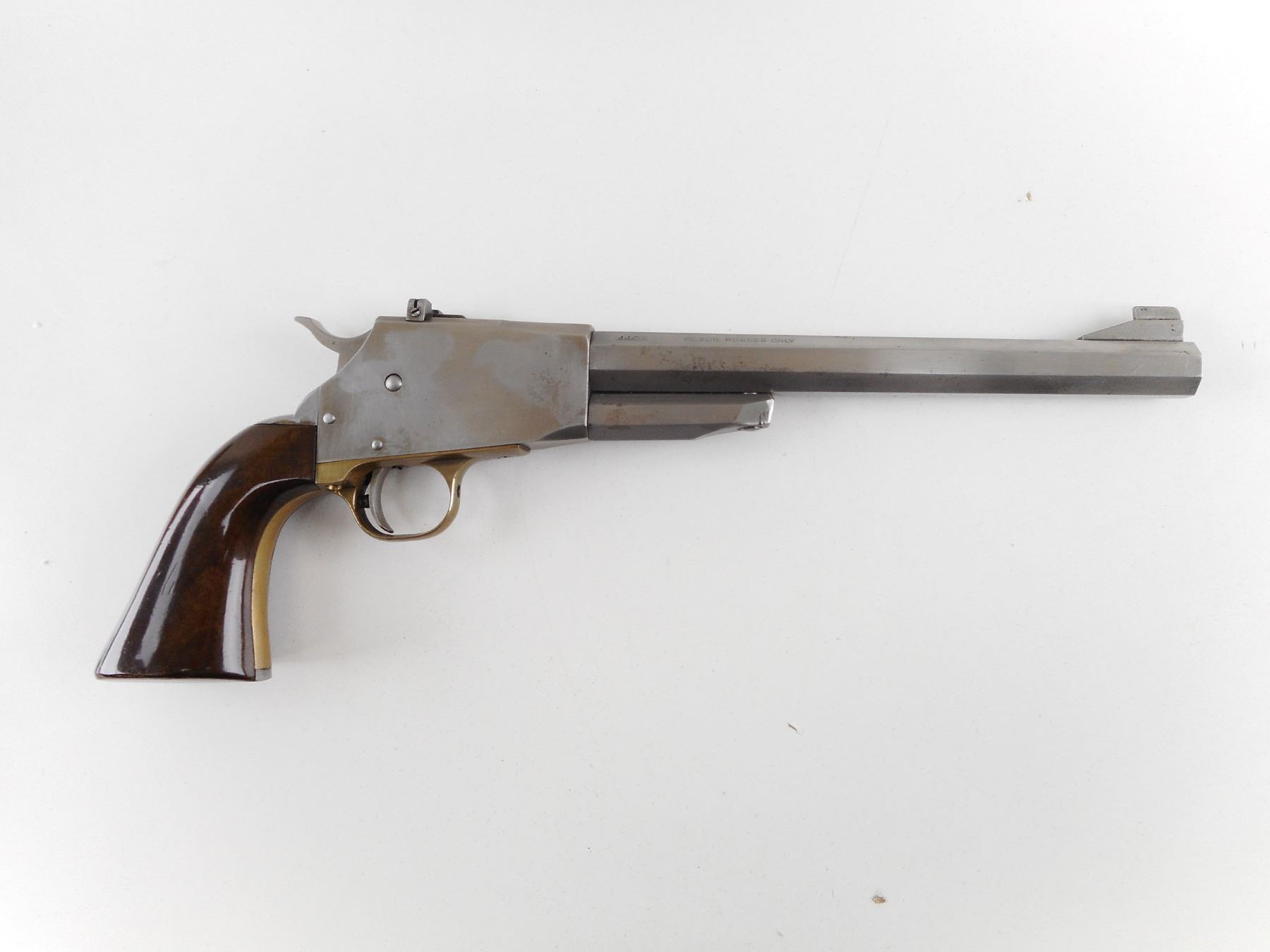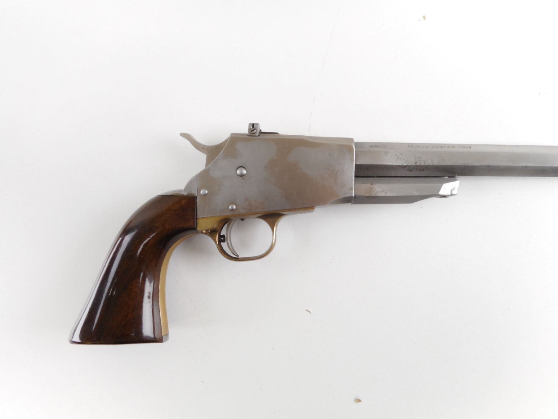 PALMETTO , MODEL: PENNSYLVANIA PISTOL REPRODUCTION , CALIBER: 44 CAL PERC , BORE IS GOOD. HOLDS COCK. RAMP FRONT AND ADJUSTABLE REAR SIGHT. OCTAGONAL BARREL. PLAIN WOOD GRIP PANELS. SHOWS VERY LITTLE HANDLING MARKS. ACTION: SINGLE SHOT PISTOL , BARREL LENGTH: 235MM , SERIAL # 01441 , CONDITION: 7/10 , CLASS: CANADIAN RESTRICTED CLASS
