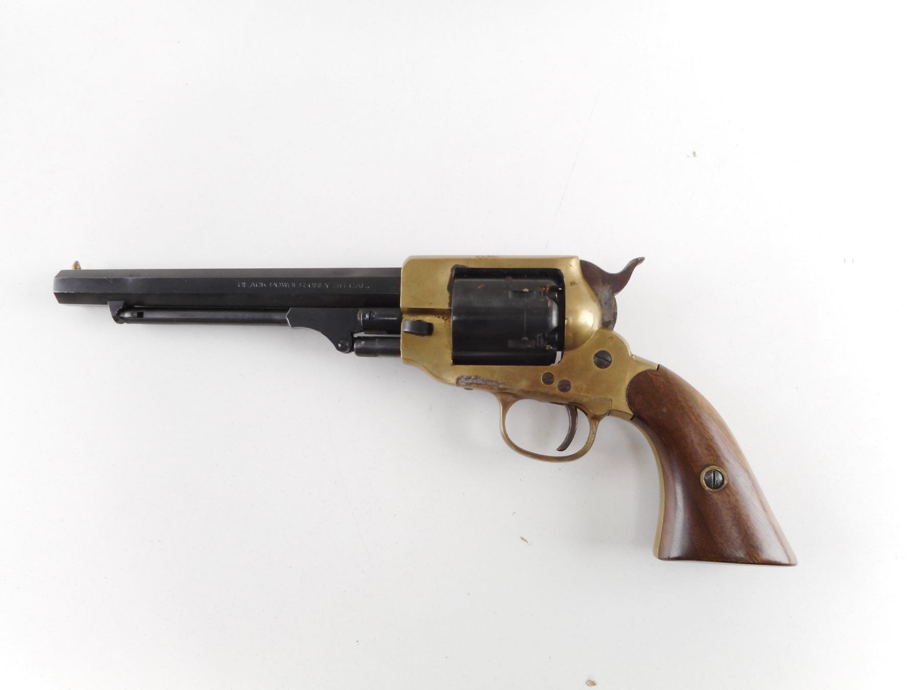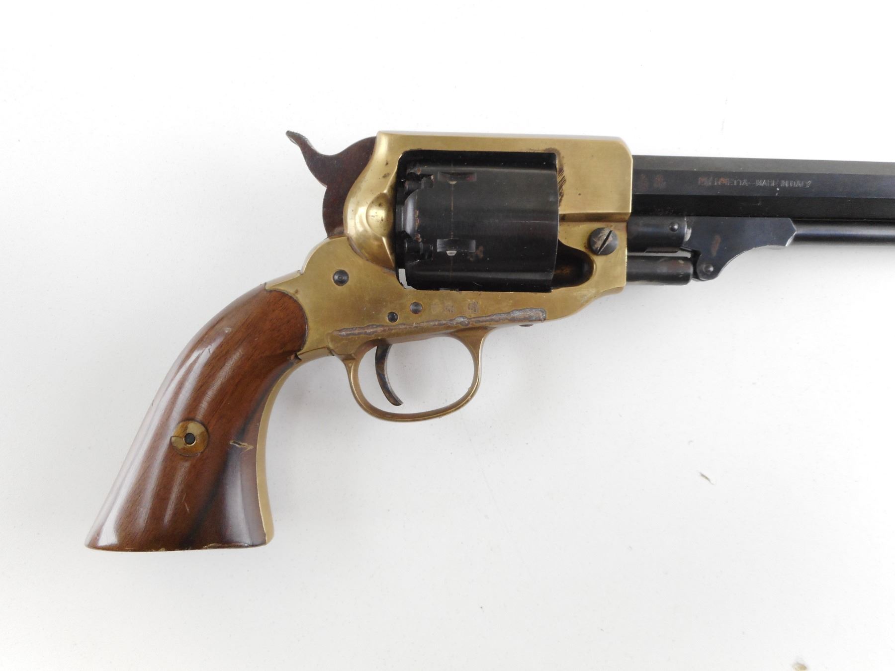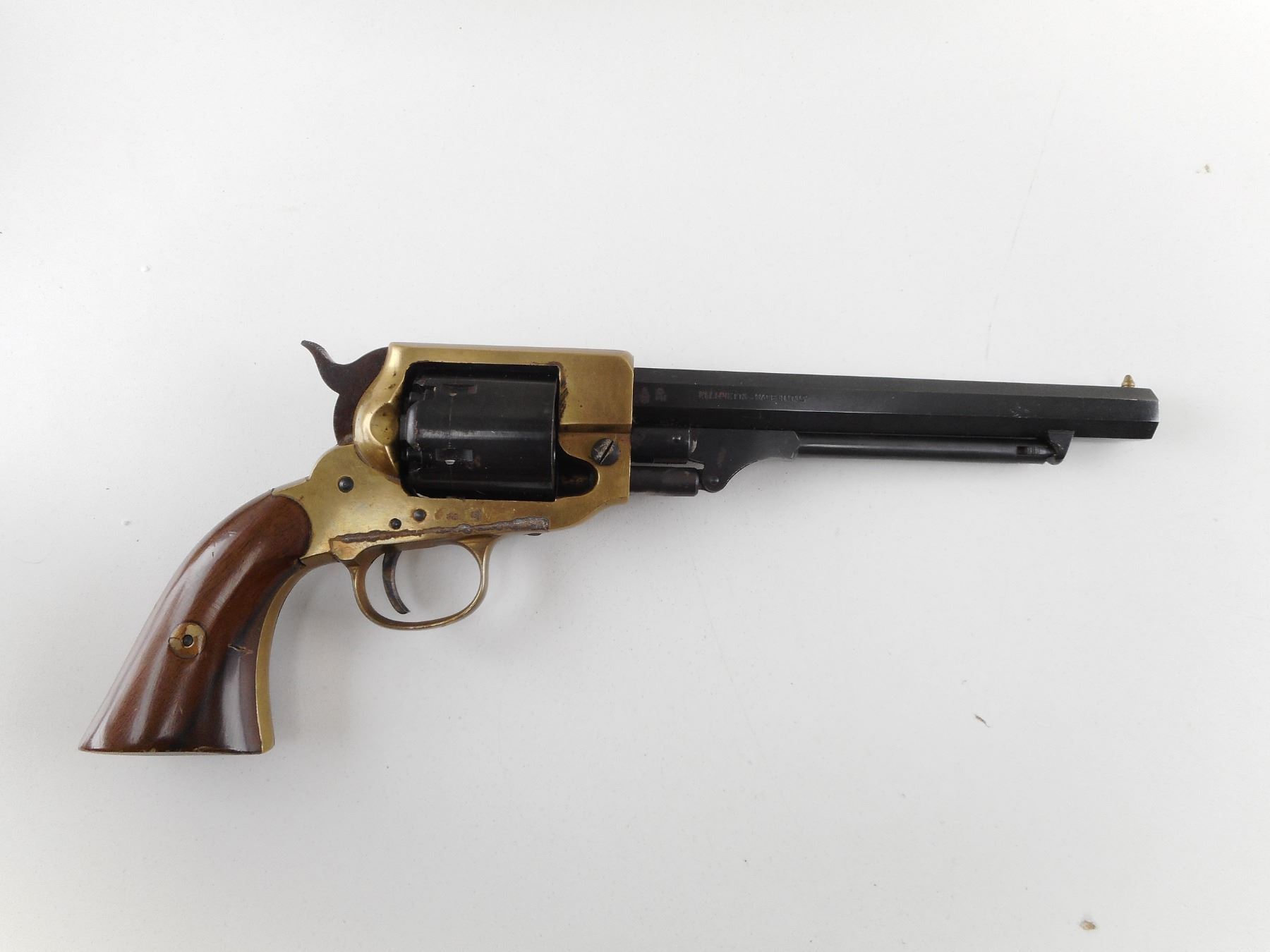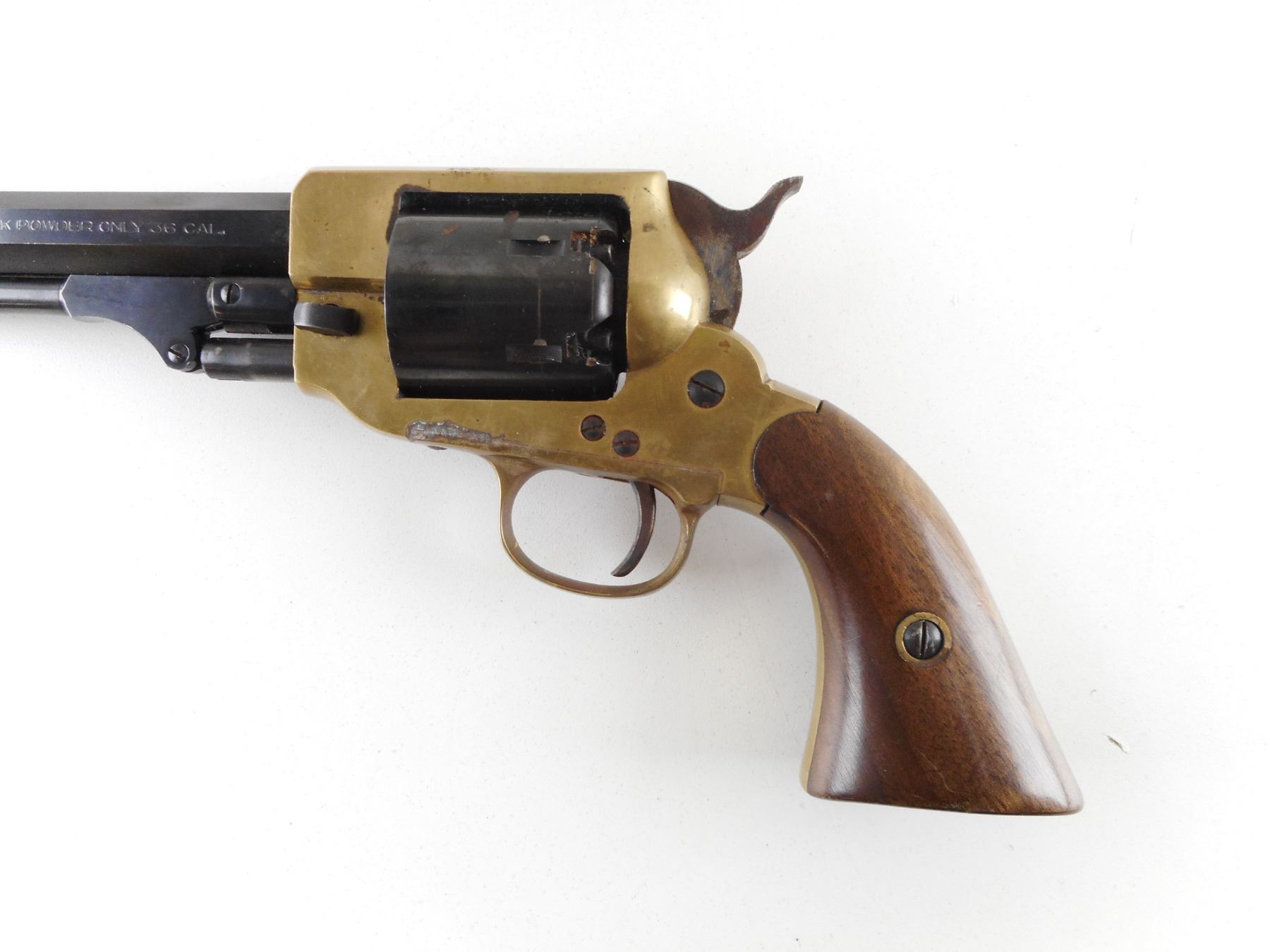 PIETTA , MODEL: SPILLER & BURR WHITNEY TYPE REPRODUCTION , CALIBER: 36 CAL PERC , BORE IS GOOD. HOLDS COCK, INDEXES WELL, ACTION IS TIGHT. BRASS BEAD FRONT SIGHT, NOTCH HAMMER REAR SIGHT ON AN OCTAGONAL BARREL. BRASS FRAME. PLAIN WOOD GRIP PANELS. SOME DISCOLOURATION ON THE BRASS FRAME. SHOWS SOME HANDLING MARKS. ACTION: REVOLVER , BARREL LENGTH: 178MM , SERIAL # B2484 , CONDITION: 6/10 , CLASS: CANADIAN RESTRICTED CLASS