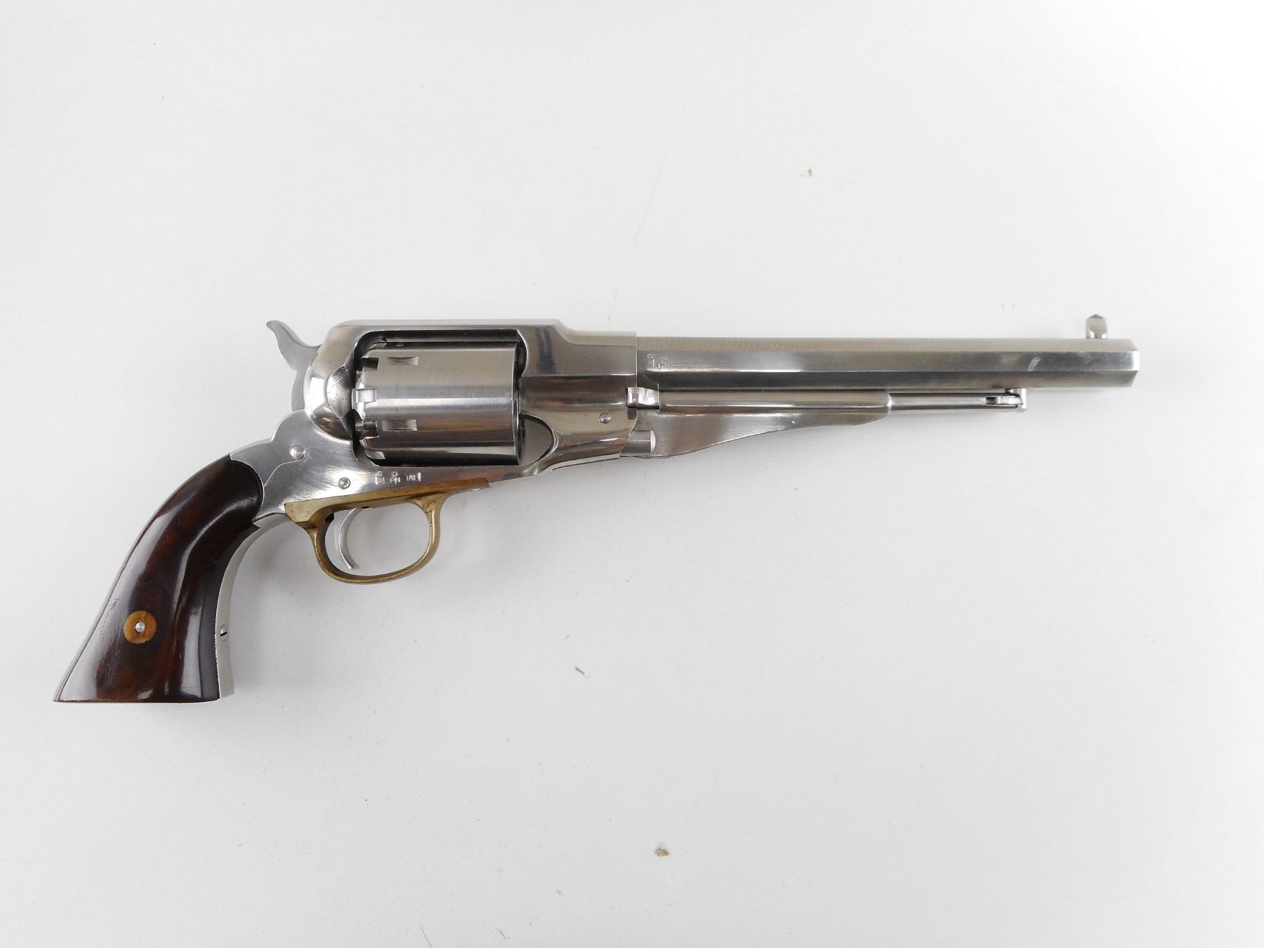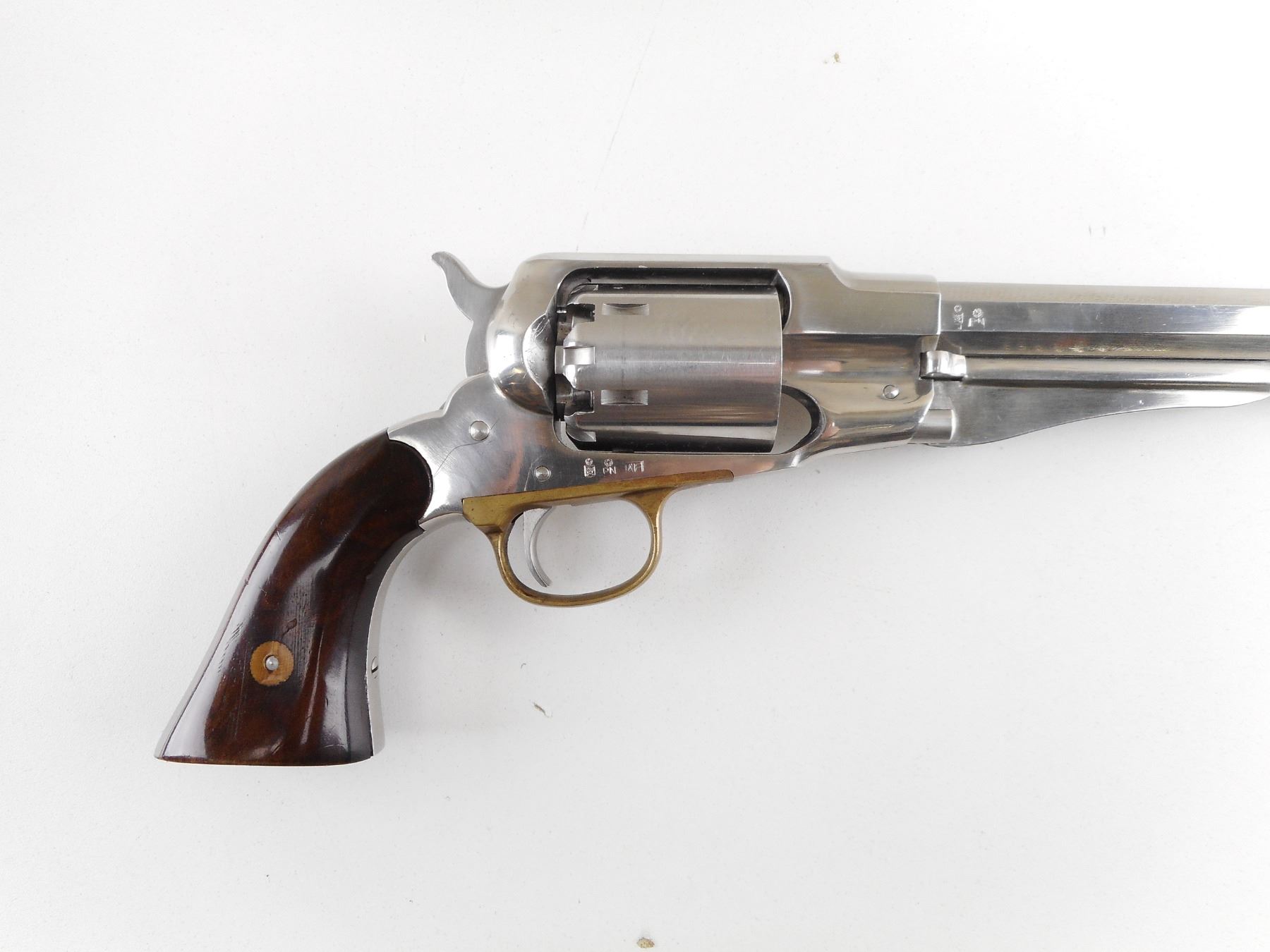 SAFARI ARMS , MODEL: REMINGTON NEW MODEL ARMY REPRODUCTION , CALIBER: 44 CAL PERC , MANUFACTURED BY PIETTA. 6 SHOT CAPACOTY. VERY GOOD BORE. HOLDS COCK, INDEXES WELL, ACTION IS TIGHT. BLADE FRONT AND GROOVED REAR SIGHT. NICKEL FINISH. TWO PIECE PLAIN HARDWOOD GRIPS. SHOWS VERY LITTLE HANDLING MARKS. ACTION: REVOLVER , BARREL LENGTH: 203MM , SERIAL # 041756 , CONDITION: 8/10 , CLASS: CANADIAN RESTRICTED CLASS