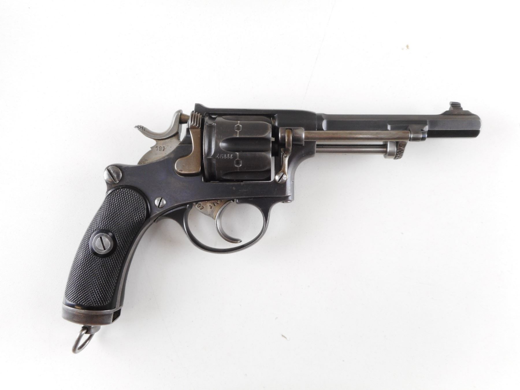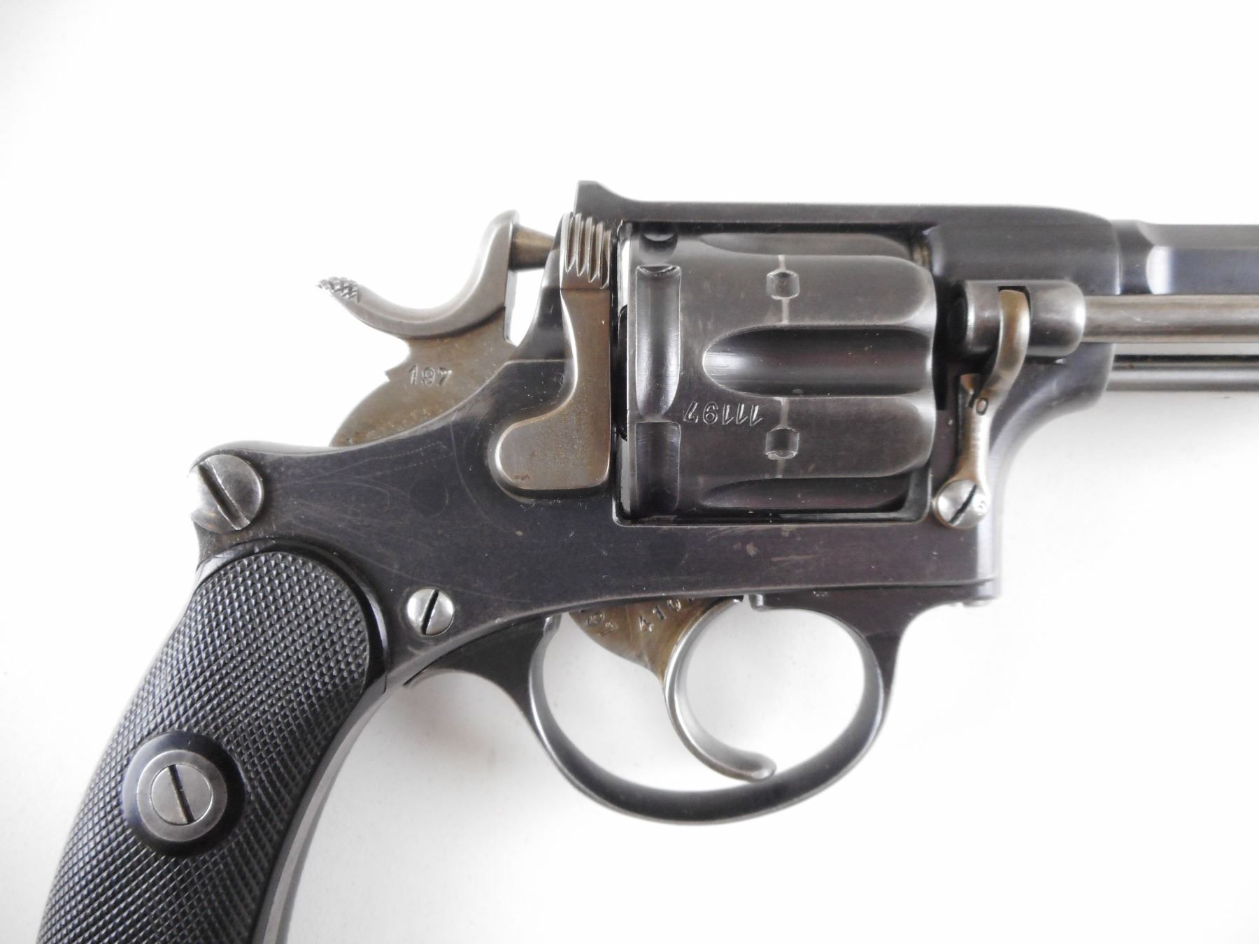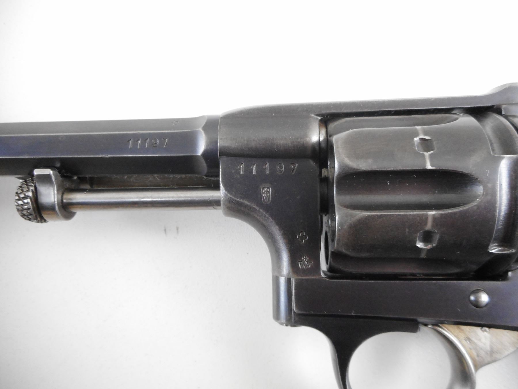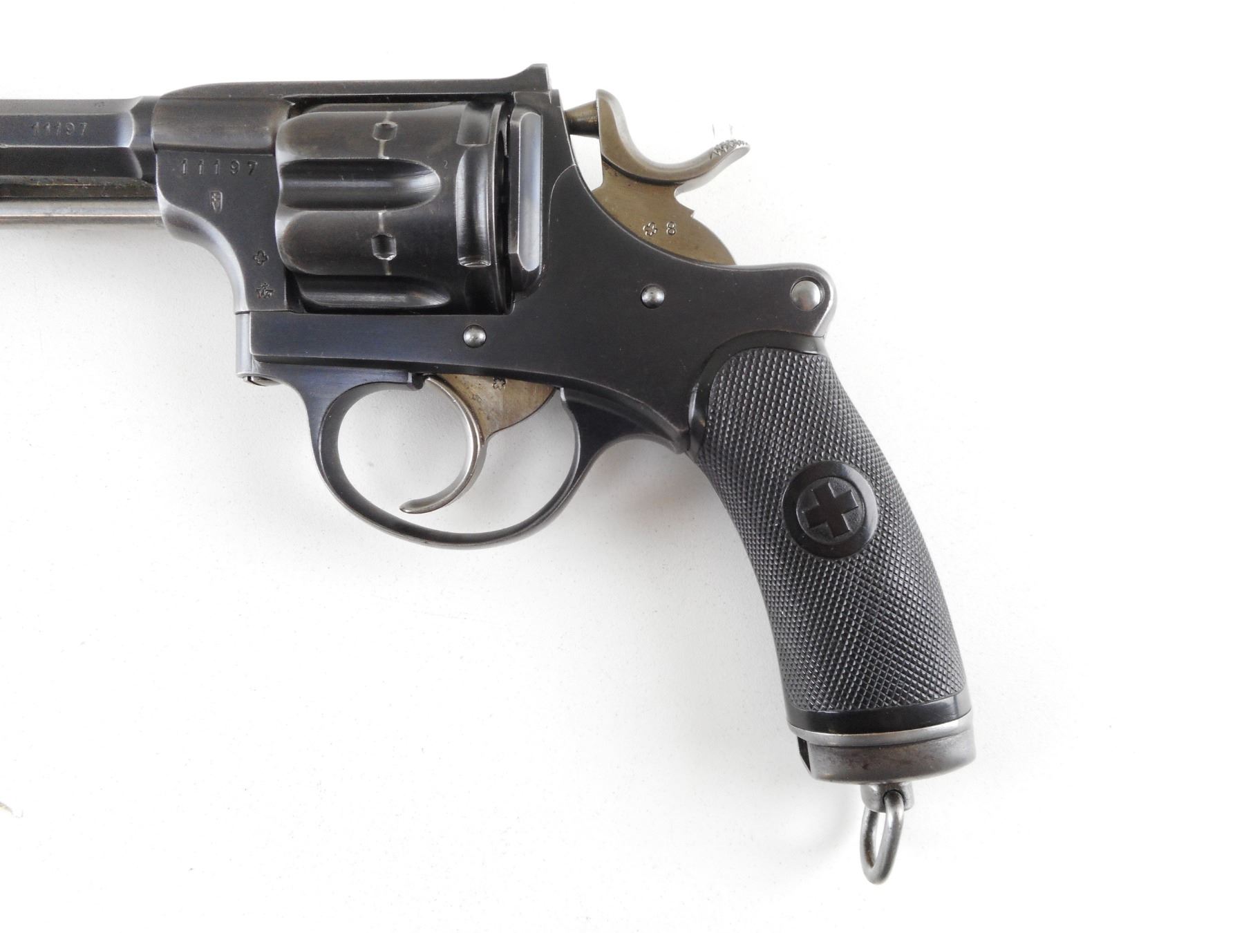 SWISS SERVICE , MODEL: 1882 , CALIBER: 7.5MM SWISS REVOLVER , MANUFACTURED BY WAFFENFABRIK BERN. BARREL AND RECEIVER ARE MATCHING BY SERIAL #. BORE IS GOOD. HOLDS COCK, INDEXES WELL, ACTION IS TIGHT. BLADE FRONT AND RAISED NOTCH REAR SIGHT. CHECKERED TWO PIECE PLASTIC GRIP PANELS WITH SWISS LOGO. SHOWS VERY LITTLE HANDLING MARKS. LANYARD LOOP. ACTION: REVOLVER , BARREL LENGTH: 115MM , SERIAL # 11197 , CONDITION: 8/10 , CLASS: CANADIAN RESTRICTED CLASS