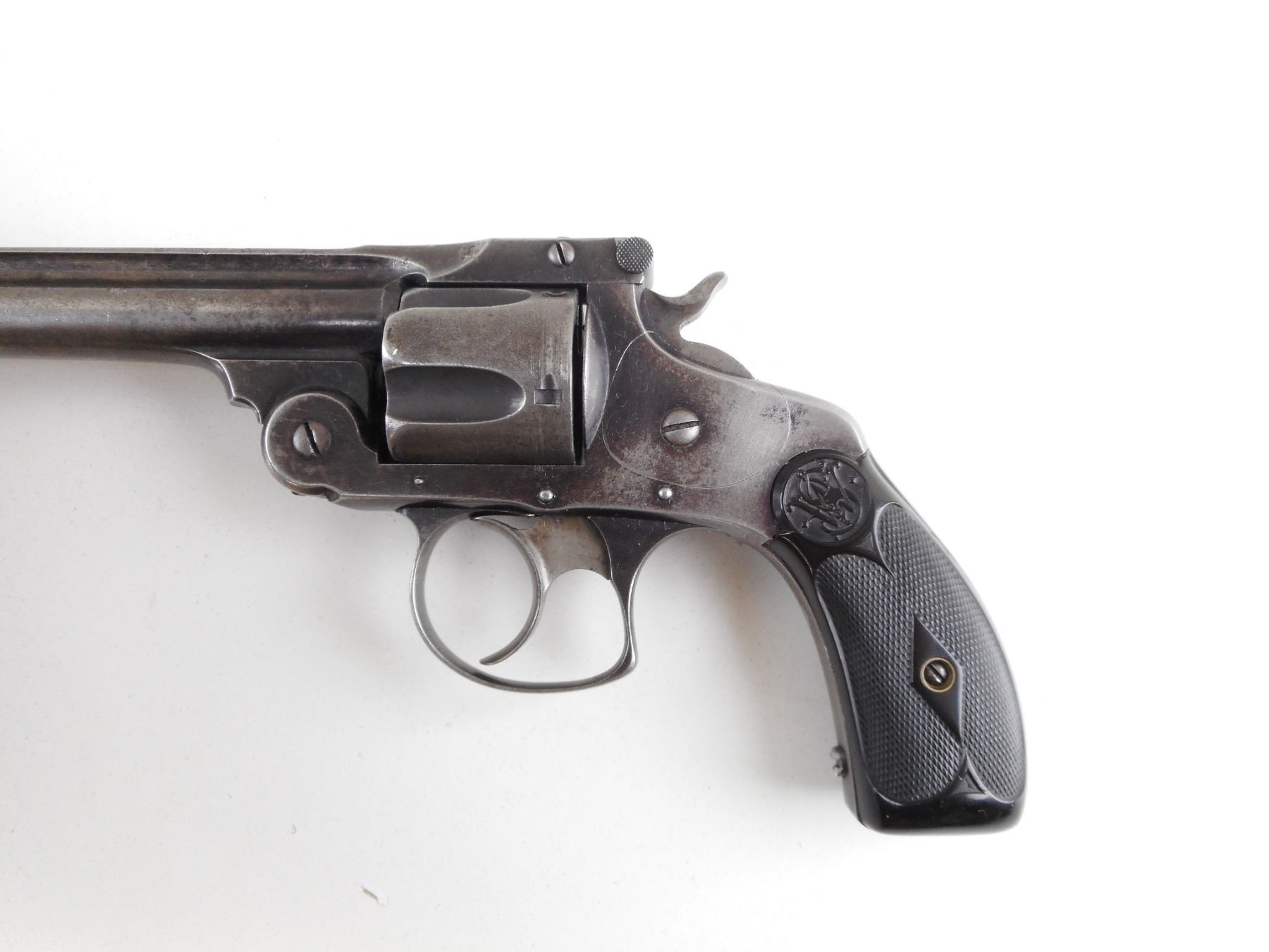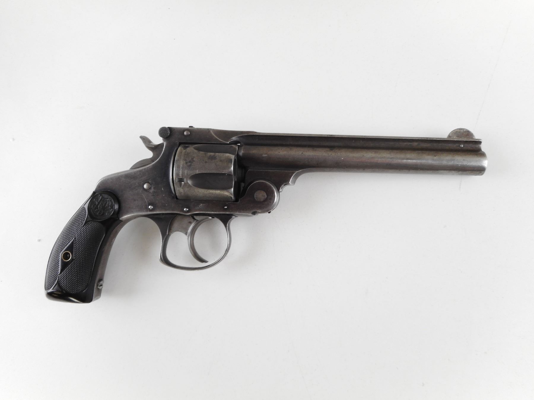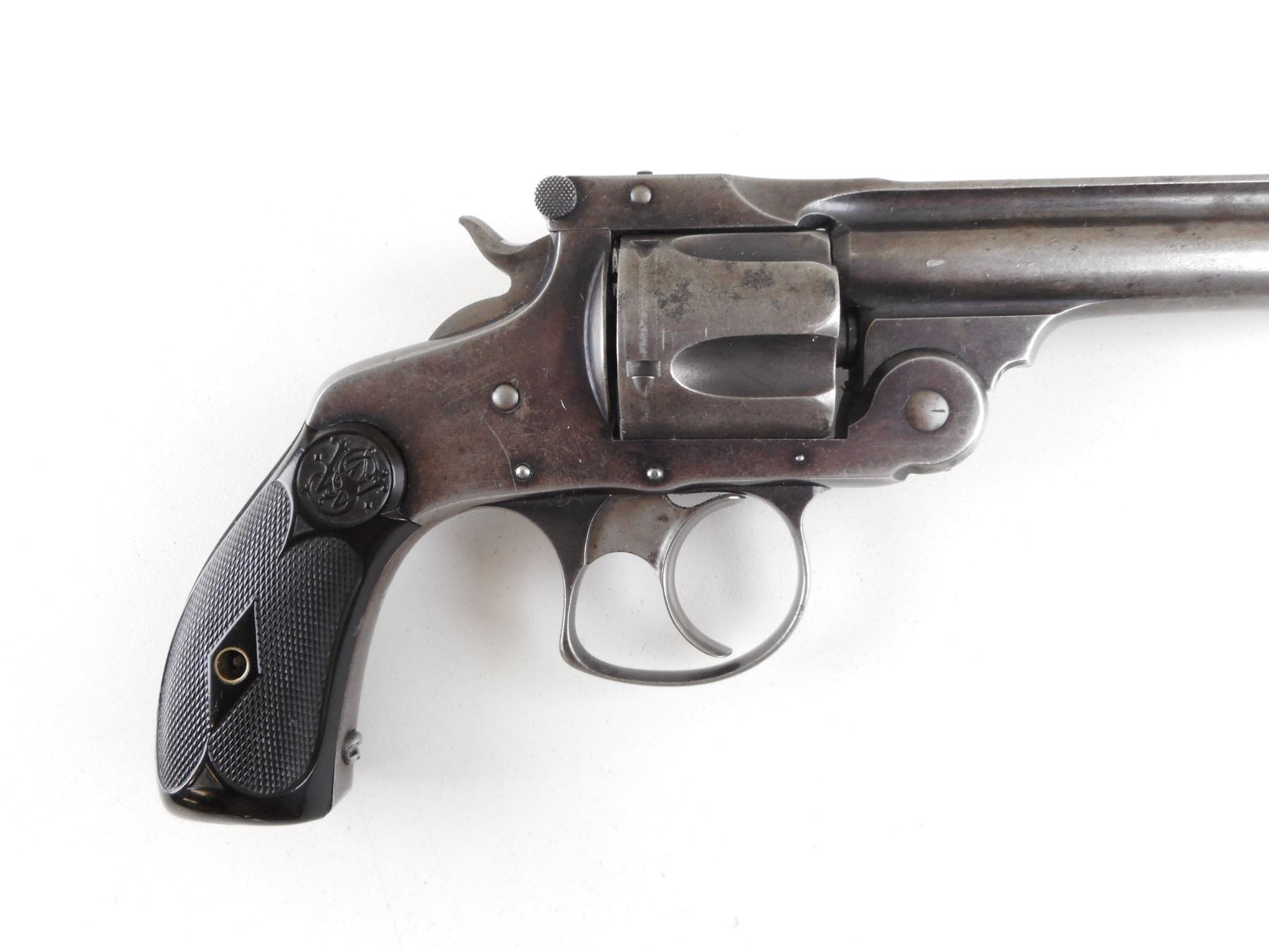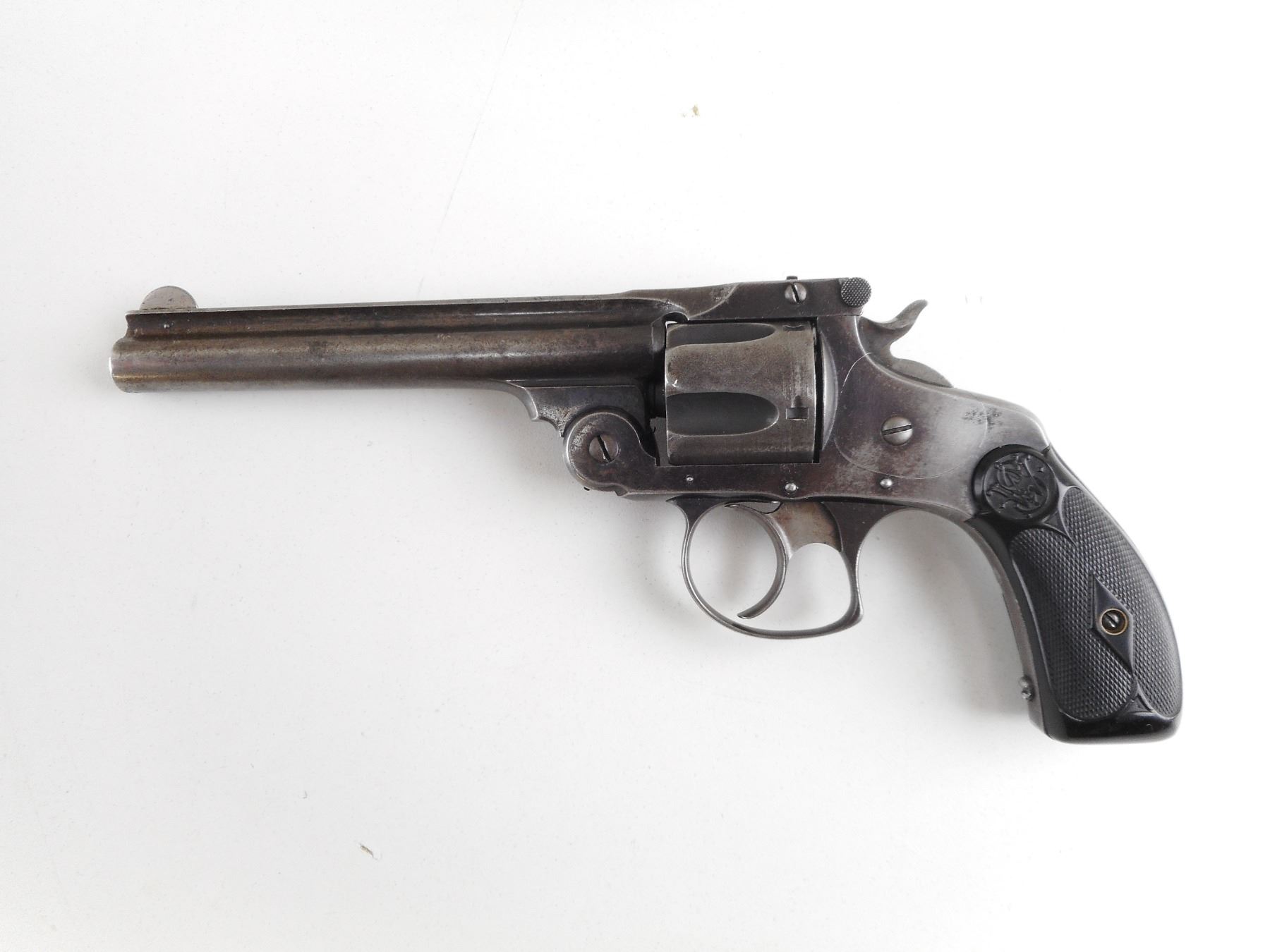 SMITH & WESSON , MODEL: TOP BREAK 38 NO 2 DOUBLE ACTION MODEL 3 , CALIBER: 38 S&W , 5 SHOT CAPACITY. BORE IS FAIR. BLADE FRONT AND RAISED NOTCH REAR SIGHT. TWO PIECE BLACK PLASTIC GRIP PANELS WITH S&W LOGO. VERY LITTLE ORIGINAL FINISH REMAINING. ACTION: REVOLVER , BARREL LENGTH: 127MM , SERIAL # 202273 , CONDITION: 6/10 , CLASS: CANADIAN RESTRICTED CLASS