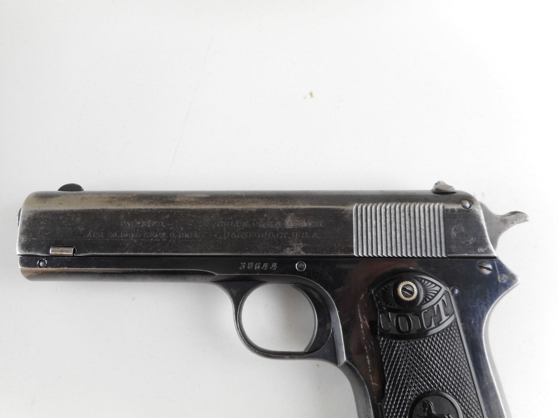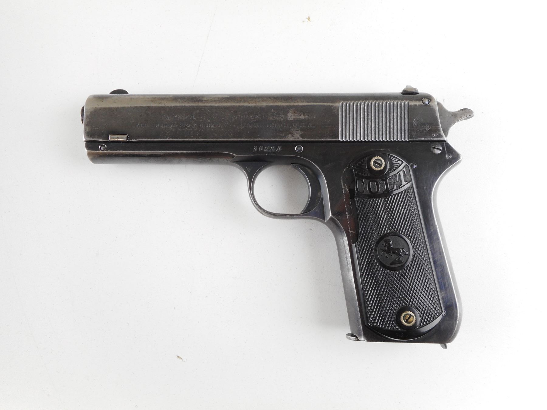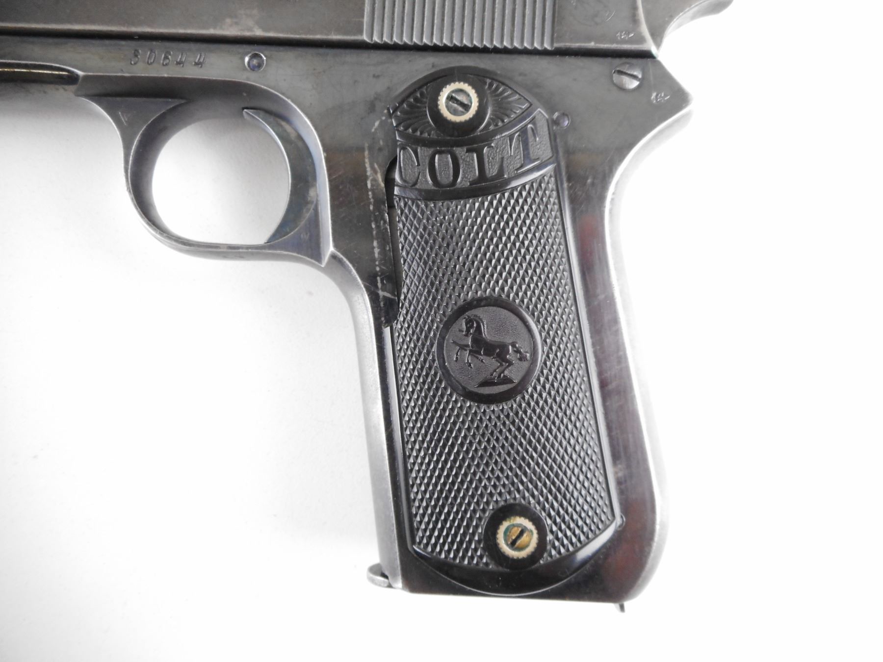 COLT , MODEL: 1903 POCKET , CALIBER: 38 AUTO , COMES WITH MAGAZINE. BORE IS GOOD. BLADE FRONT AND RAISED NOTCH REAR SIGHT. CRACK AND CHIPPED LEFT GRIP PANEL. SHOWS SOME HANDLING MARKS. ACTION: SEMI-AUTOMATIC HANDGUN , BARREL LENGTH: 114MM , SERIAL # 30644 , CONDITION: 6/10 , CLASS: CANADIAN RESTRICTED CLASS