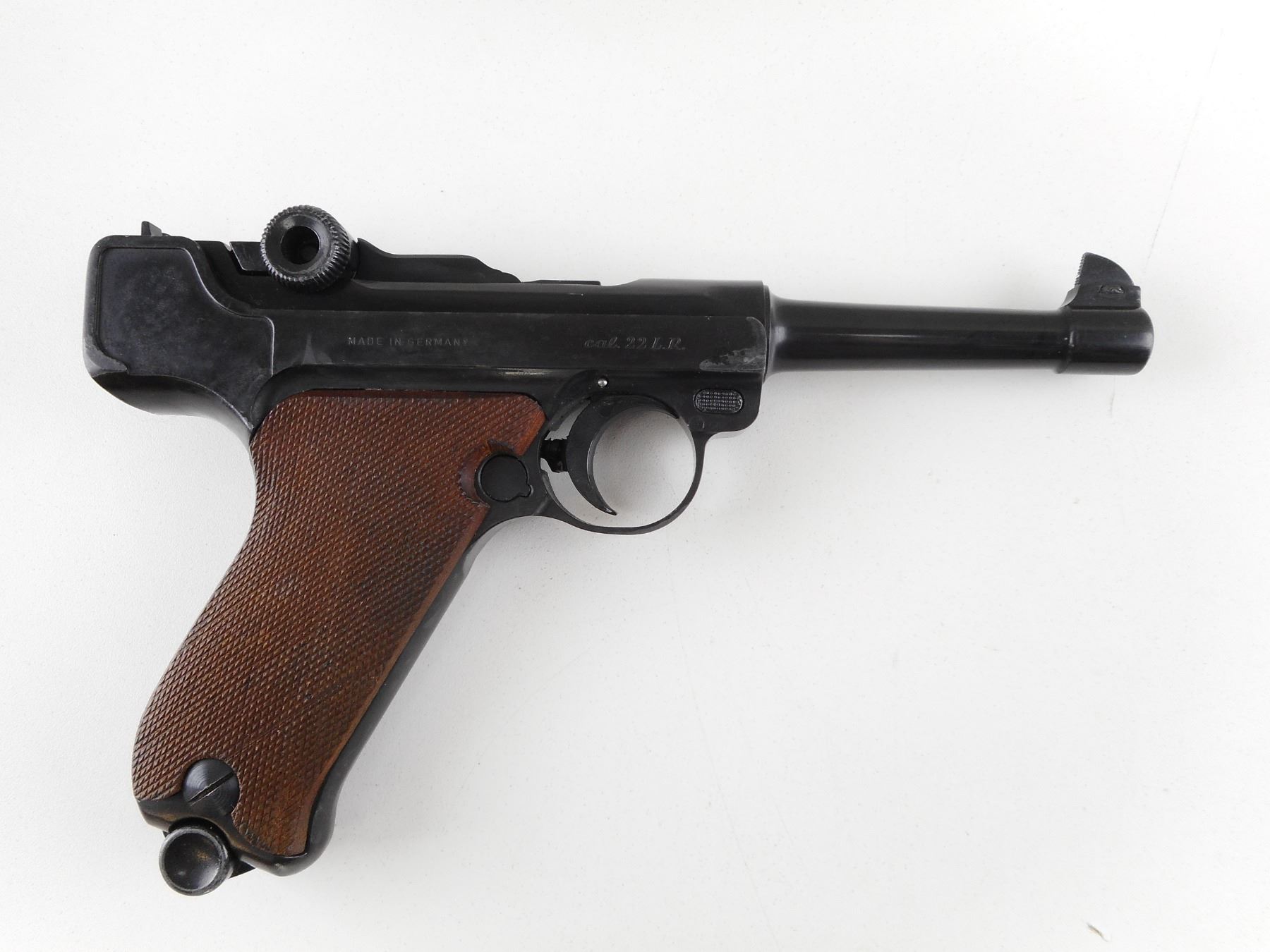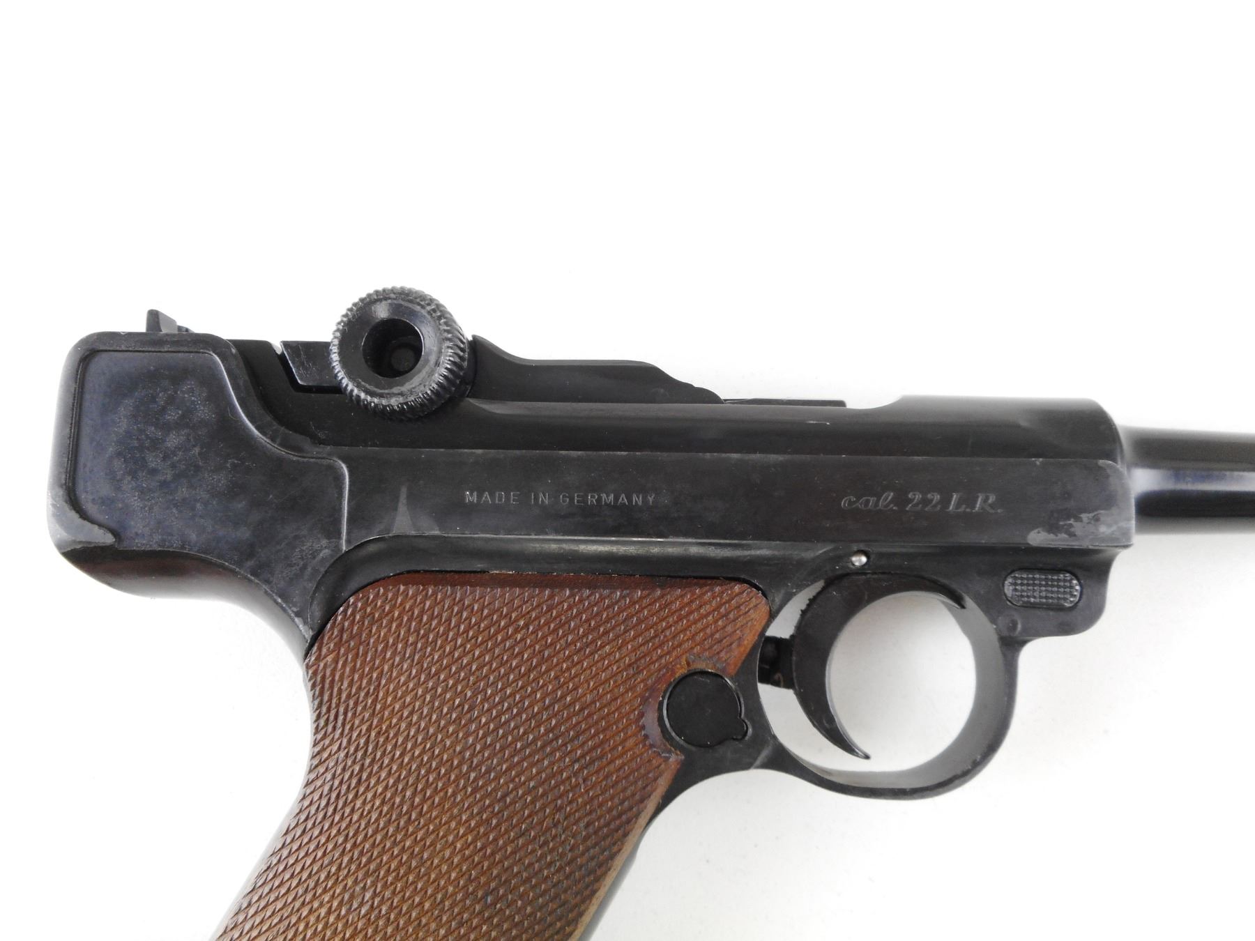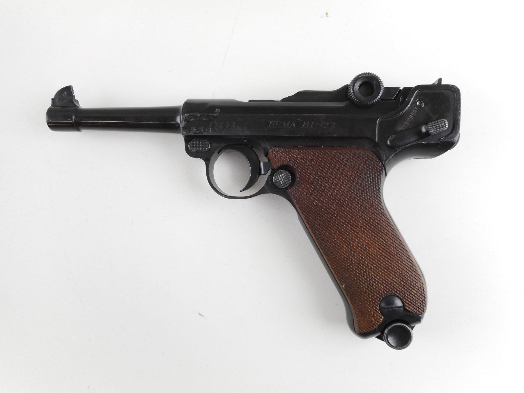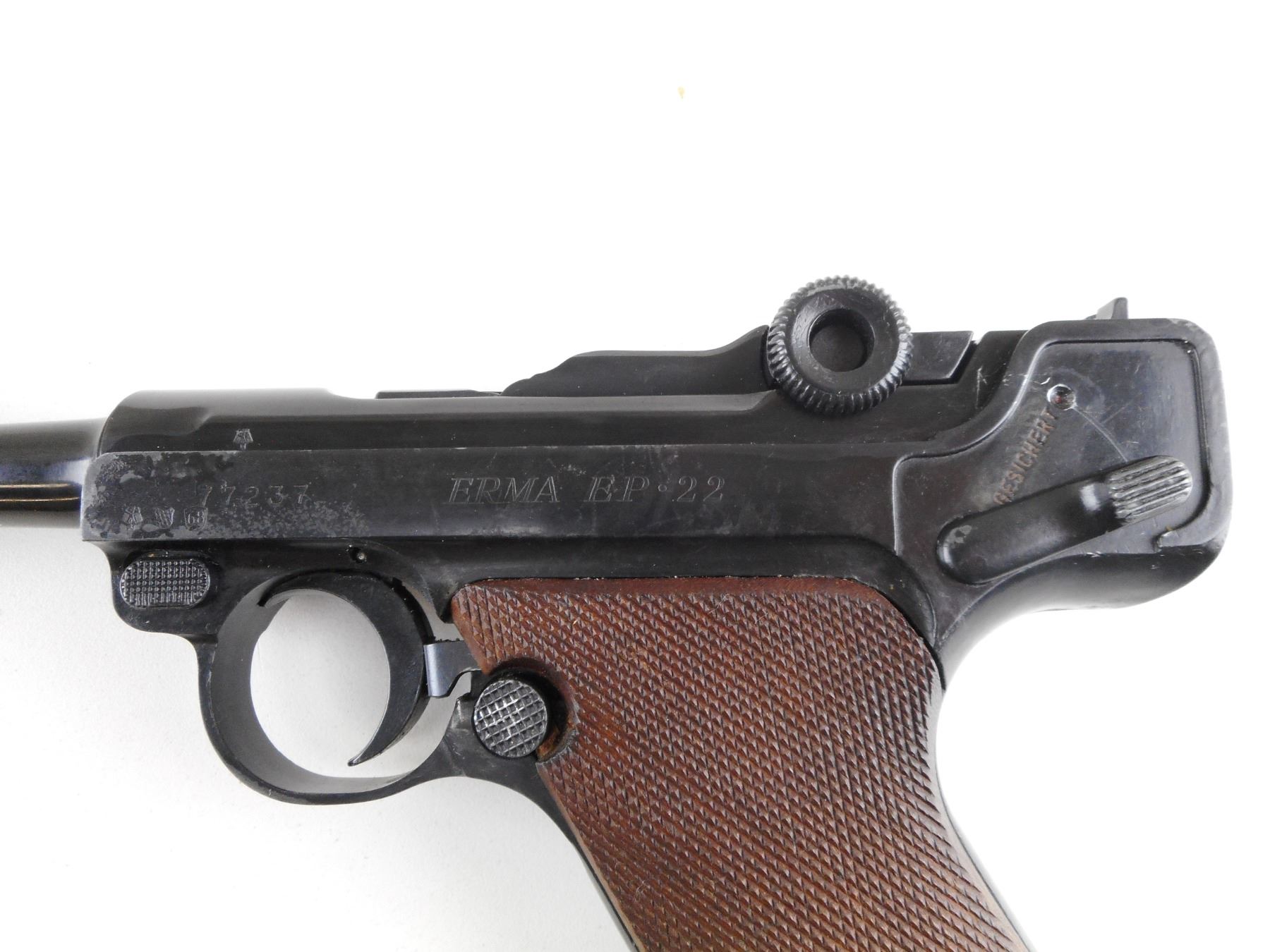 ERMA , MODEL: EP22 , CALIBER: 22 LR , COMES WITH MAGAZINE. BORE IS GOOD. BLADE FRONT AND RAISED NOTCH REAR SIGHT. CHECKERED WOOD GRIP PANELS. SHOWS SOME HANDLING MARKS. ACTION: SEMI-AUTOMATIC HANDGUN , BARREL LENGTH: 114MM , SERIAL # 77237 , CONDITION: 6/10 , CLASS: CANADIAN RESTRICTED CLASS