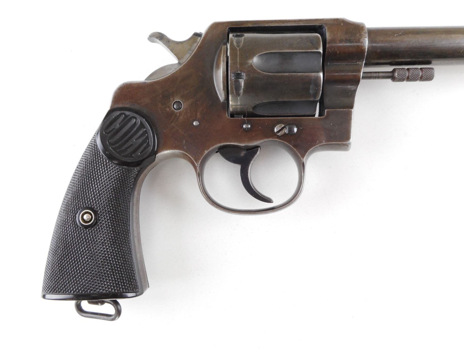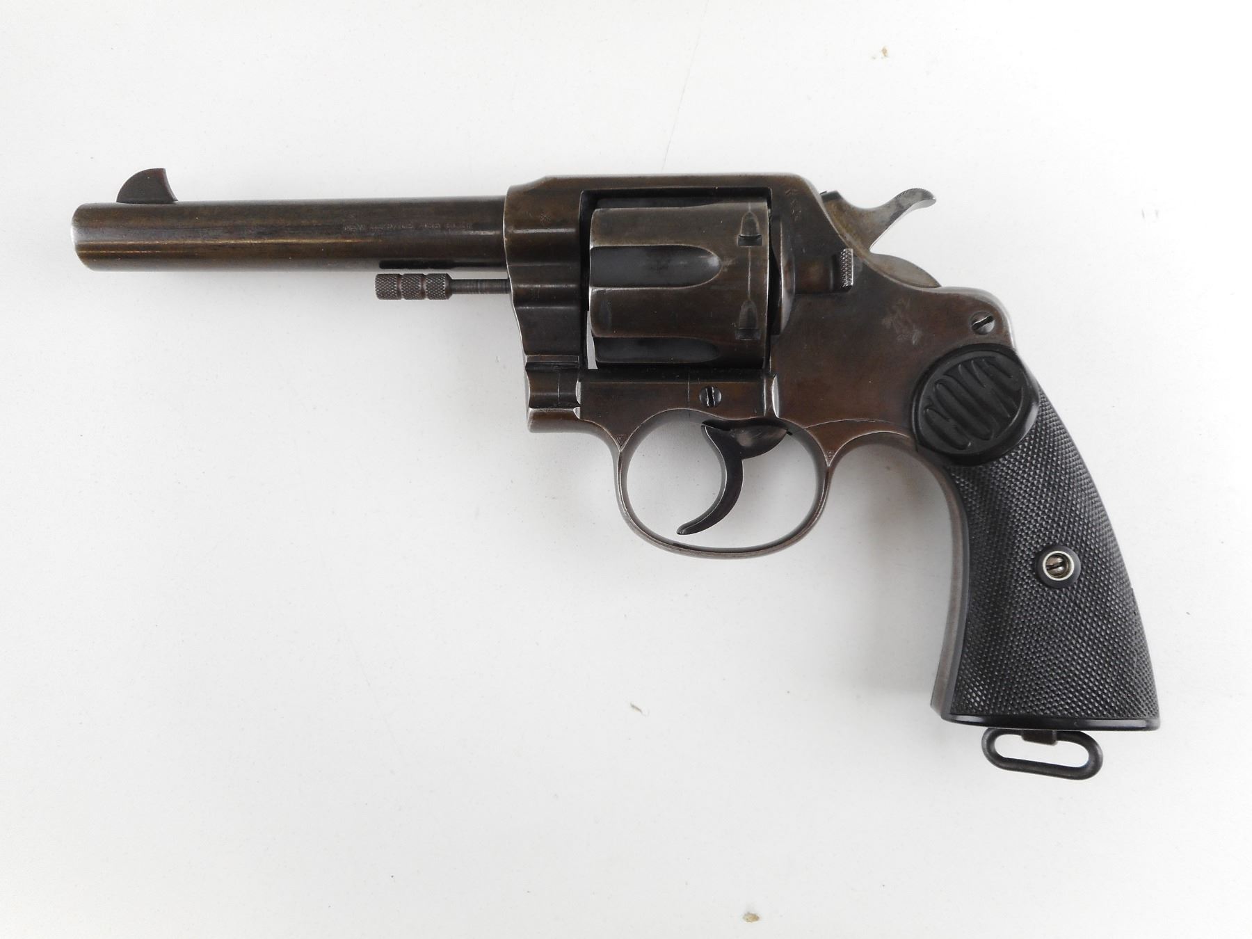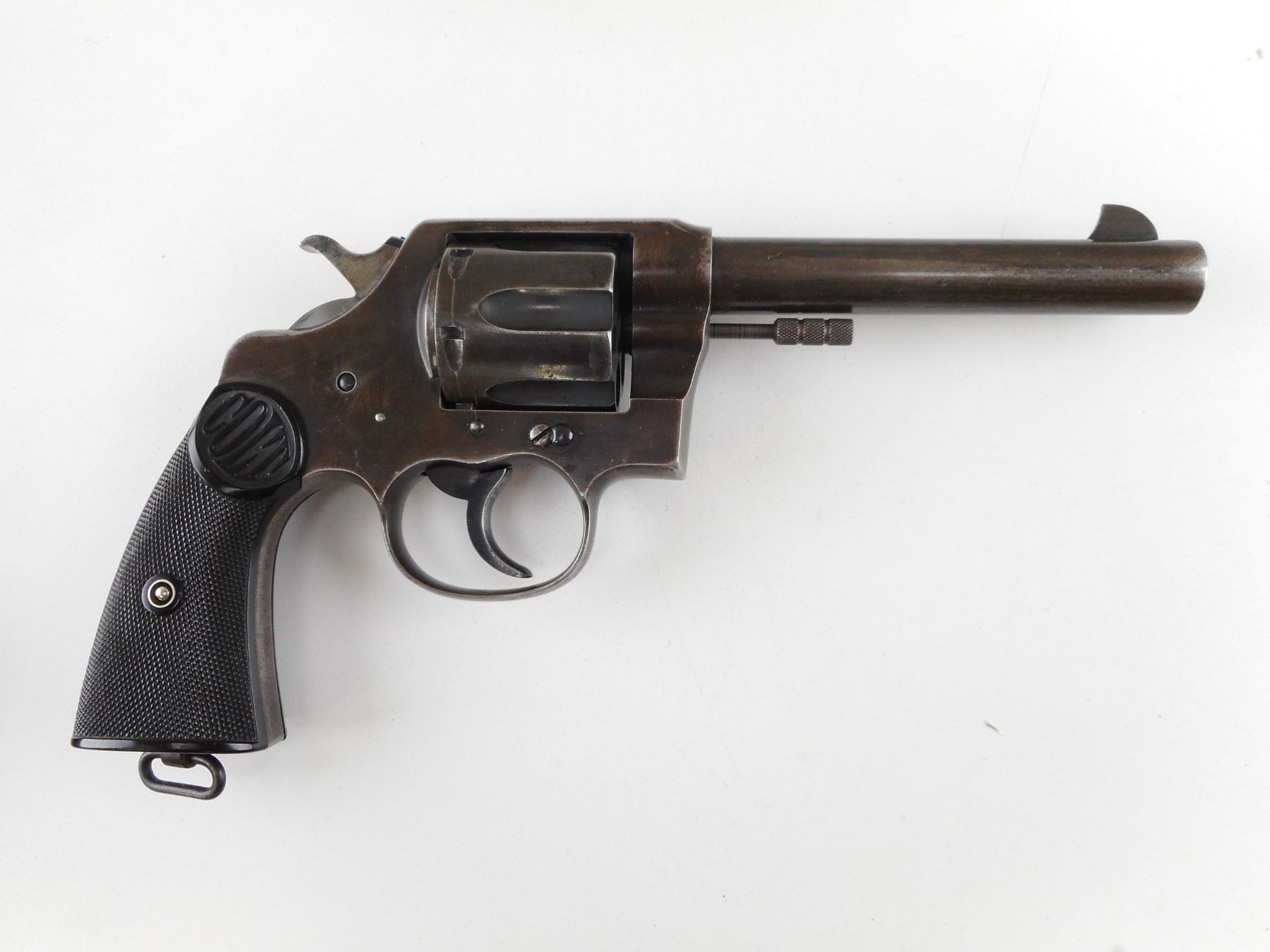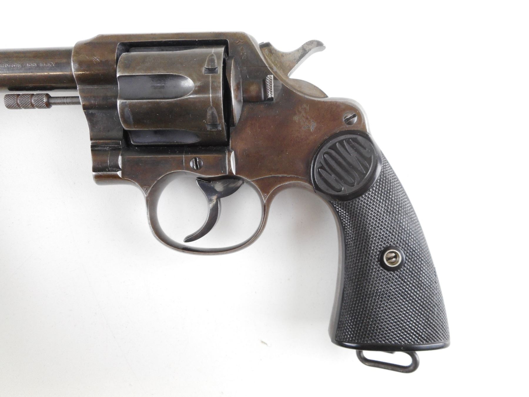 COLT , MODEL: NEW SERVICE , CALIBER: 455 REV , 6 SHOT CAPACITY. BORE IS GOOD. HOLDS COCK, INDEXES WELL, ACTION IS TIGHT. BLADE FRONT AND NOTCH REAR SIGHT. TWO PIECE CHECKERED SYNTHETIC BLACK PLASTIC GRIP PANELS WITH A SMALL CHIP ON THE LEFT PANEL. LANYARD LOOP. VERY LITTLE ORIGINAL FINISH REMAINING. ACTION: REVOLVER , BARREL LENGTH: 140MM , SERIAL # 80938 , CONDITION: 6/10 , CLASS: CANADIAN RESTRICTED CLASS