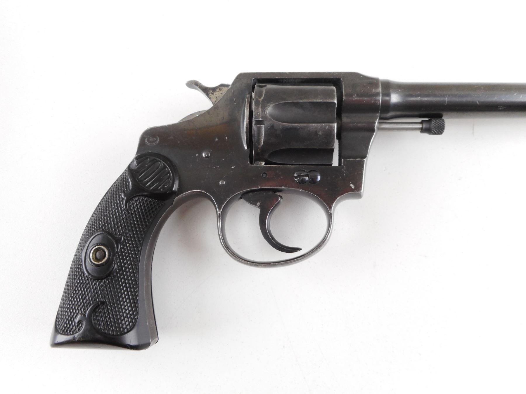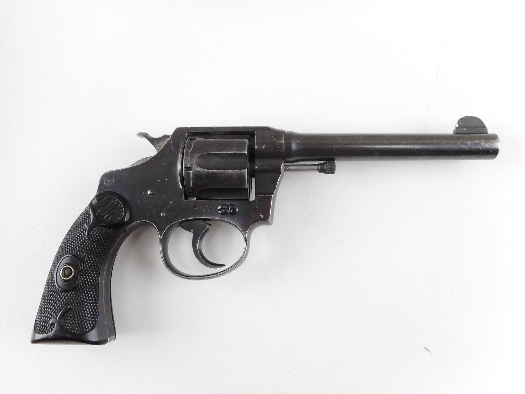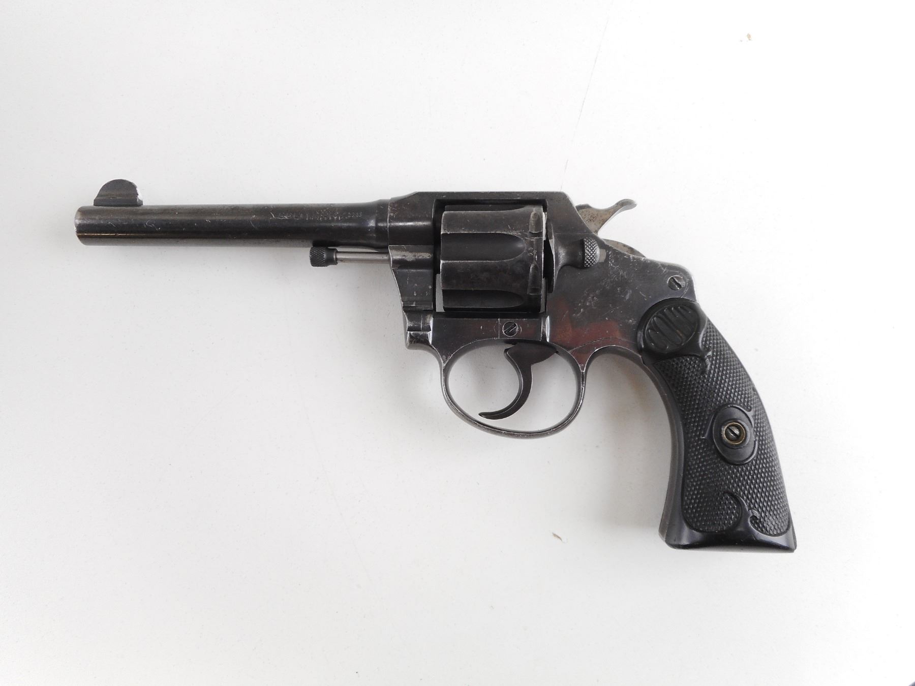 COLT , MODEL: POLICE POSITIVE , CALIBER: 38 S&W , 6 SHOT CAPACITY. BORE IS VERY GOOD. HOLDS COCK, INDEXES WELL, ACTION IS TIGHT. BLADE FRONT AND NOTCH REAR SIGHT. TWO PIECE CHECKERED GRIP PANELS WITH NUMEROUS CRACKS AND CHIPS. SHOWS SOME HANDLING MARKS. ACTION: REVOLVER , BARREL LENGTH: 127MM , SERIAL # 89726 , CONDITION: 5/10 , CLASS: CANADIAN RESTRICTED CLASS