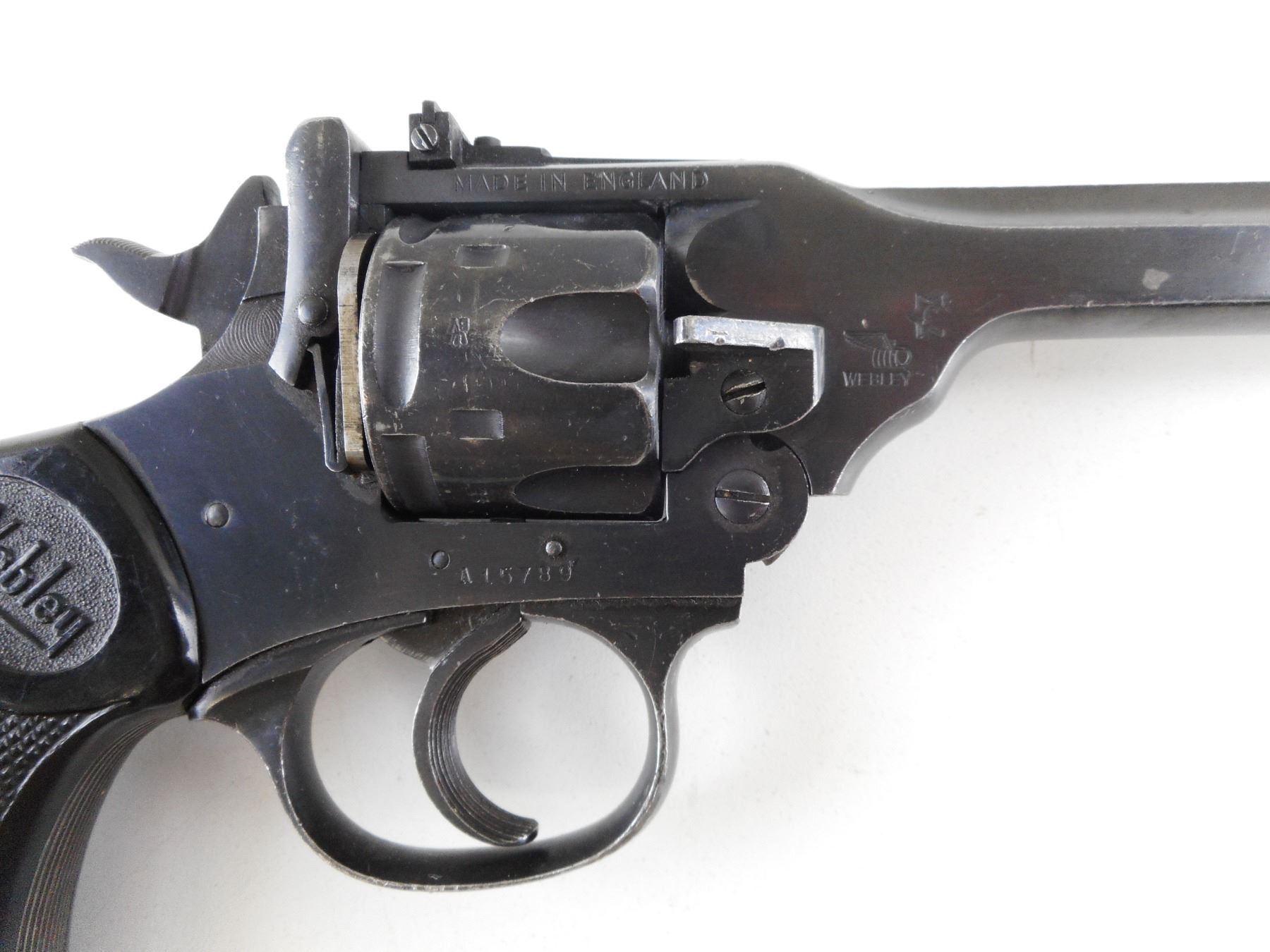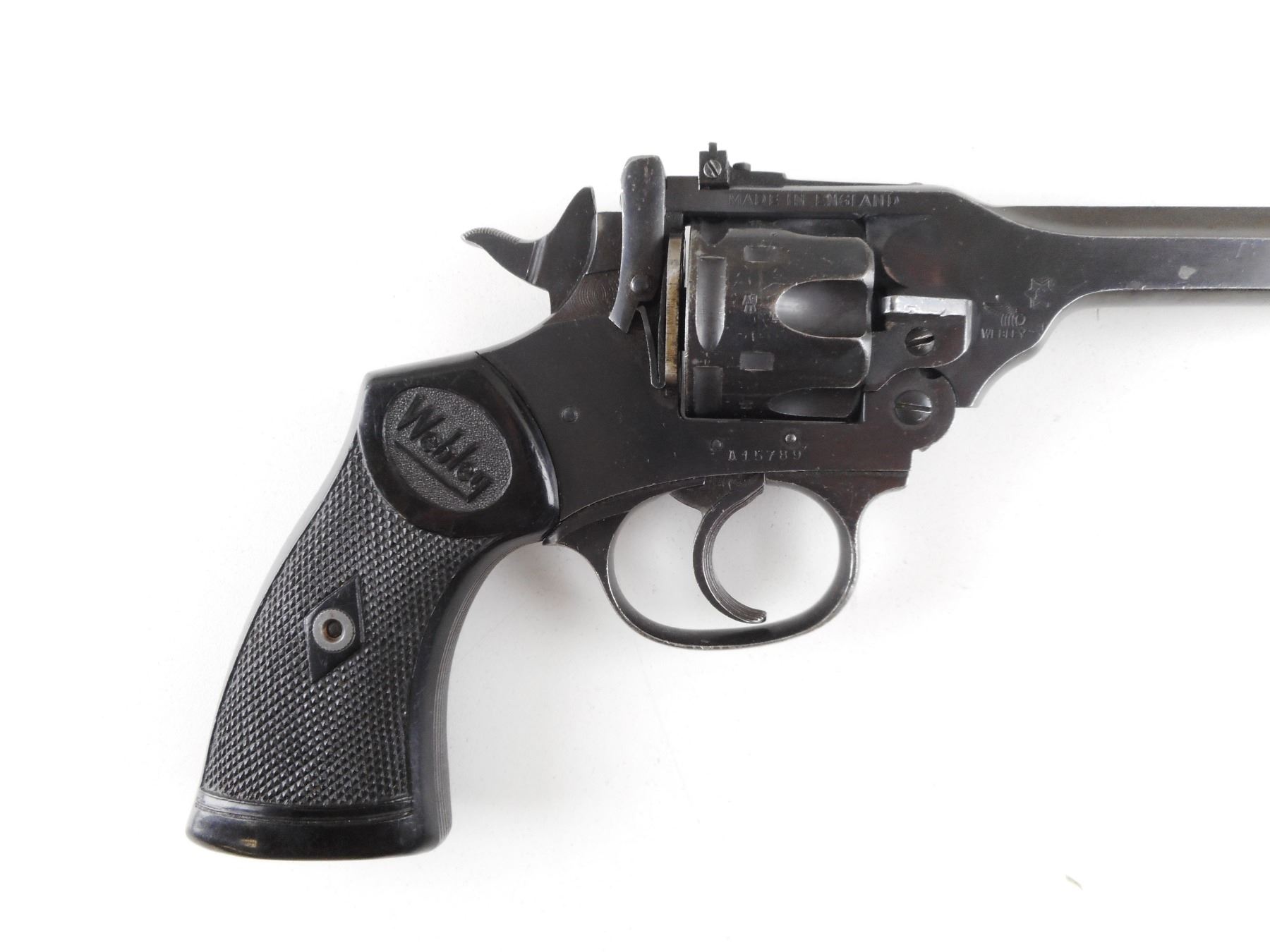 WEBLEY , MODEL: MARK IV POLICE & MILITARY TARGET , CALIBER: 22 LR , 6 SHOT CAPACITY. BORE IS GOOD. HOLDS COCK, INDEXES WELL, ACTION IS TIGHT. BLADE FRONT AND ADJUSTABLE REAR SIGHT. CHECKERED BLACK GRIP PANELS WITH WEBLEY LOGO. SHOWS SOME HANDLING MARKS. ACTION: REVOLVER , BARREL LENGTH: 152MM , SERIAL # A15789 , CONDITION: 6/10 , CLASS: CANADIAN RESTRICTED CLASS