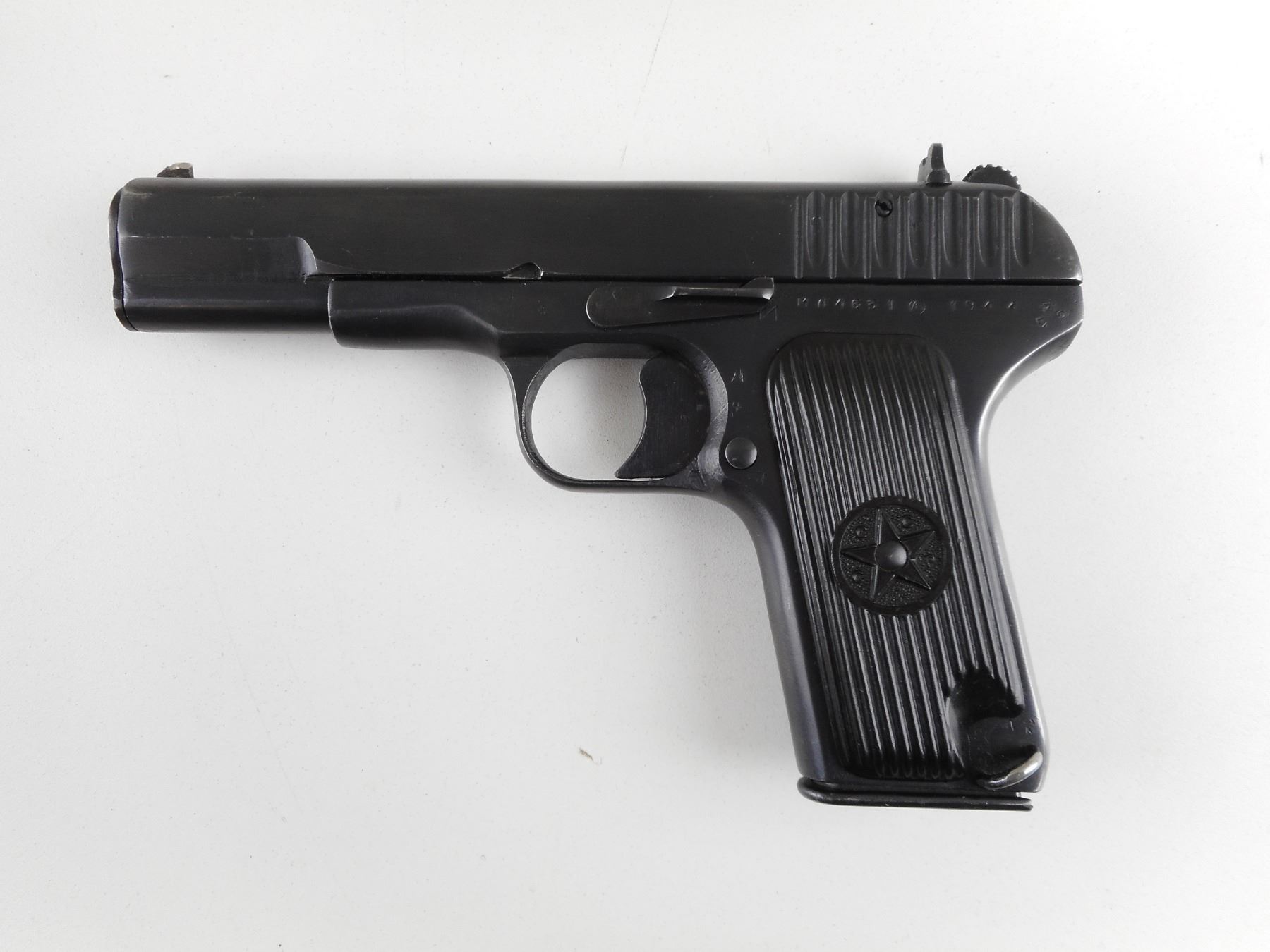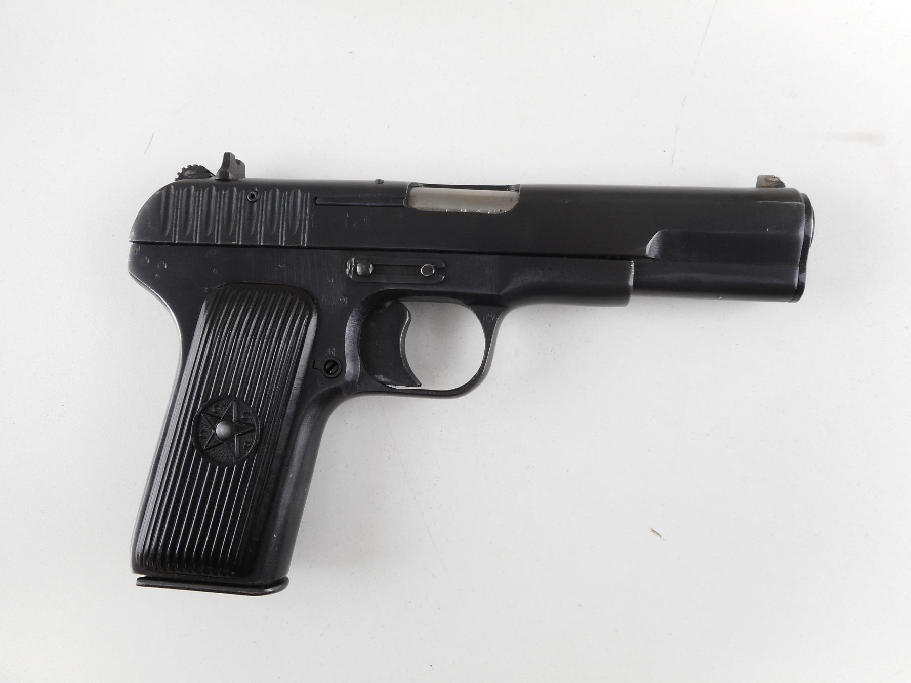 TOKAREV , MODEL: TT33 , CALIBER: 7.62 X 25 TOKAREV , COMES WITH MAGAZINE. TULA ARSENAL , DATED 1944, SLIDE, MAGAZINE AND RECEIVER ARE MATCHING BY SERIAL#. BORE IS VERY GOOD. BLADE FRONT(REPAIRED) AND RAISED NOTCH REAR SIGHT. BLACK PLASTIC GRIPS WITH LANYARD LOOP. SHOWS SOME HANDLING MARKS. ACTION: SEMI-AUTOMATIC HANDGUN , BARREL LENGTH: 115MM , SERIAL # MA4631 , CONDITION: 7/10 , CLASS: CANADIAN RESTRICTED CLASS