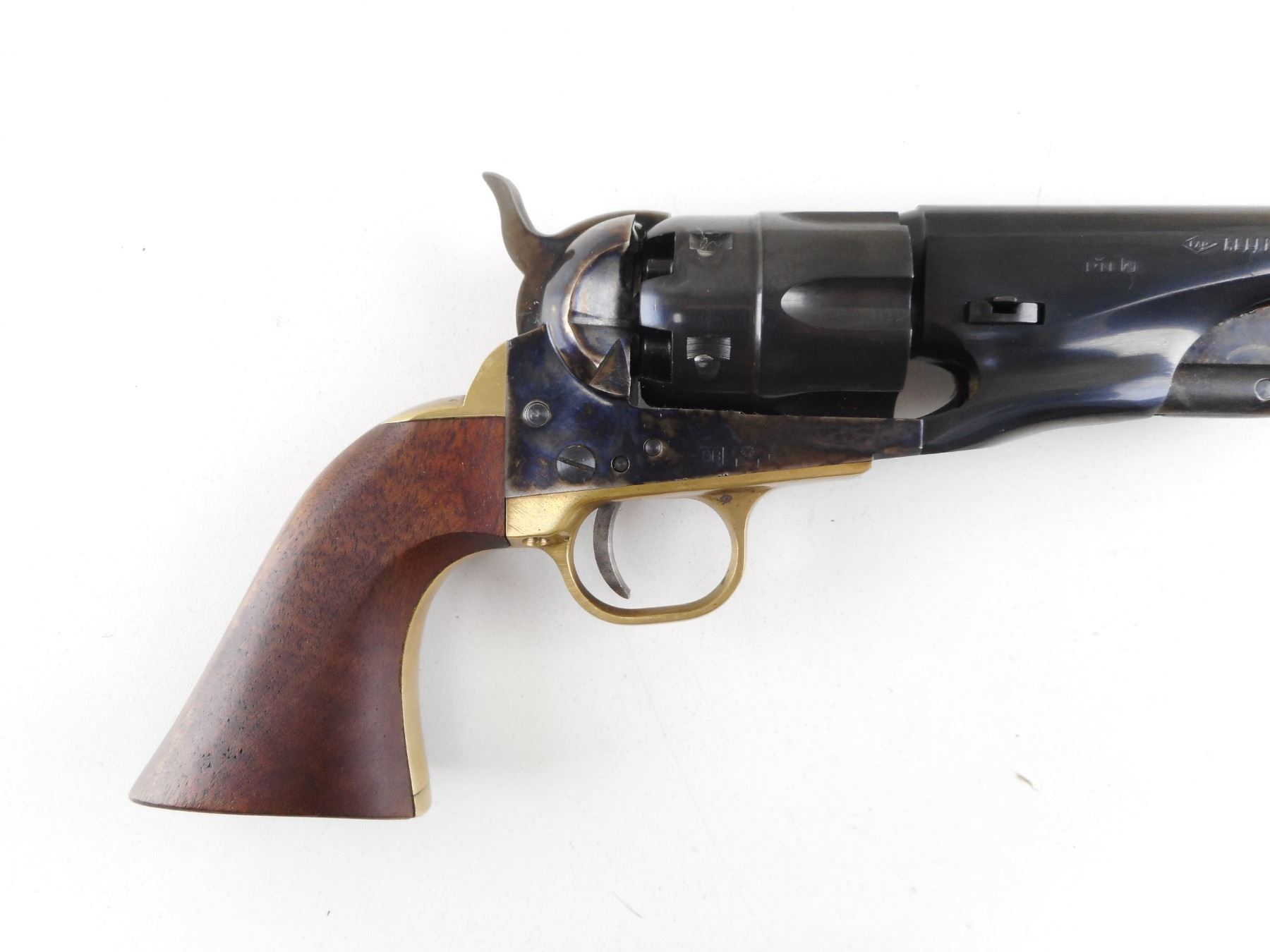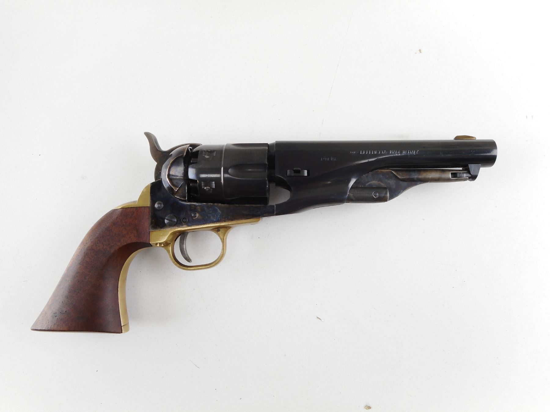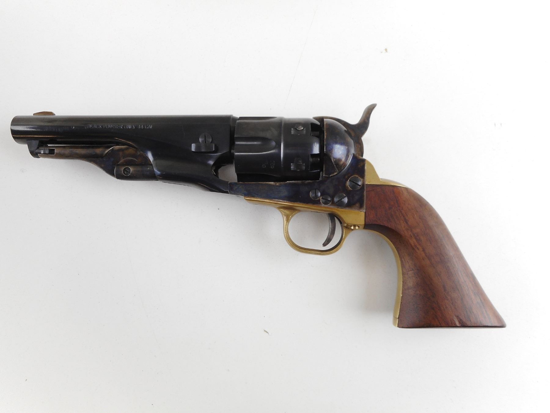 PIETTA , MODEL: COLT 1862 POLICE REPRODUCTION , CALIBER: 44 CAL PERC , 6 SHOT CAPACITY. BORE IS VERY GOOD. BLADE FRONT AND NOTCH HAMMER REAR SIGHT. TWO PIECE PLAIN WOOD GRIP PANELS. RICHLY CASE HARDENED RECEIVER. SHOWS VERY LITTLE HANDLING MARKS. ACTION: REVOLVER , BARREL LENGTH: 140MM , SERIAL # P93895 , CONDITION: 7/10 , CLASS: CANADIAN RESTRICTED CLASS
