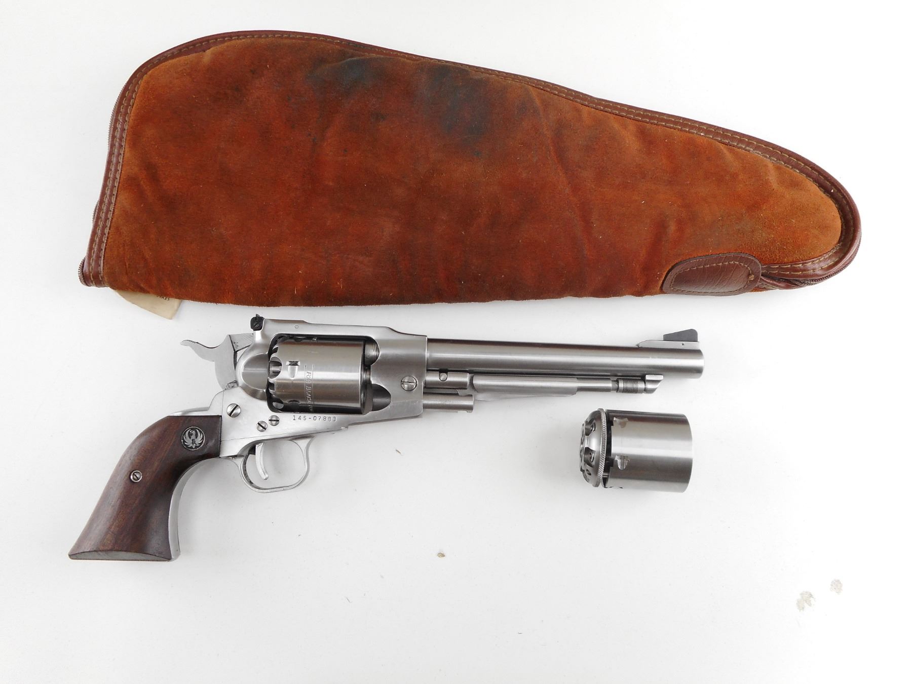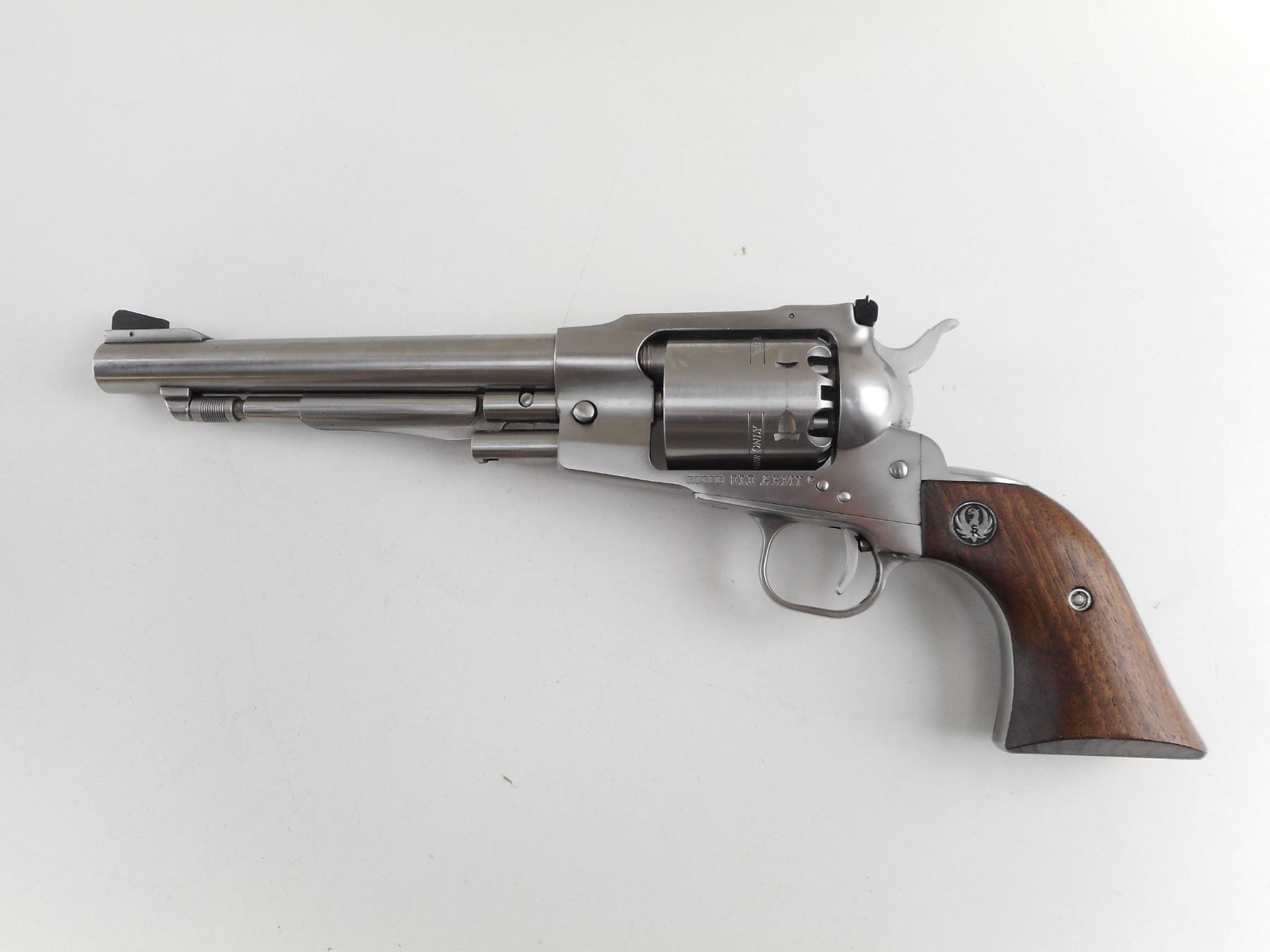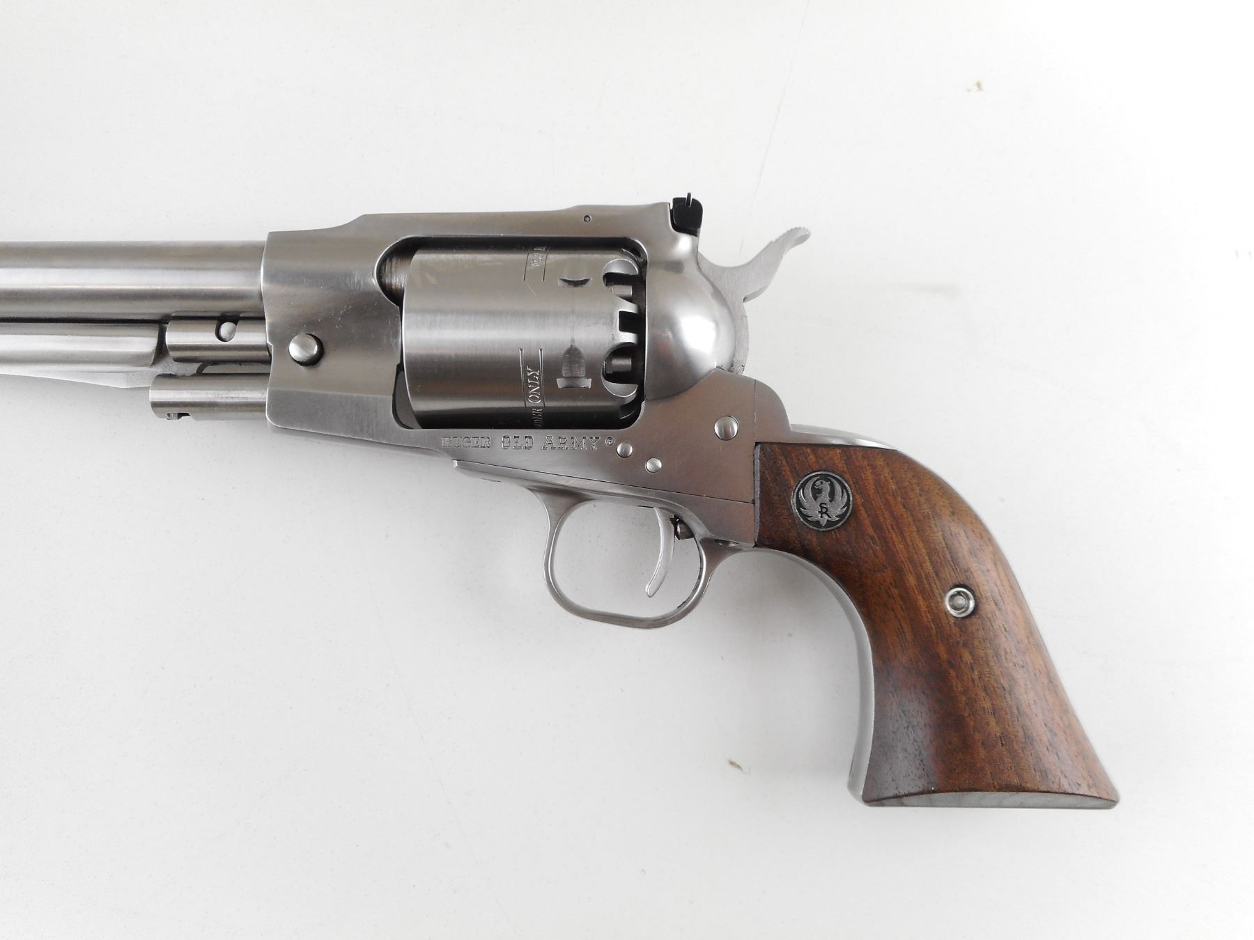 RUGER , MODEL: OLD ARMY , CALIBER: 45 CAL PERC & 45 LONG COLT , COMES WITH SOFT LEATHER PISTOL CASE, AND 45 LONG COLT CYLINDER, THIS WILL CONVERT THIS REVOLVER FROM A MUZZLE LOADER TO A CARTRIDGE GUN (45 CAL PERC CYLINDER IS CURRENTLY INSTALLED). 6 SHOT CAPACITY. BORE IS GOOD . STAINLESS STEEL FINISH. HOLDS COCK, INDEXES WELL, ACTION IS TIGHT. BLADE FRONT AND ADJUSTABLE REAR SIGHT. TWO PIECE HARDWOOD GRIPS WITH RUGER LOGO. SHOWS VERY LITTLE HANDLING MARKS. ACTION: REVOLVER , BARREL LENGTH: 191MM , SERIAL # 14507883 , CONDITION: 7/10 , CLASS: CANADIAN RESTRICTED CLASS