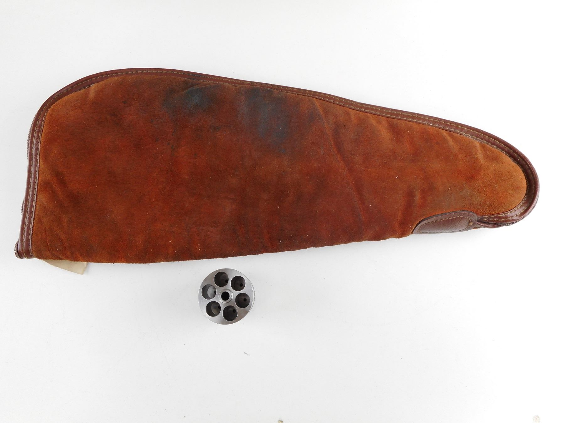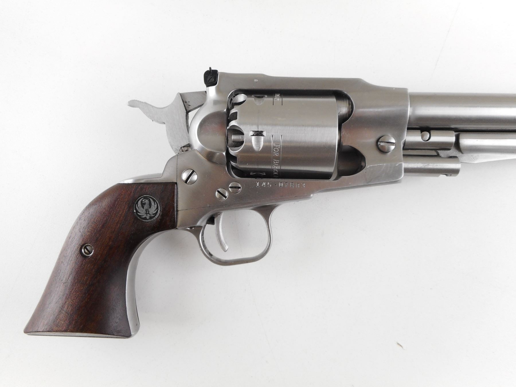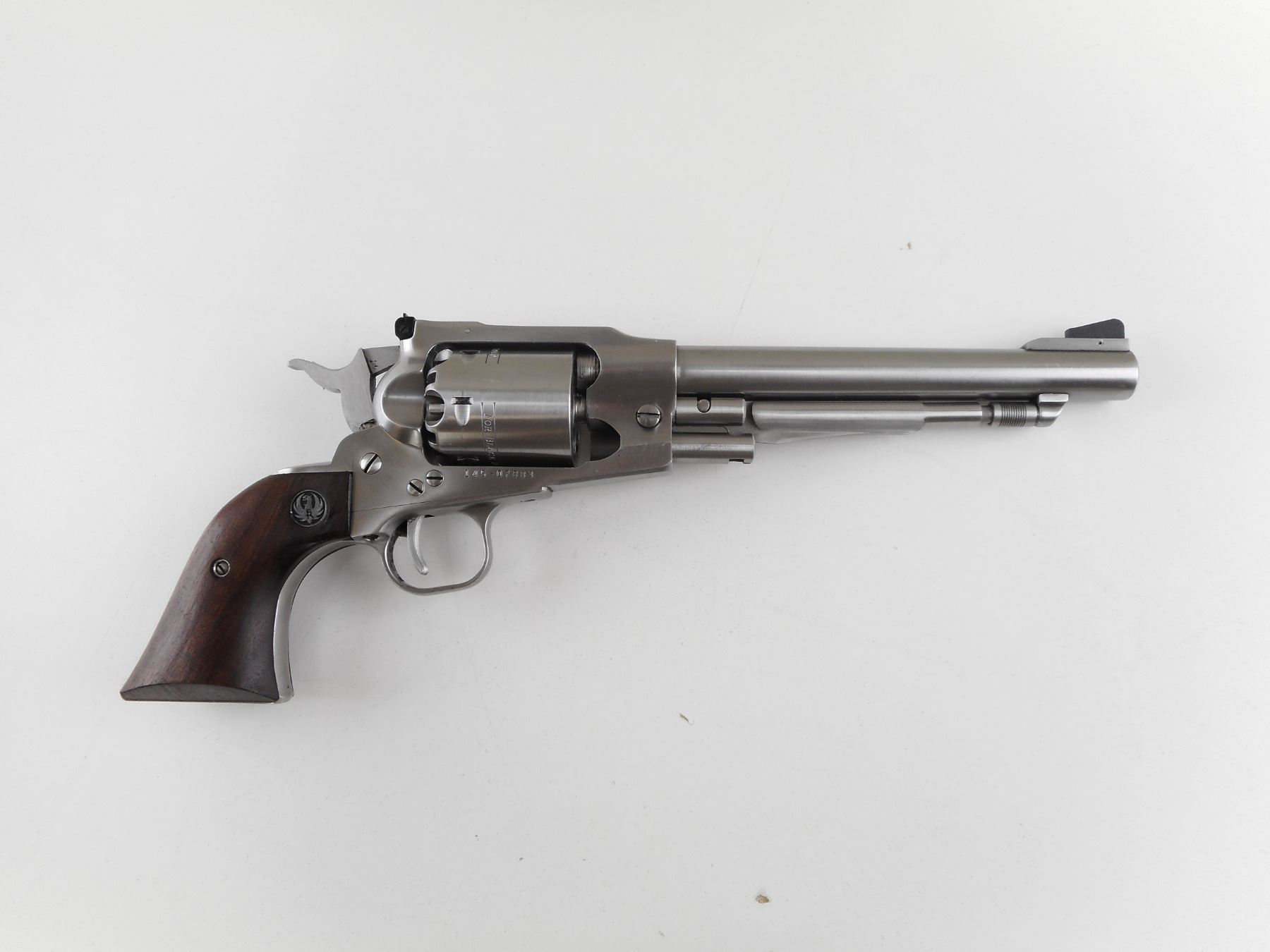 RUGER , MODEL: OLD ARMY , CALIBER: 45 CAL PERC & 45 LONG COLT , COMES WITH SOFT LEATHER PISTOL CASE, AND 45 LONG COLT CYLINDER, THIS WILL CONVERT THIS REVOLVER FROM A MUZZLE LOADER TO A CARTRIDGE GUN (45 CAL PERC CYLINDER IS CURRENTLY INSTALLED). 6 SHOT CAPACITY. BORE IS GOOD . STAINLESS STEEL FINISH. HOLDS COCK, INDEXES WELL, ACTION IS TIGHT. BLADE FRONT AND ADJUSTABLE REAR SIGHT. TWO PIECE HARDWOOD GRIPS WITH RUGER LOGO. SHOWS VERY LITTLE HANDLING MARKS. ACTION: REVOLVER , BARREL LENGTH: 191MM , SERIAL # 14507883 , CONDITION: 7/10 , CLASS: CANADIAN RESTRICTED CLASS