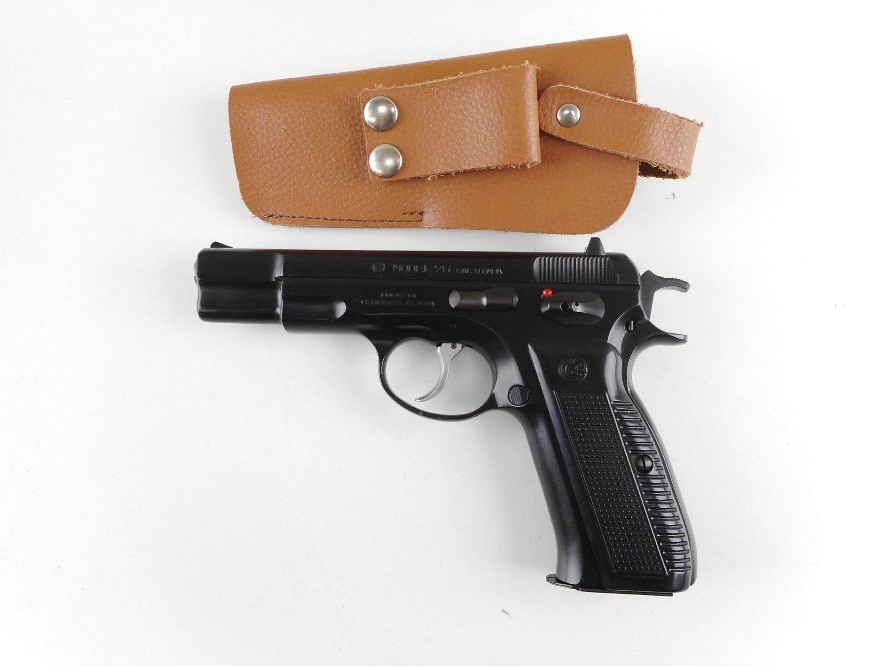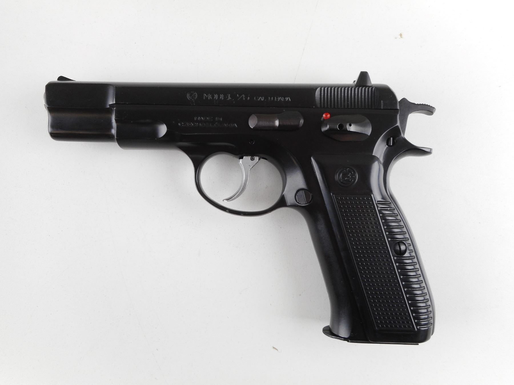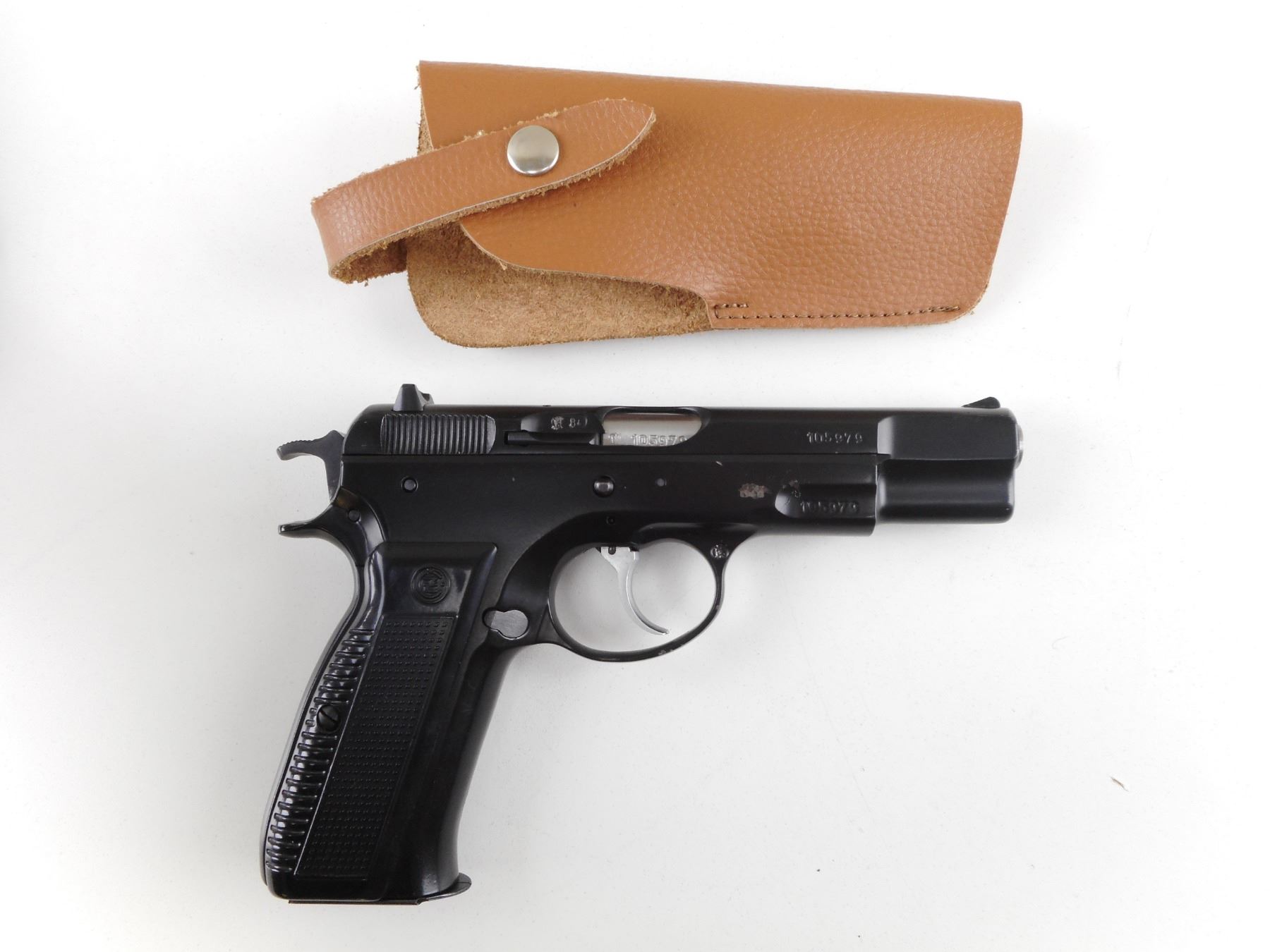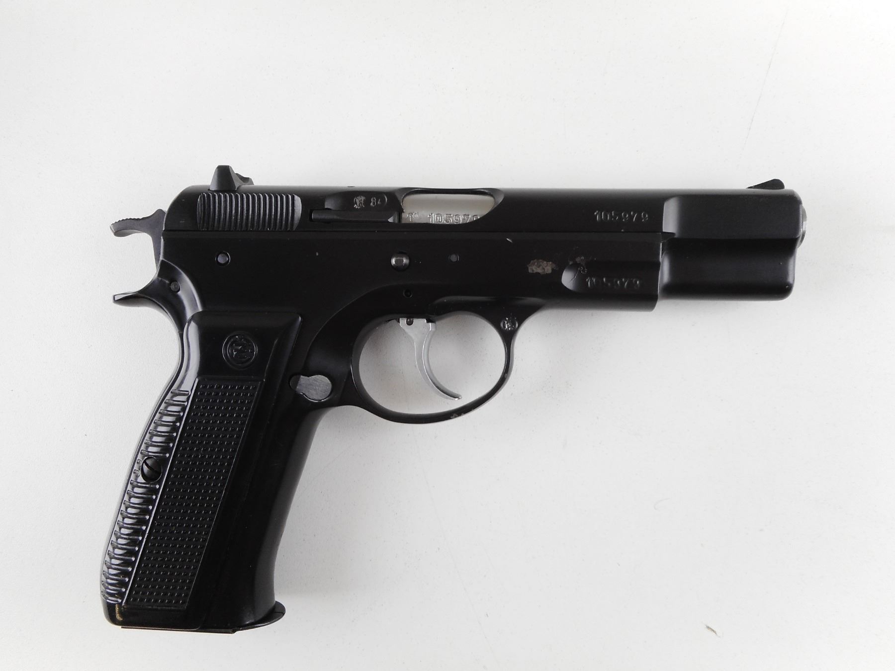 CZ , MODEL: CZ75 , CALIBER: 9MM LUGER , COMES WITH HOLSTER AND MAGAZINE. BORE IS VERY GOOD. BLADE FRONT AND RAISED NOTCH REAR SIGHTS. TWO PIECE BLACK PLASTIC GRIPS WITH CZ LOGO. SHOWS VERY LITTLE HANDLING MARKS. ACTION: SEMI-AUTOMATIC HANDGUN , BARREL LENGTH: 114MM , SERIAL # 105979 , CONDITION: 7/10 , CLASS: CANADIAN RESTRICTED CLASS