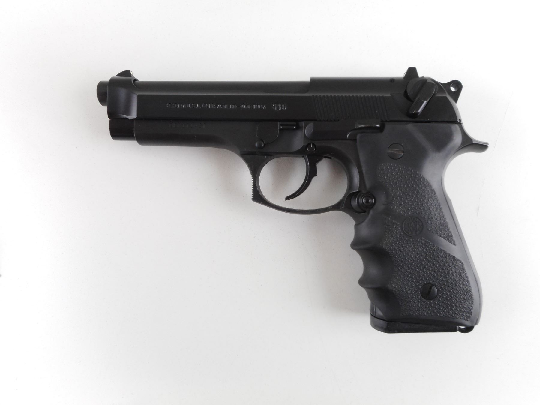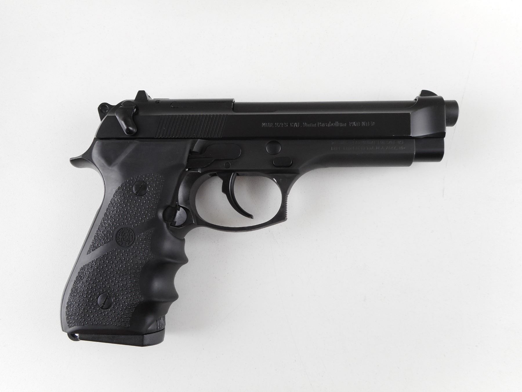BERETTA , MODEL: 92FS , CALIBER: 9MM LUGER , COMES WITH MAGAZINE. BORE IS EXCELLENT. BLADE FRONT SIGHT WITH WHITE DOT. U NOTCH REAR SIGHT WITH DOTS. MATTE FINISH ON METAL PARTS. HOGUE FINGER GROOVE RUBBER GRIPS. SHOWS SLIGHT HANDLING MARKS AND WEAR. ACTION: SEMI-AUTOMATIC HANDGUN , BARREL LENGTH: 125MM , SERIAL # BER171457 , CONDITION: 9/10 , CLASS: CANADIAN RESTRICTED CLASS