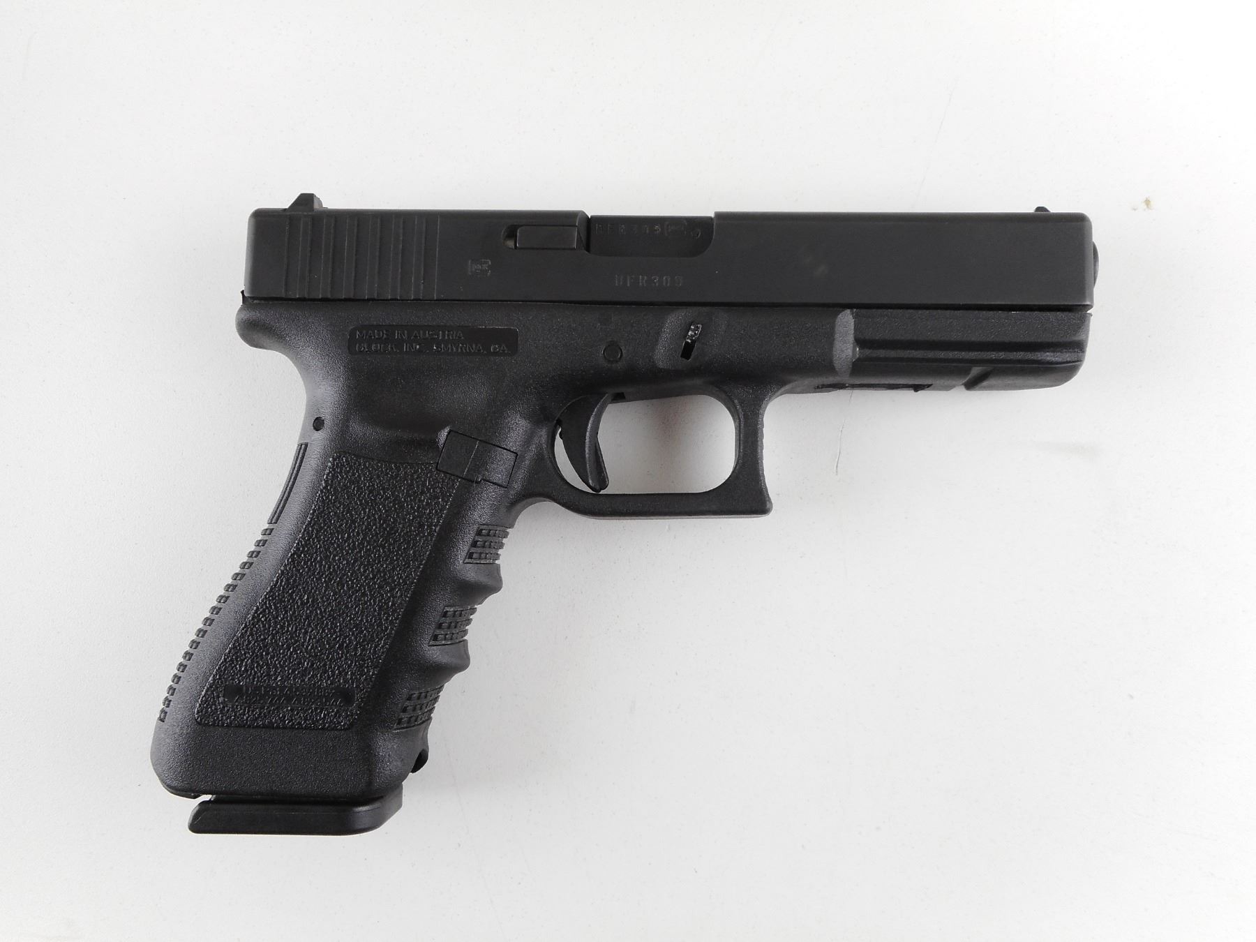 GLOCK , MODEL: 17 , CALIBER: 9MM LUGER , COMES WITH MAGAZINE. BORE IS EXCELLENT. SERIAL # IS MARKED ON THE SLIDE AND BARREL ONLY. WHITE DOT BLADE FRONT SIGHT. WHITE OUTLINE U NOTCH REAR SIGHT. POLYMER FRAME. RAIL ON THE FRONT. FACTORY MAGAZINE. SHOWS SOME HANDLING MARKS AND WEAR. ACTION: SEMI-AUTOMATIC HANDGUN , BARREL LENGTH: 114MM , SERIAL # DFR309US , CONDITION: 8/10 , CLASS: CANADIAN RESTRICTED CLASS