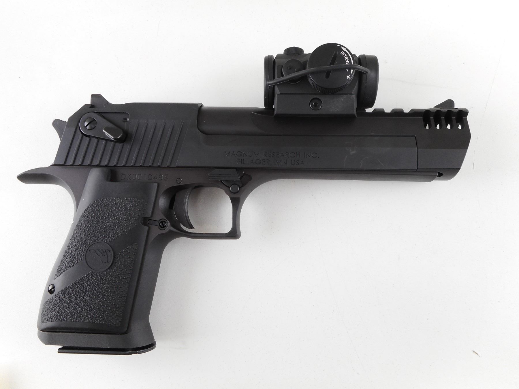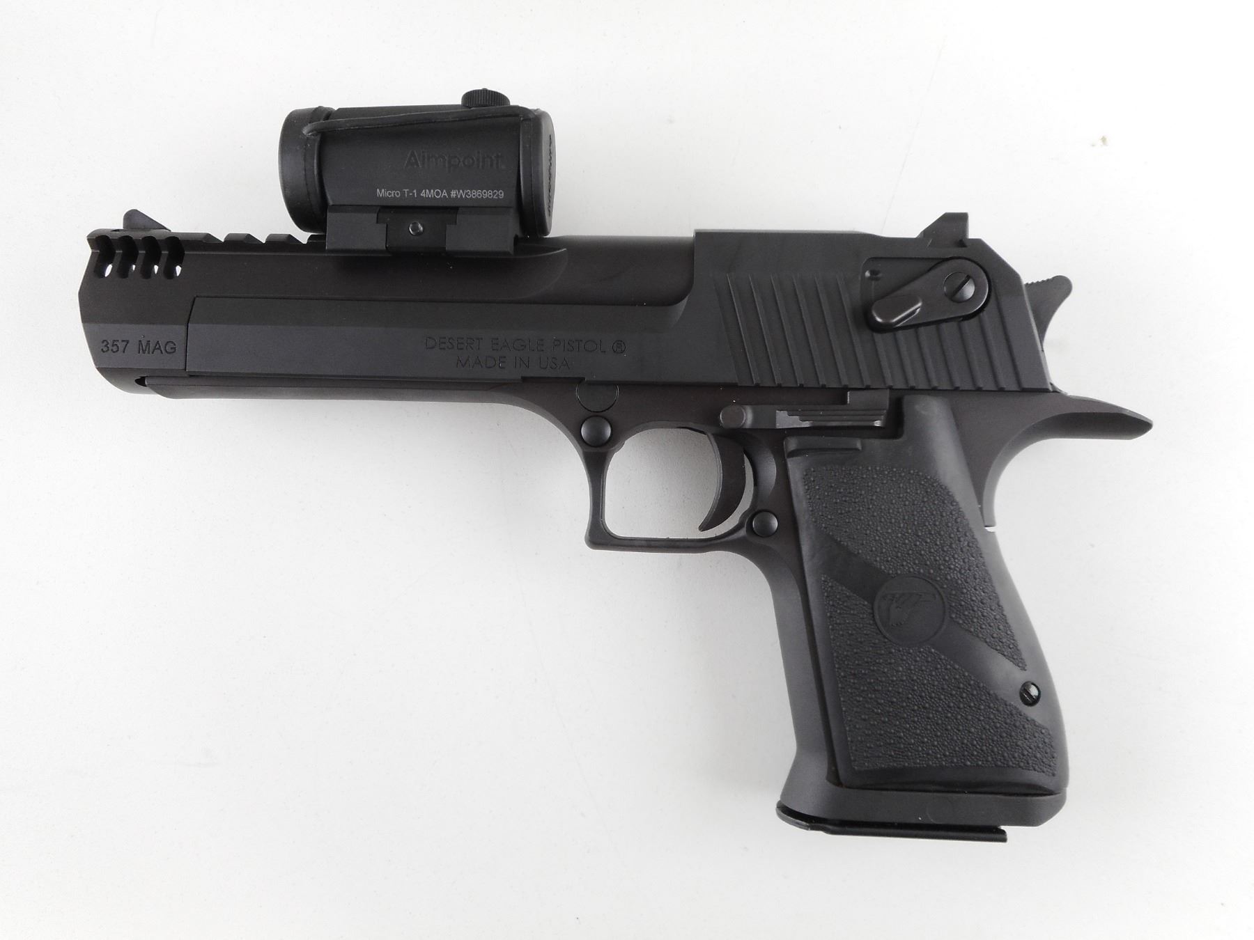 MAGNUM RESEARCH , MODEL: DESERT EAGLE , CALIBER: 357 MAG , COMES WITH MAGAZINE. BORE IS EXCELLENT. AIMPOINT MICRO T1 4MOA REDDOT SIGHT (WORKING). BLADE FRONT SIGHT. U NOTCH REAR SIGHT. INTEGRAL RAIL ON BARREL. BLACK MATTE FINISH ON METAL PARTS. TEXTURED BLACK RUBBER GRIPS. SHOWS SLIGHT HANDLING MARKS AND WEAR. ACTION: SEMI-AUTOMATIC HANDGUN , BARREL LENGTH: 152MM , SERIAL # DK0018485 , CONDITION: 9/10 , CLASS: CANADIAN RESTRICTED CLASS