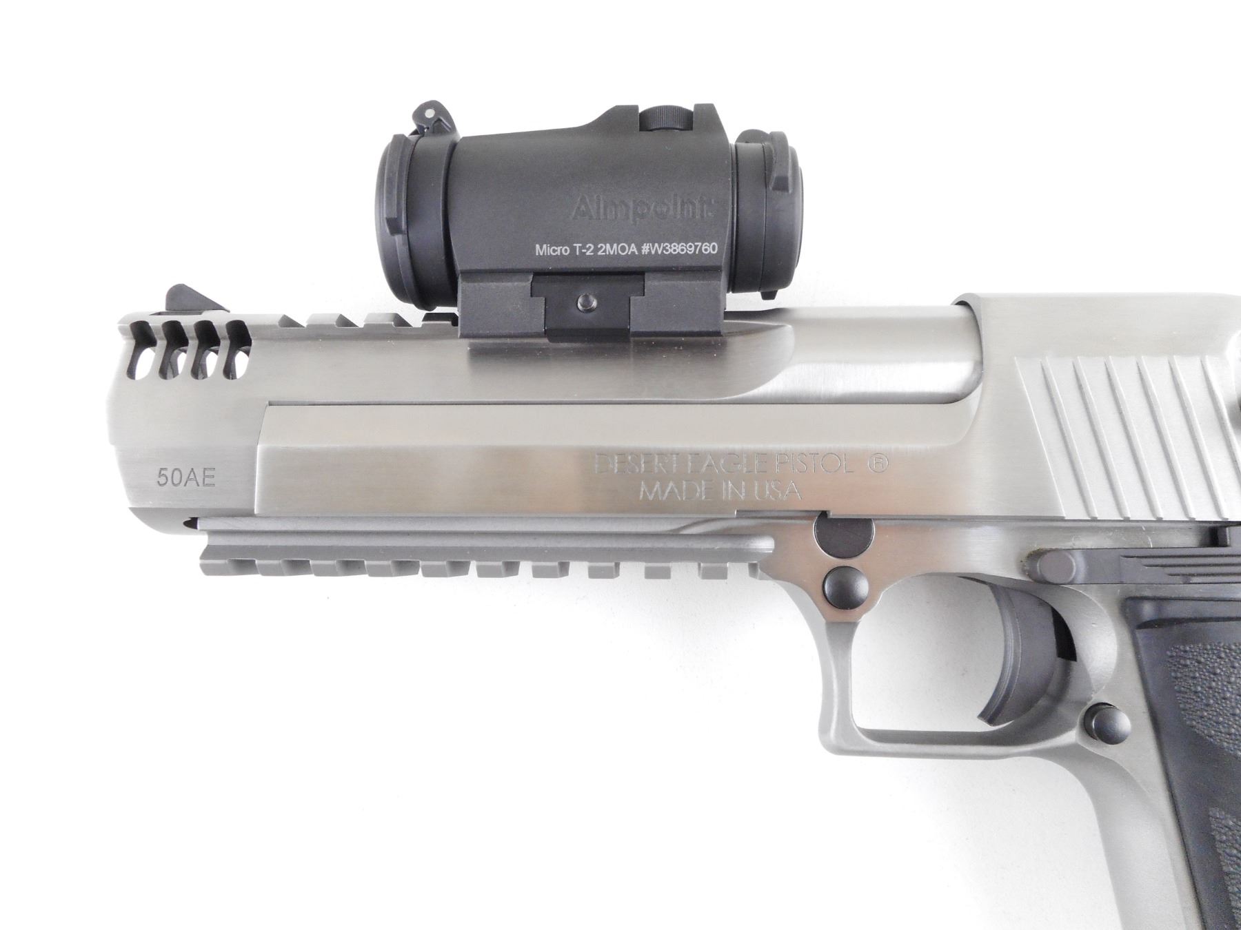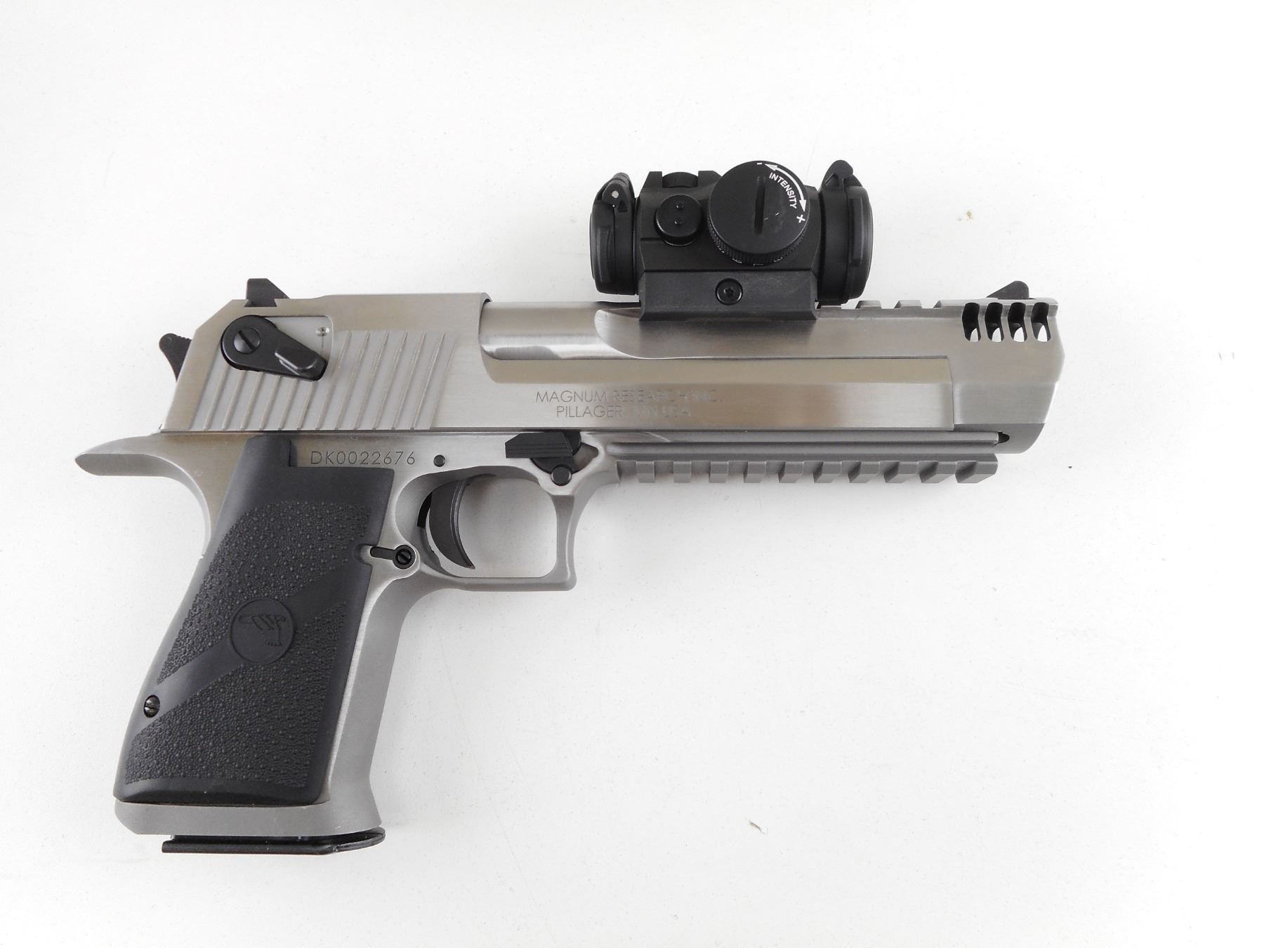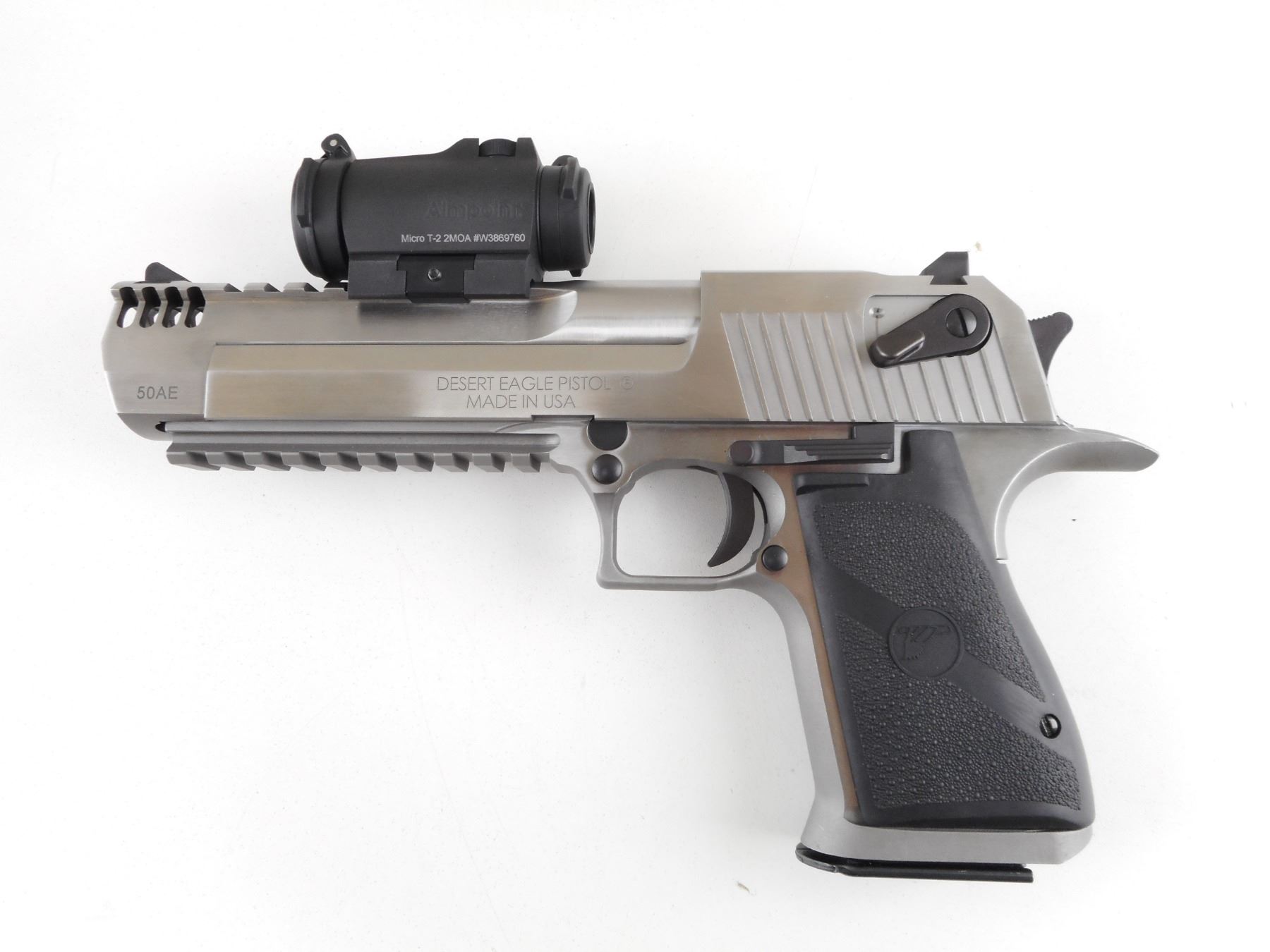 MAGNUM RESEARCH , MODEL: DESERT EAGLE , CALIBER: 50 AE , COMES WITH MAGAZINE. BORE IS EXCELLENT. AIMPOINT MICRO T1 2MOA REDDOT SIGHT (WORKING). BLADE FRONT SIGHT. U NOTCH REAR SIGHT. INTEGRAL RAIL ON BARREL, AND FRONT OF FRAME. STAINLESS FINISH ON METAL PARTS. TEXTURED BLACK RUBBER GRIPS. SHOWS SLIGHT HANDLING MARKS AND WEAR. ACTION: SEMI-AUTOMATIC HANDGUN , BARREL LENGTH: 152MM , SERIAL # DK0022676 , CONDITION: 9/10 , CLASS: CANADIAN RESTRICTED CLASS
