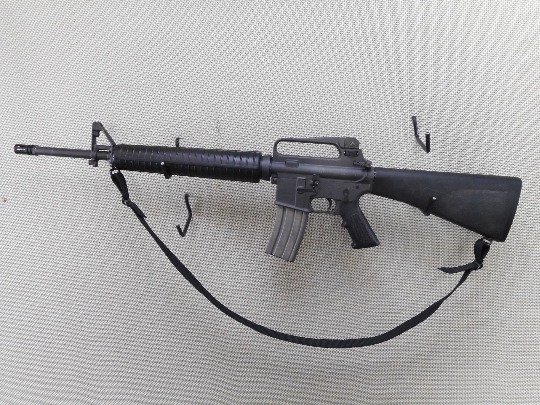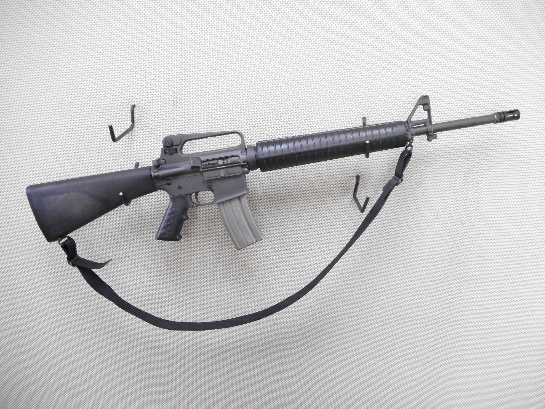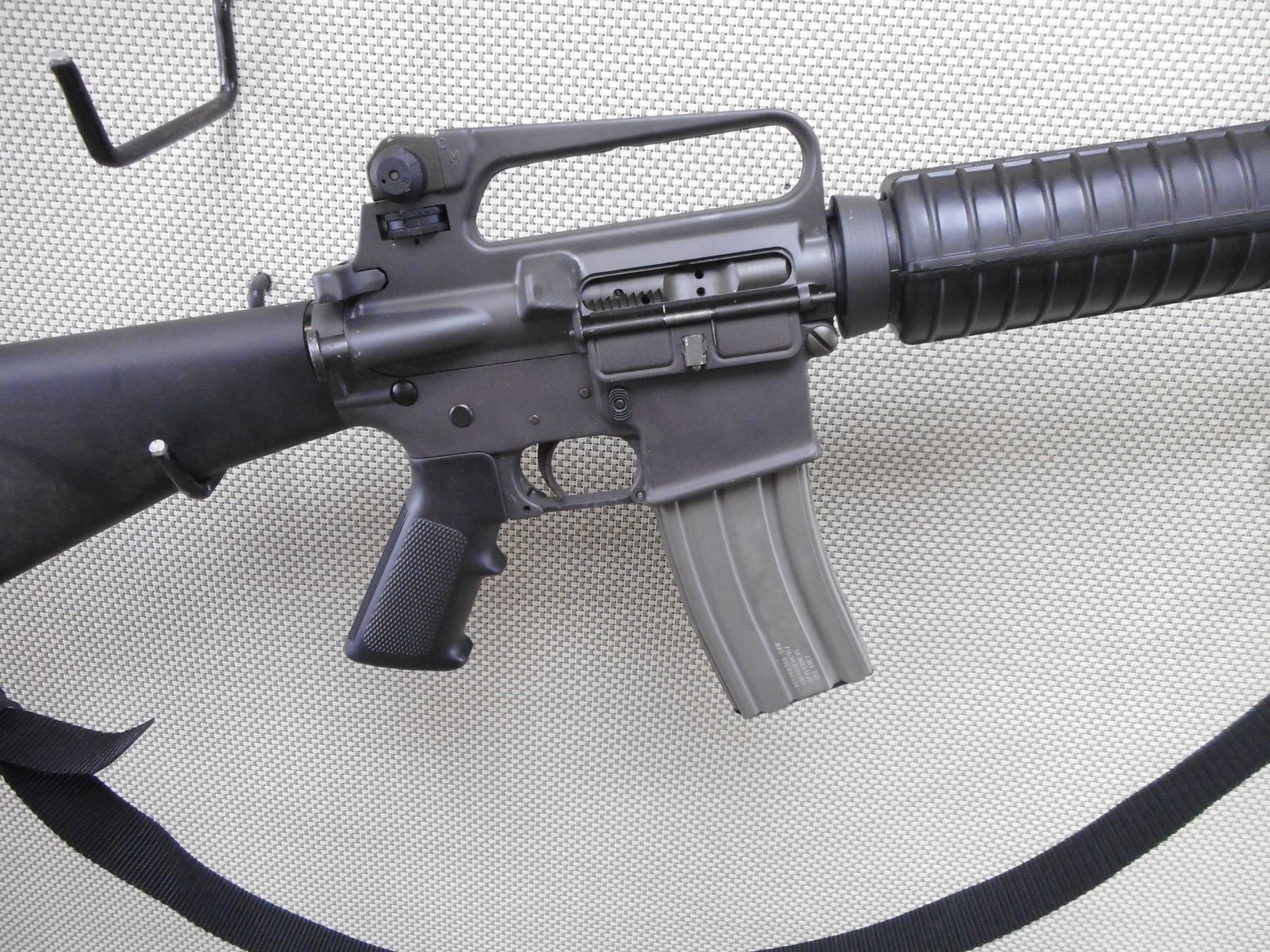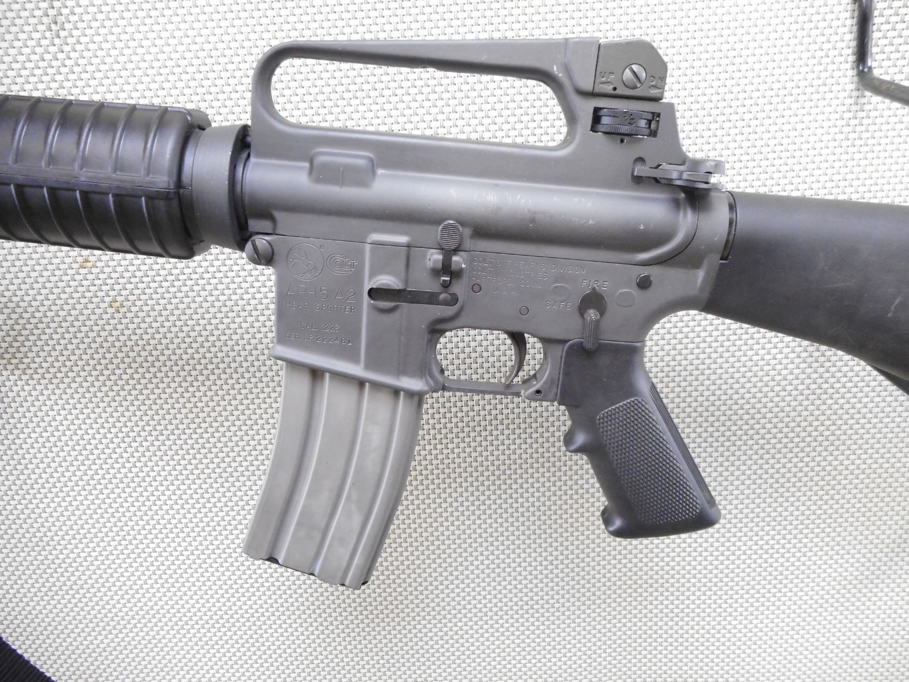 COLT , MODEL: AR15A2 SPORTER HBAR , CALIBER: 223 REM , COMES WITH MAGAZINE. BORE IS EXCELLENT. POST FRONT SIGHT WITH EARS. FIXED CARRY HANDLE WITH ADJUSTABLE A2 SIGHT. FLASH HIDER. 1/7 TWIST ON THE BARREL. FULL LENGTH HAND GUARDS. FIXED BUTT STOCK WITH TRAP. SLING SWIVELS. BLACK NYLON SLING. SOME HANDING MARKS AND WEAR. ACTION: SEMI AUTOMATIC RIFLE , BARREL LENGTH: 508MM , SERIAL # SP222481 , CONDITION: 7/10 , CLASS: CANADIAN RESTRICTED CLASS
