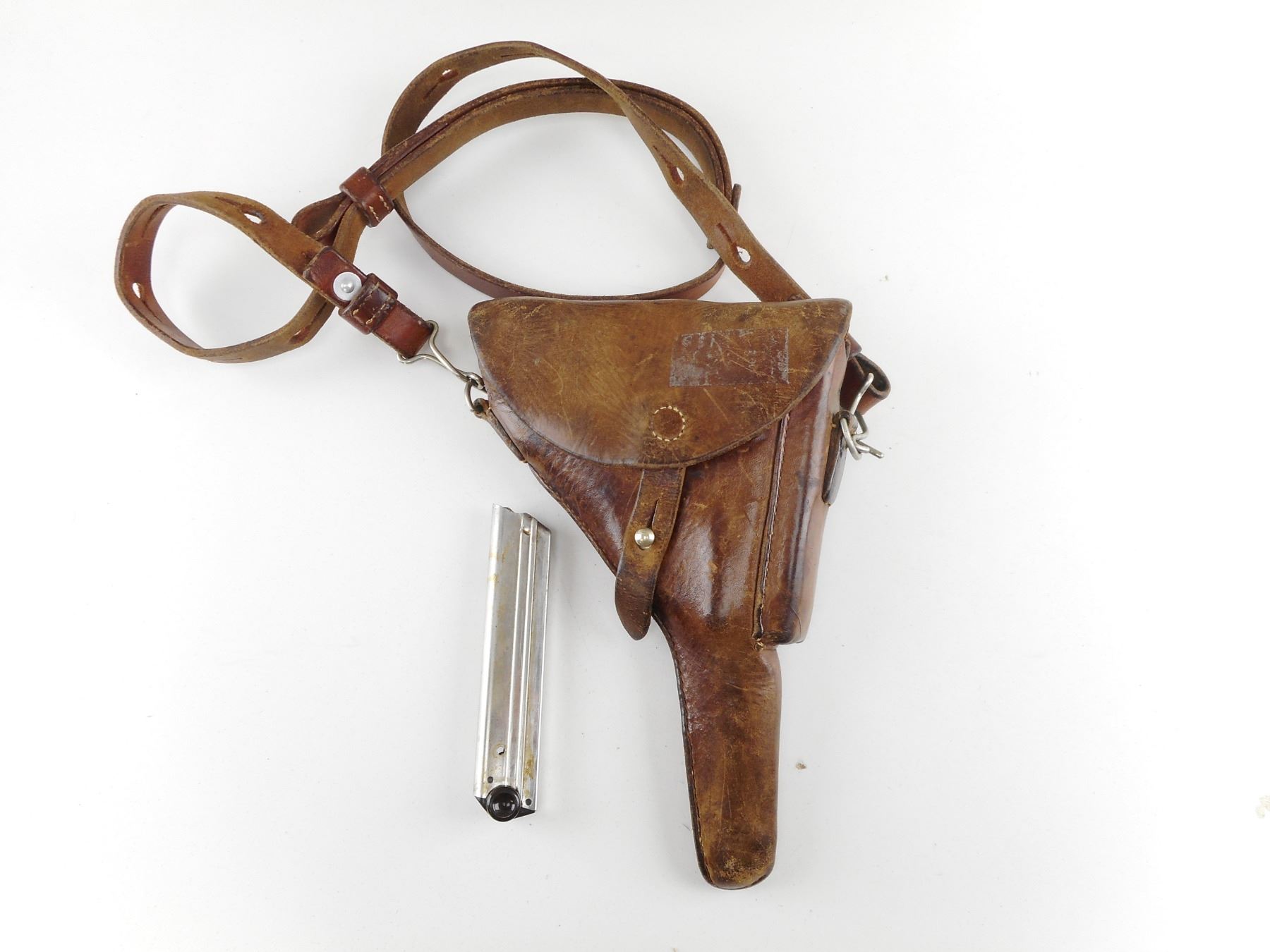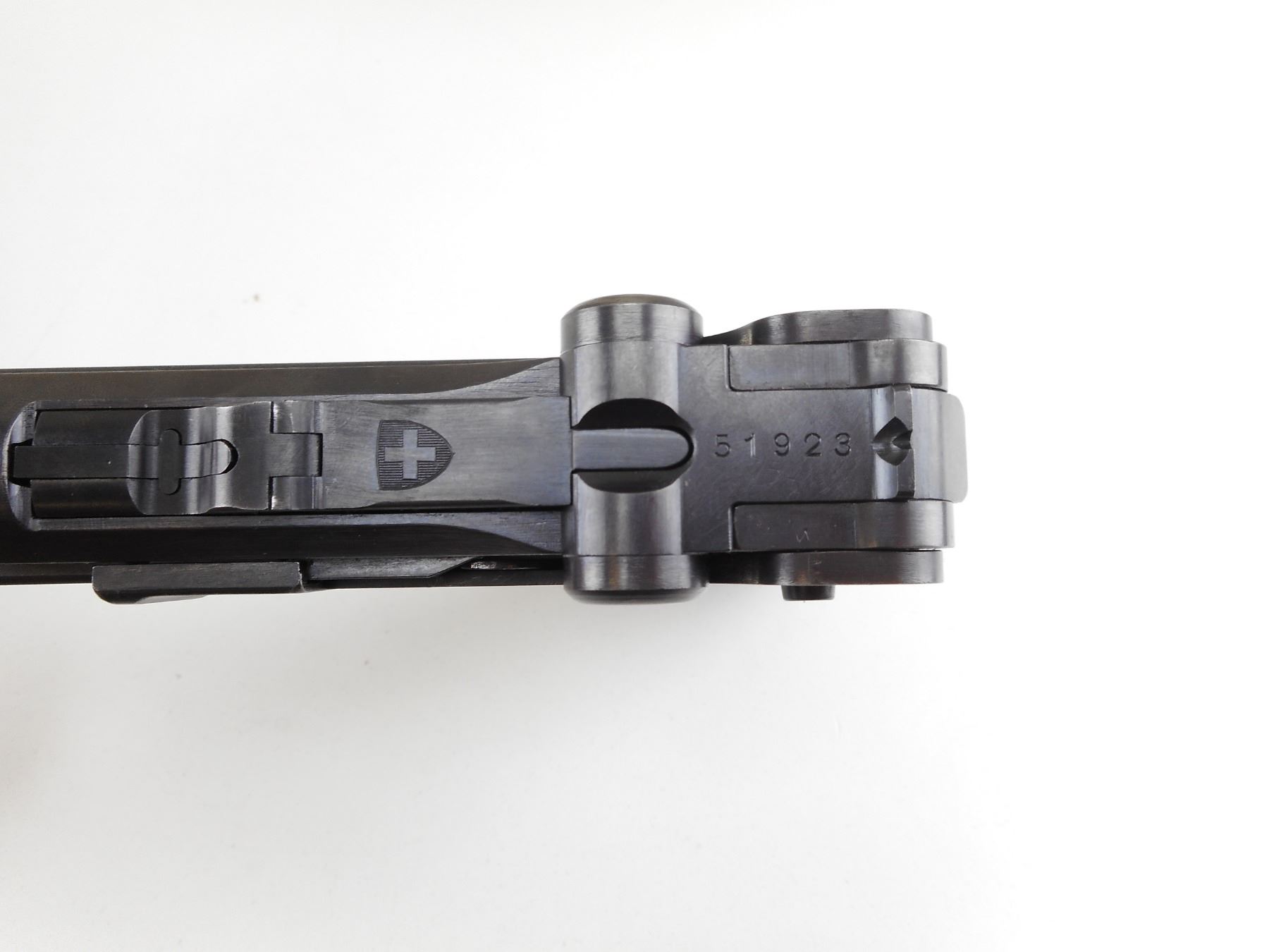 LUGER , MODEL: 1929 SWISS , CALIBER: 30 CAL LUGER , COMES WITH 2 MAGAZINES SILVER COLOUR WITH BROWN POLYMER BOTTOM AND SWISS PROOF ON THE BACK, BROWN LEATHER HOLSTER WITH SHOULDER STRAP. FIRE HAS CRISP SWISS MARKINGS, SWISS CROSS WITH SHIELD ON TOGGLE. VISIBLE SERIAL #'S MATCH. EXCELLENT BORE. BLADE FRONT SIGHT. U NOTCH REAR SIGHT. TOGGLE KNOBS ARE SMOOTH. SAFETY IS MARKED WITH AN S. BROWN CHECKERED POLYMER GRIPS . GRIP FRAME IS DIFFERENT THEN THE P08 LUGER. HAS GRIP SAFETY. SMOOTH MAG RELEASE BUTTON. HAS SLIGHT HANDLING WEARACTION: SEMI-AUTOMATIC HANDGUN , BARREL LENGTH: 120MM , SERIAL # 51923 , CONDITION: 8/10 , CLASS: CANADIAN RESTRICTED CLASS