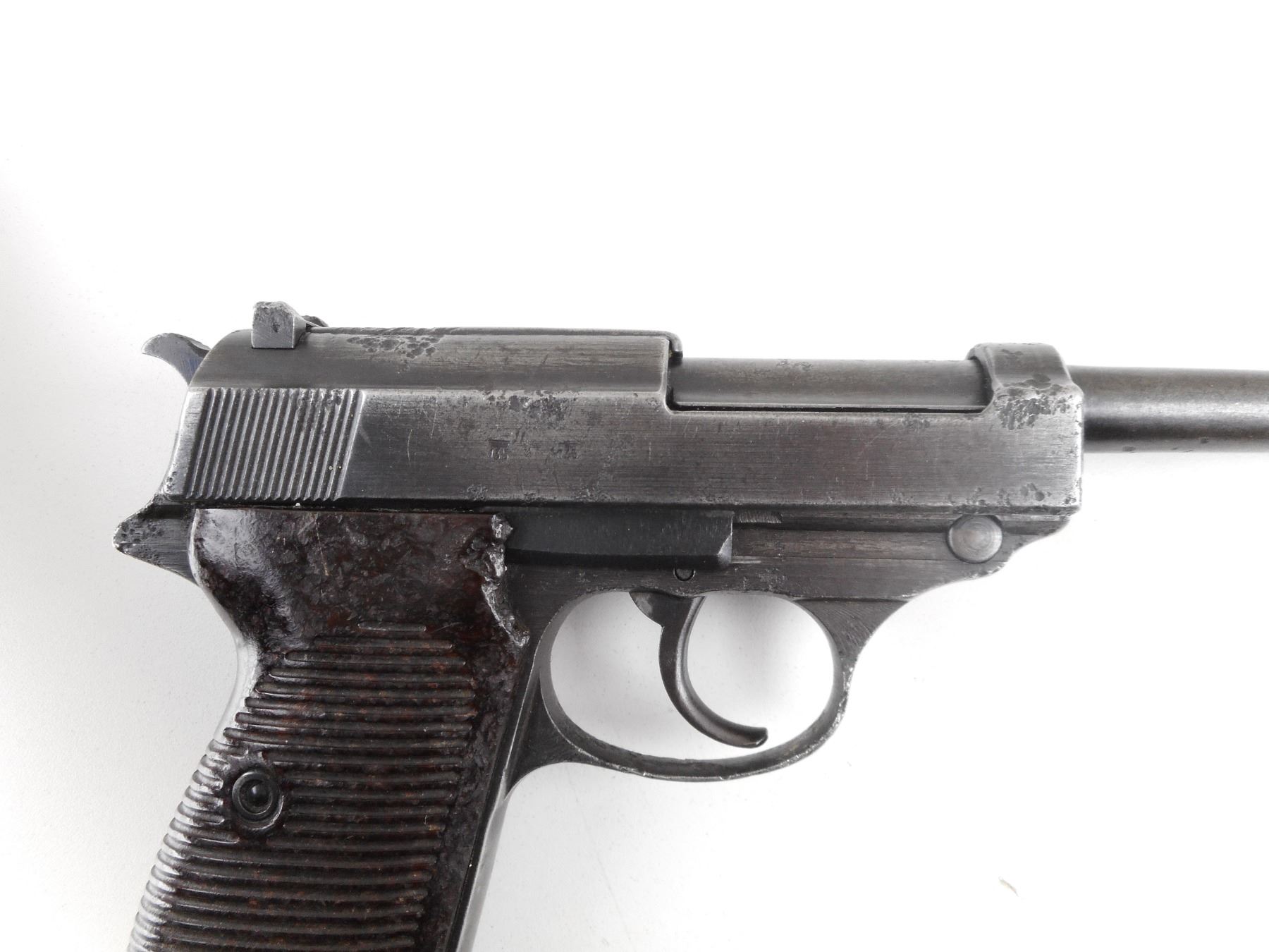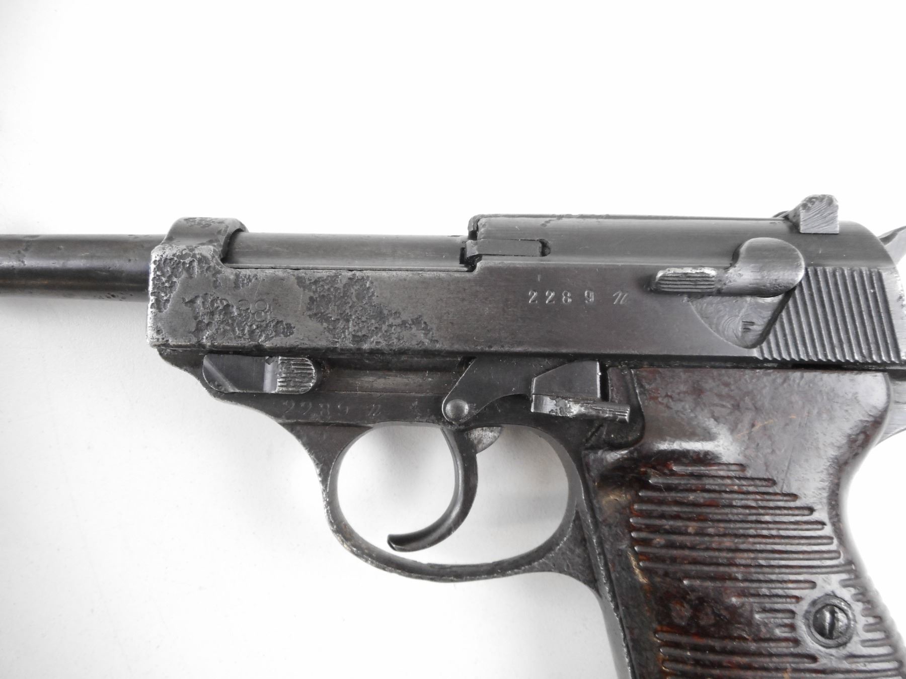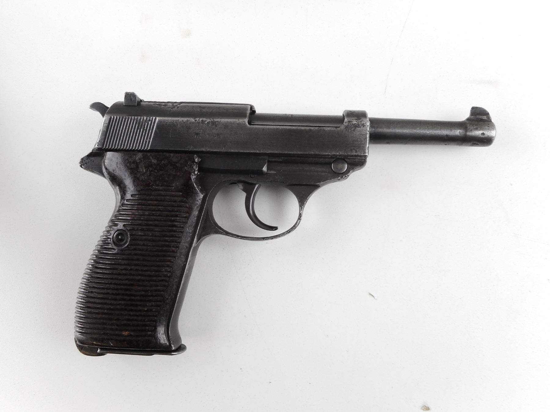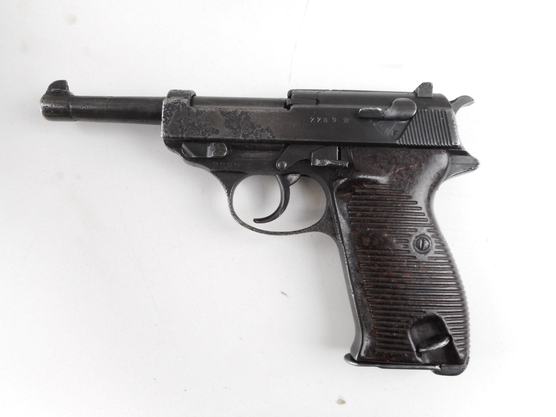 WALTHER , MODEL: P38, CALIBER: 9MM LUGER , COMES WITH MAGAZINE MARKED P38 WAA 359. NUMEROUS GERMAN MILITARY WAR MARKS. BORE IS FAIR WORN WITH LIGHT PITTING. BLADE FRONT SIGHT. U NOTCH REAR SIGHT. METAL PARTS ARE BLUED. FINISH IS FADING. LARGE PATCHES OF DEEP PITTING ON BARREL SLIDE AND FRAME. SERIAL #'S ARE MATCHING. ACTION FUNCTIONS. GROOVED BROWN BAKALITE GRIPS. LANYARD LOOPS. SHOWS NUMEROUS HANDLING MARKS AND WEAR. ACTION: SEMI-AUTOMATIC HANDGUN , BARREL LENGTH: 124MM , SERIAL # 2289N , CONDITION: 4/10 , CLASS: CANADIAN RESTRICTED CLASS