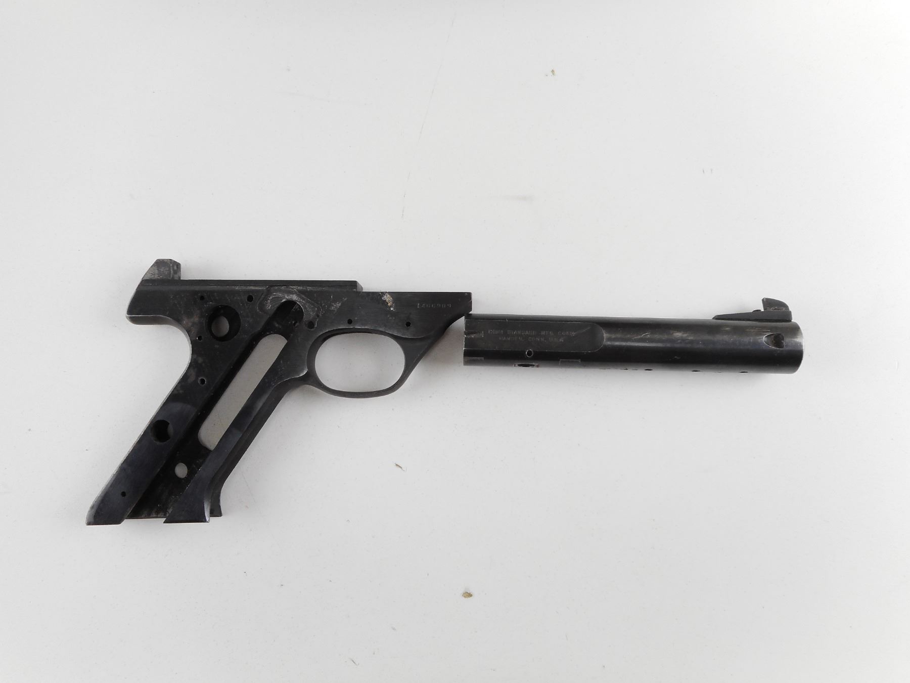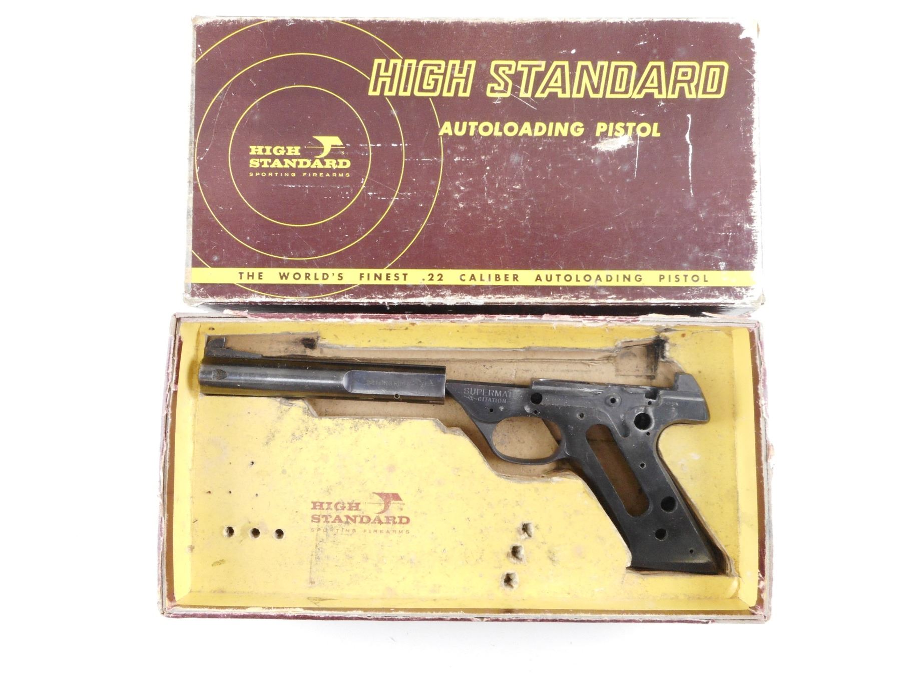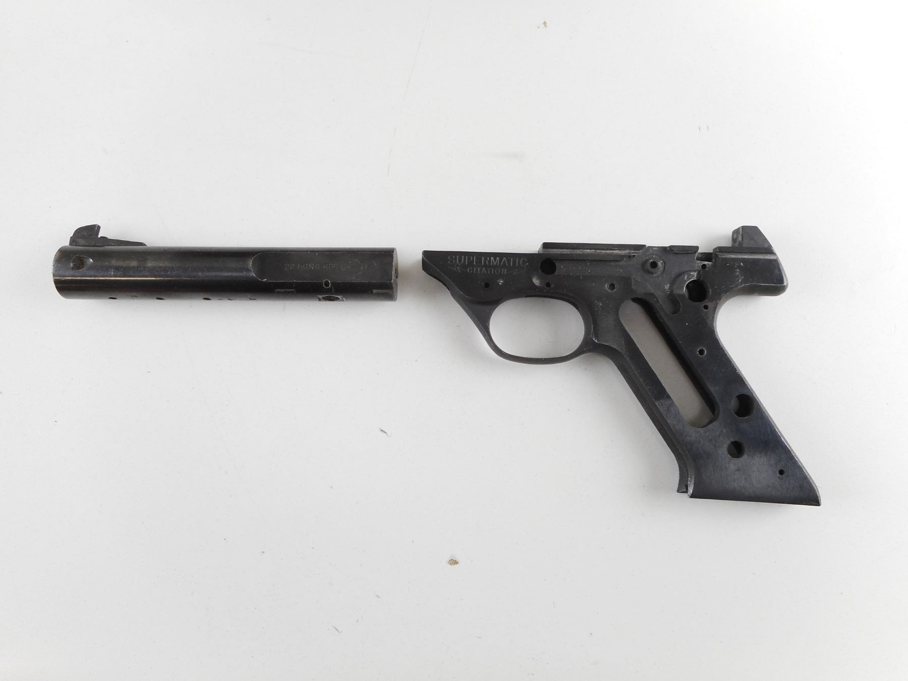 HIGH STANDARD , MODEL: SUPERMATIC CITATION , CALIBER: 22 LR , COMES WITH ORIGINAL HIGH STANDARD BOX. DOES NOT COME WITH MAGAZINE. A STRIPPED LOWER RECEIVER AND A BARREL. BLADE FRONT SIGHT, MISSING THE REAR SIGHT. BORE IS FAIR. ACTION: SEMI-AUTOMATIC HANDGUN , BARREL LENGTH: 140MM , SERIAL # 1466909 , CONDITION: PARTS GUN , CLASS: CANADIAN RESTRICTED CLASS