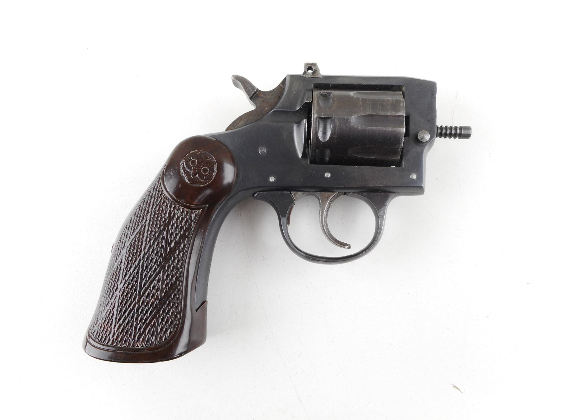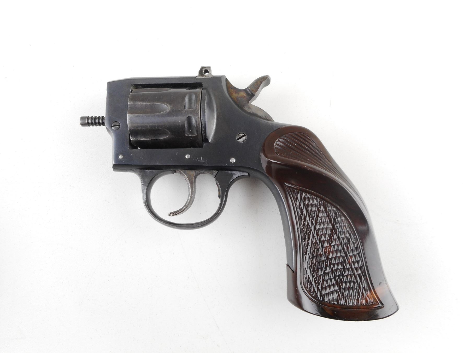 IVER JOHNSON , MODEL: 57 TARGET , CALIBER: 22 LR , NO BARREL. 8 SHOT CAPACITY. FRAME APPEARS TO BE COMPLETE. REAR SIGHT IS MISSING THE BLADE. CHECKERED BROWN POLYMER THUMB REST GRIPS. HOLDS COCK, INDEXES WELL, ACTION IS TIGHT. SHOWS SOME HANDLING MARKS AND WEAR. ACTION: REVOLVER , BARREL LENGTH: NO BARREL , SERIAL # J10812 , CONDITION: PARTS GUN , CLASS: CANADIAN RESTRICTED CLASS