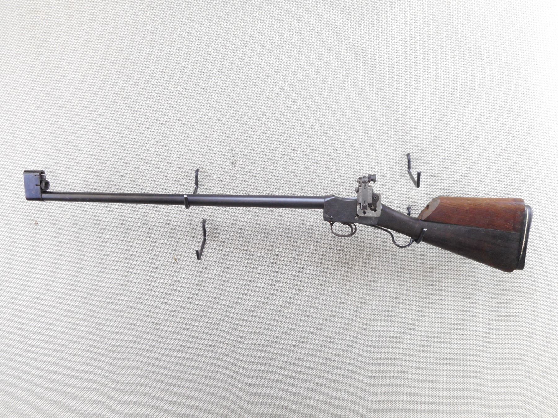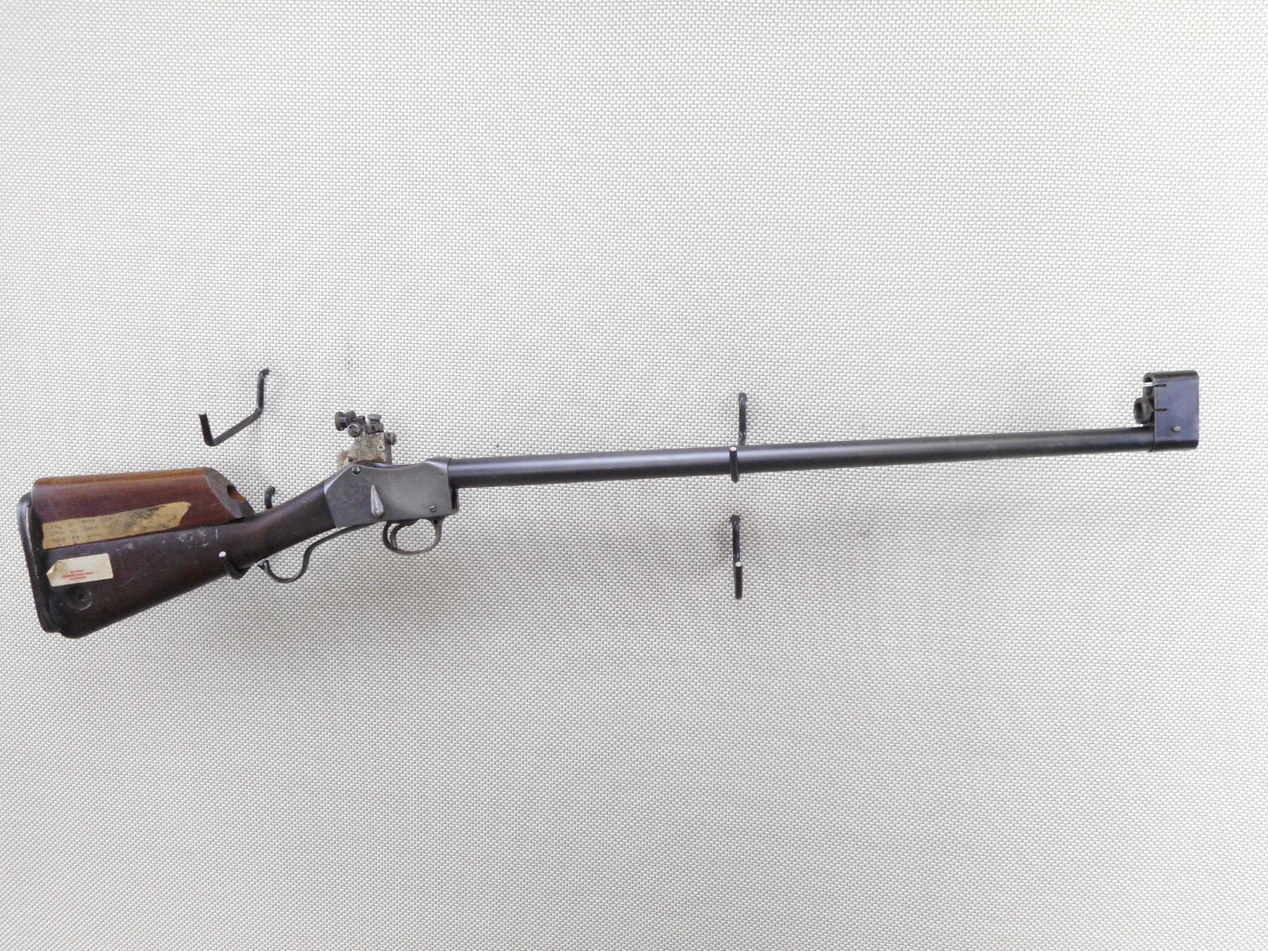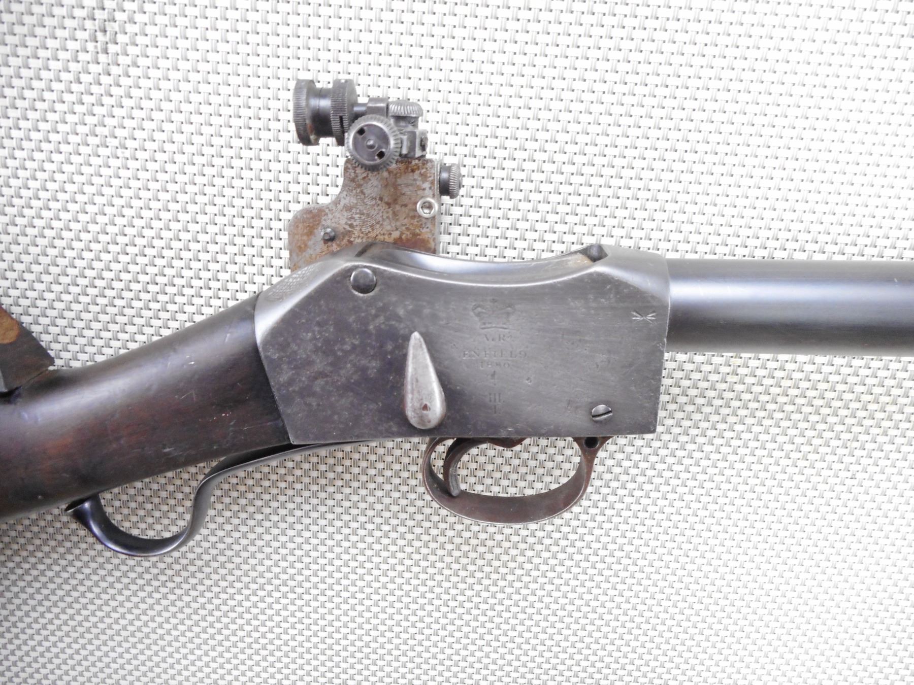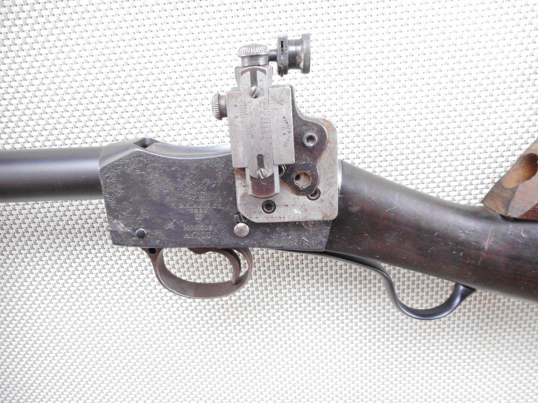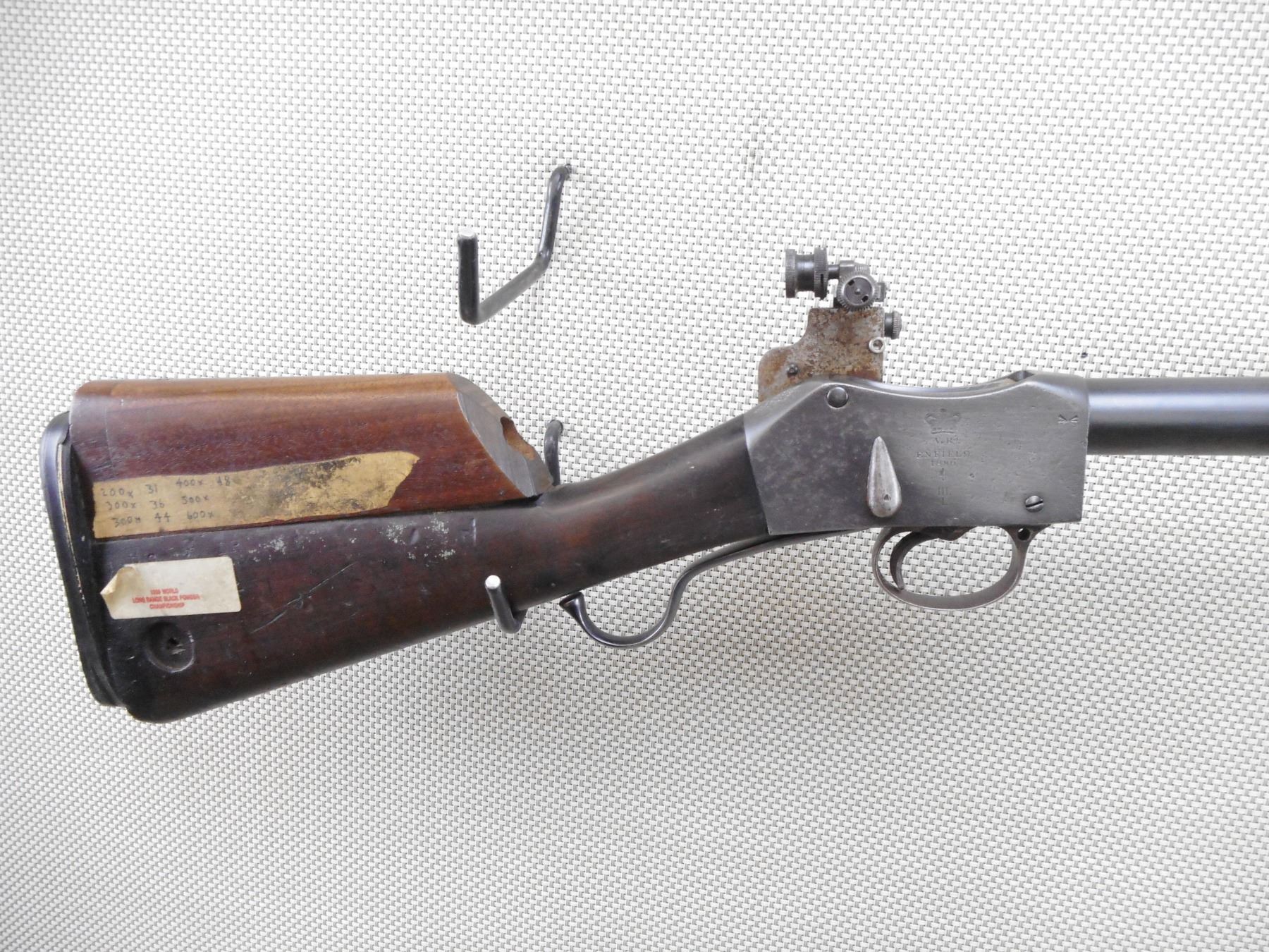 MARTINI HENRY , MODEL: MKIII 1* , CALIBER: 45-70 , BORE IS EXCELLENT. BSA COMMERCIAL. RECEIVER SET UP FOR TARGET SHOOTING, ORIGINALLY THIS WOULD HAVE BEEN 455/577 MARTINI THAT WAS REBARRELED TO 303 BR, THEN REBARRELLED TO 45/70. LEFT SIDE MARKED VR OVER BSA & M CO OVER 1896 OVER CROWN OVER ACIII. RIGHT SIDE MARKED VR OVER ENGIELD OVER 1880 OVER CROWN OVER III OVER I. NO FOREND. FABRICATED BUTT WITH ADDED CHEEK RISER. PARKER HALE 5 A BACKSIGHT ON CUSTOM BASE. CUSTOM FRONT SIGHT BASE WITH TWO TUNNELS FOR BETTER CHEEK POSITION AT EXTREME LONG RANGES. SOLD OF OF SERVICE MARK. TECHNICAL INSPECTION STICKER FROM 1999 WORLD BLACK POWDER LONG RANGE CHAMPIONSHIPS. PITTED FINISH ON RECEIVER. SHOWS SOME HANDLING MARKS. ACTION: MARTINI FALLING BLOCK , BARREL LENGTH: 27 1/2" , SERIAL # 1880 , CONDITION: 5/10 ANTIQUE , CLASS: CANADIAN ANTIQUE CLASS