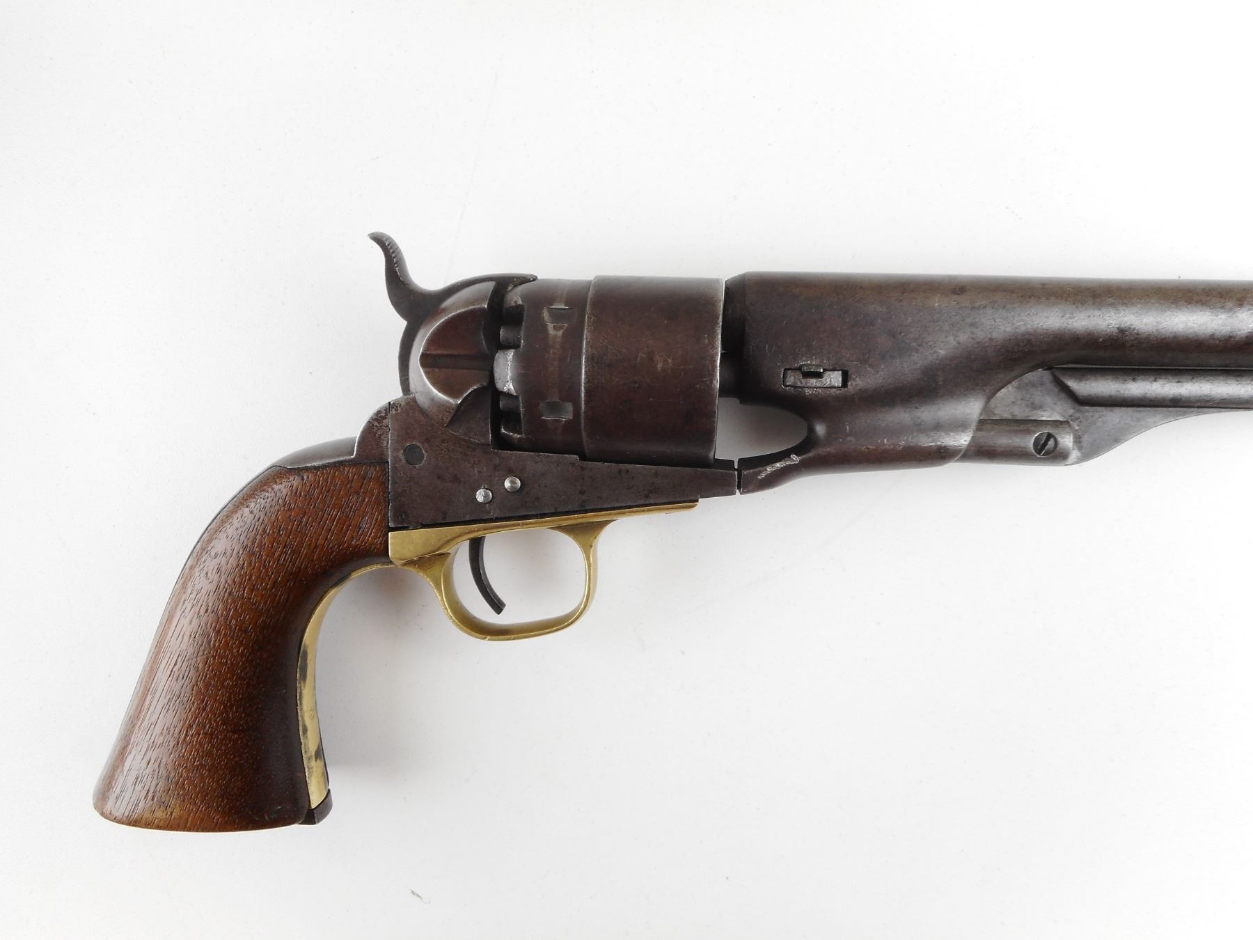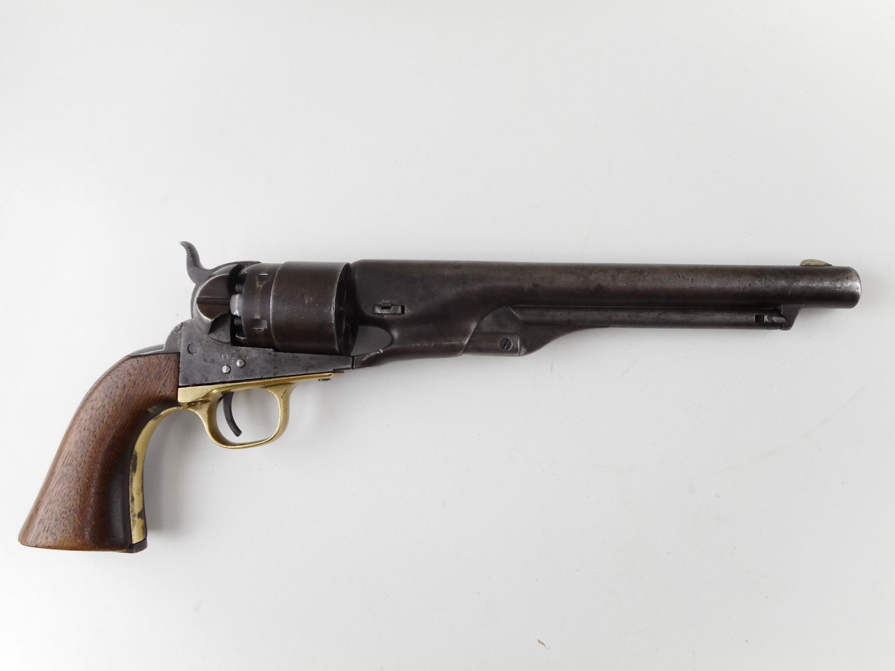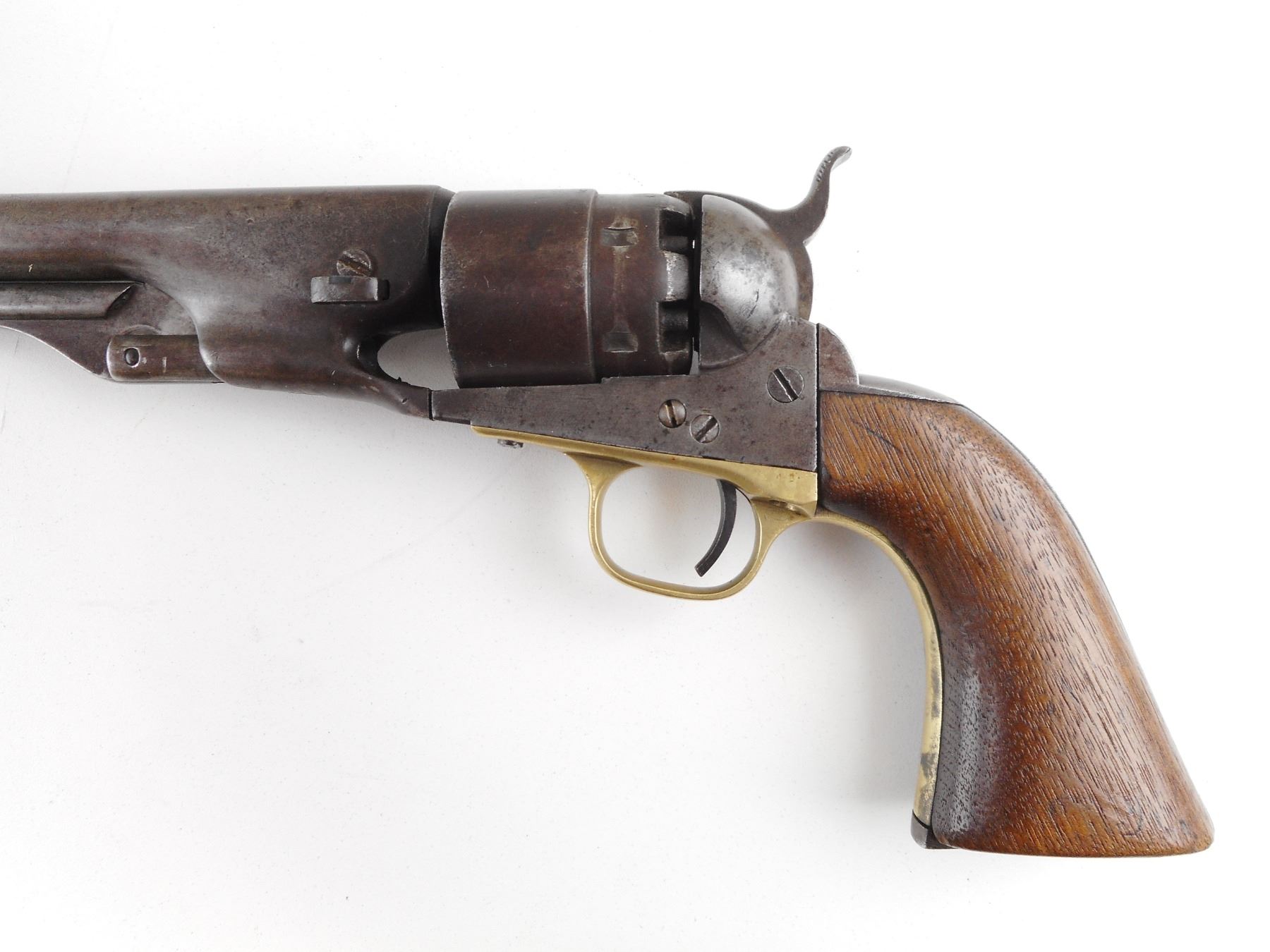 COLT , MODEL: 1860 ARMY , CALIBER: 44 CAL PERC , GOOD BORE. VERY NICE US CIVIL WAR ERA PISTOL MANUFACTURED IN 1862. HOLDS COCK, INDEXES, AND THE ACTION IS TIGHT. BLADE FRONT SIGHT AND NOTCH HAMMER REAR SIGHT. PLAIN WOOD GRIP PANELS WITH REMINENTS OF INSPECTOR MARKS. SOME LIGHT SURFACE PITTING. RETAINS VERY LITTLE OF THE CYLINDER ENGRAVING. SHOWS SOME HANDLING MARKS. ACTION: REVOLVER , BARREL LENGTH: 203MM , SERIAL # 80309 , CONDITION: 6/10 , CLASS: CANADIAN ANTIQUE CLASS