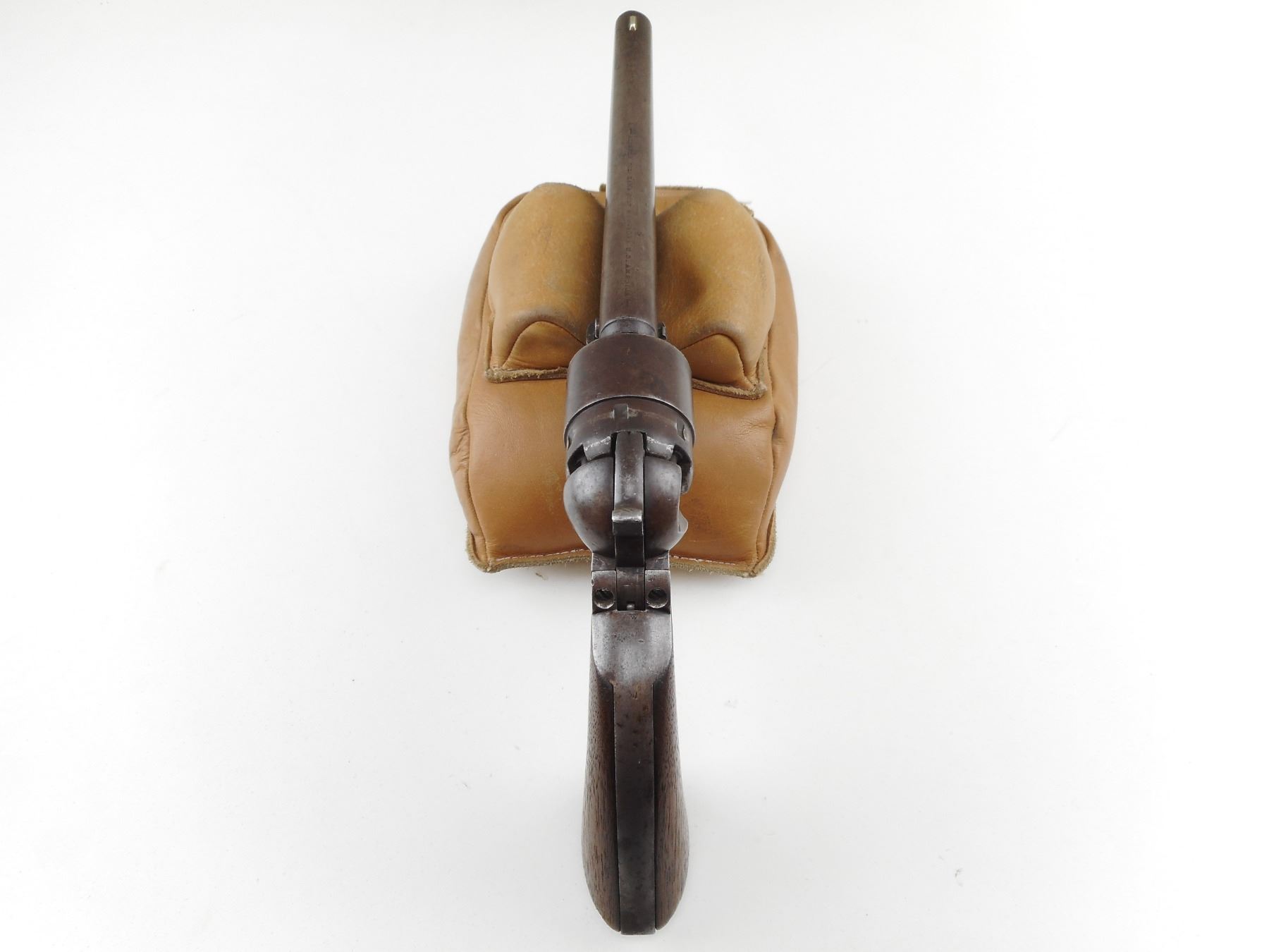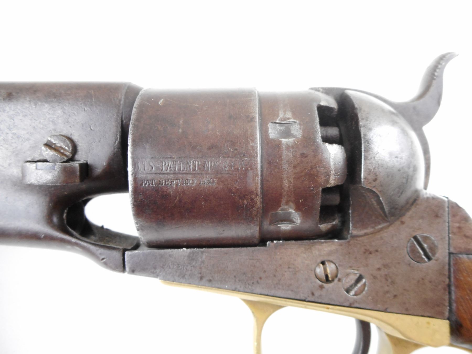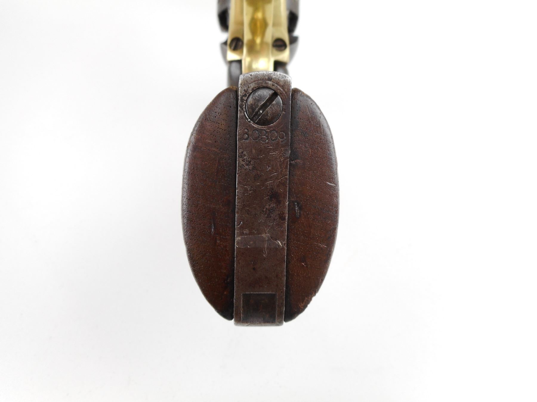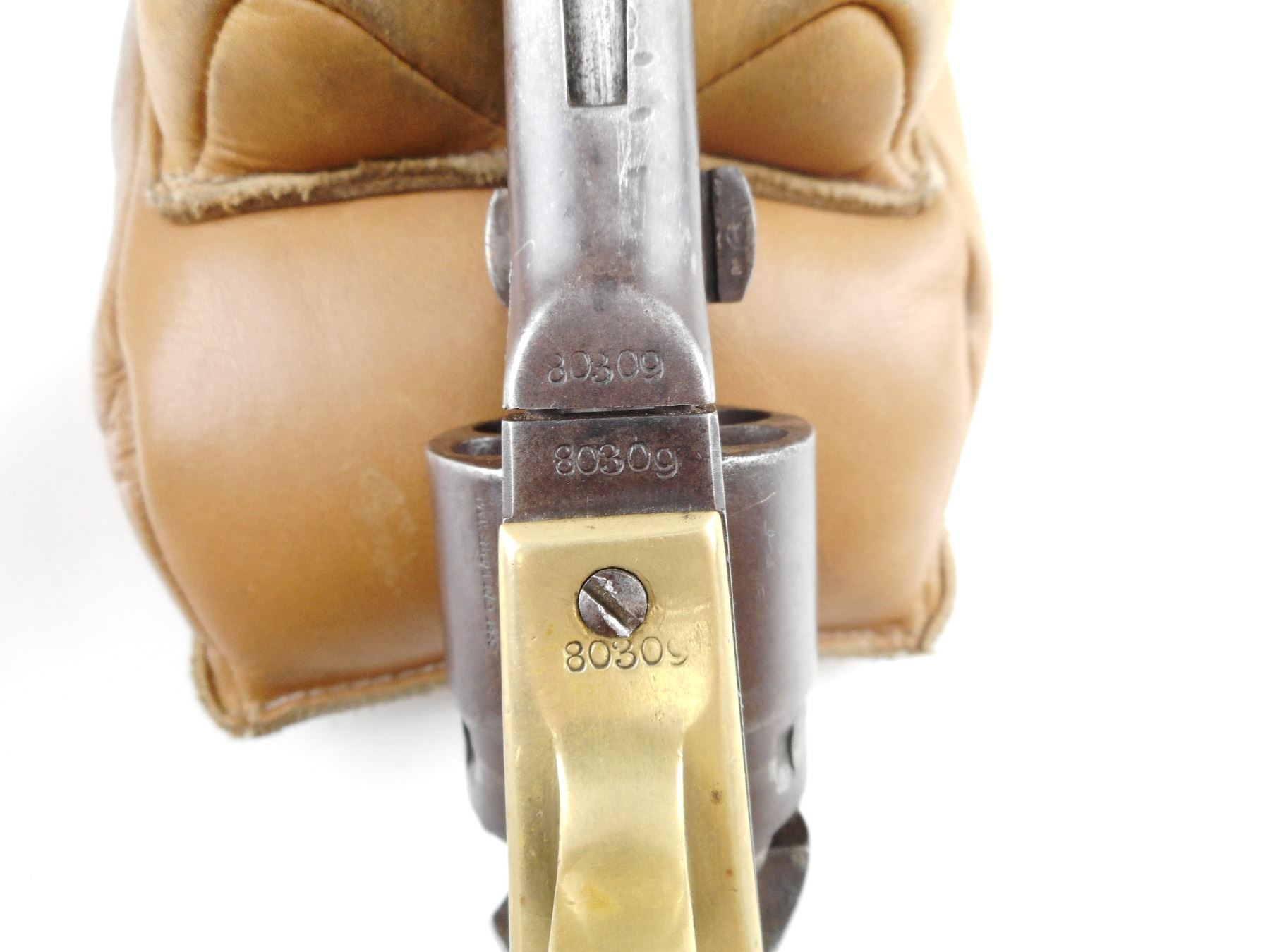 COLT , MODEL: 1860 ARMY , CALIBER: 44 CAL PERC , GOOD BORE. VERY NICE US CIVIL WAR ERA PISTOL MANUFACTURED IN 1862. HOLDS COCK, INDEXES, AND THE ACTION IS TIGHT. BLADE FRONT SIGHT AND NOTCH HAMMER REAR SIGHT. PLAIN WOOD GRIP PANELS WITH REMINENTS OF INSPECTOR MARKS. SOME LIGHT SURFACE PITTING. RETAINS VERY LITTLE OF THE CYLINDER ENGRAVING. SHOWS SOME HANDLING MARKS. ACTION: REVOLVER , BARREL LENGTH: 203MM , SERIAL # 80309 , CONDITION: 6/10 , CLASS: CANADIAN ANTIQUE CLASS