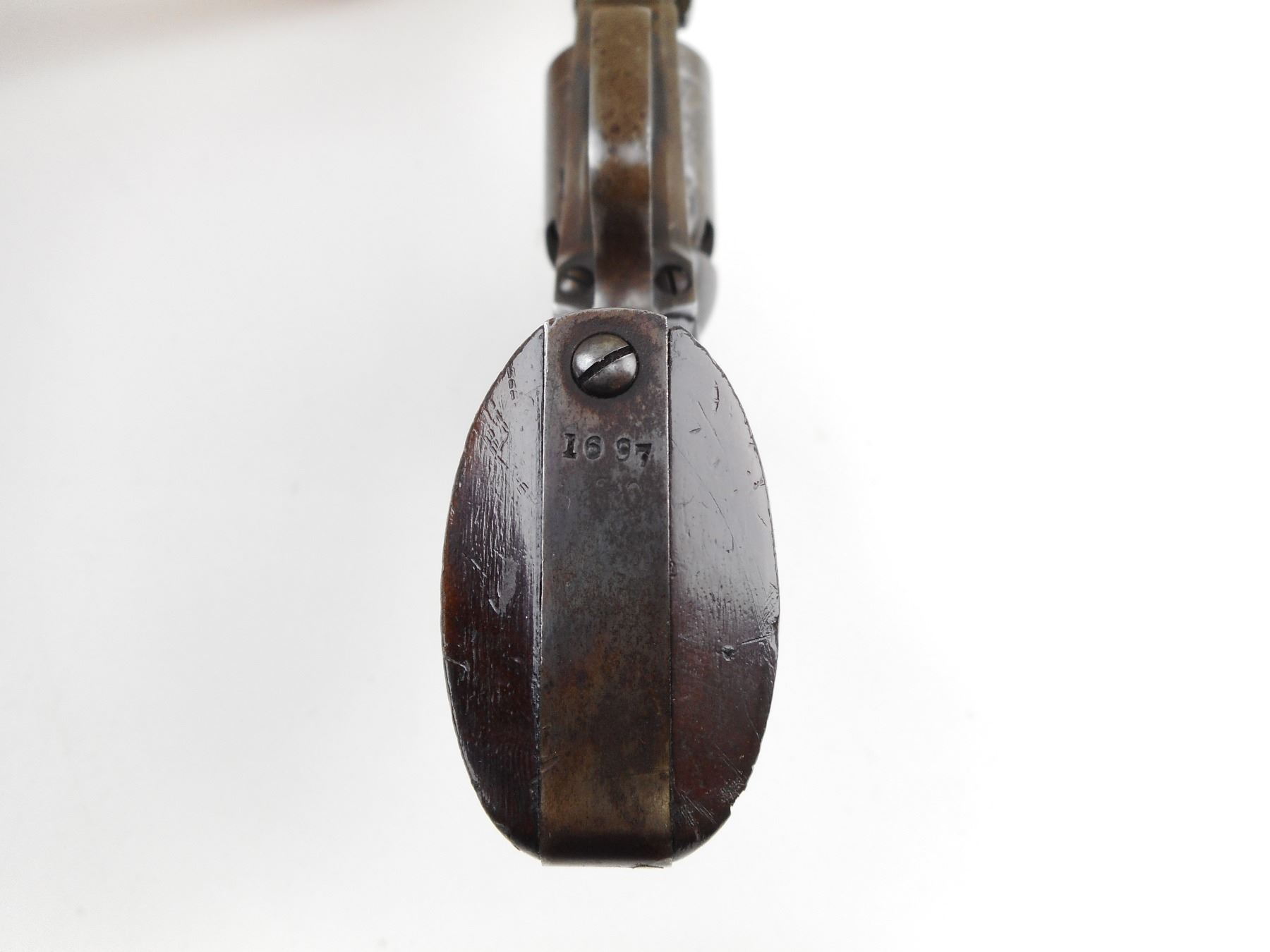 COLT , MODEL: 1849 POCKET LONDON , CALIBER: 31 CAL PERC , BORE IS VERY GOOD. BEAD FRONT SIGHT AND NOTCH HAMMER REAR SIGHT. MANUFACTURED IN 1850. TWO PIECE PLAIN WOOD GRIP PANELS. HOLDS COCK, INDEXES WELL, ACTION IS TIGHT. RETAINS FULL CYLINDER ENGRAVED SCENE. MISSING THE WEDGE RETAINING SCREW. SHOWS SOME HANDLING MARKS. ACTION: REVOLVER , BARREL LENGTH: 152MM , SERIAL # 1697 , CONDITION: 6/10 , CLASS: CANADIAN ANTIQUE CLASS