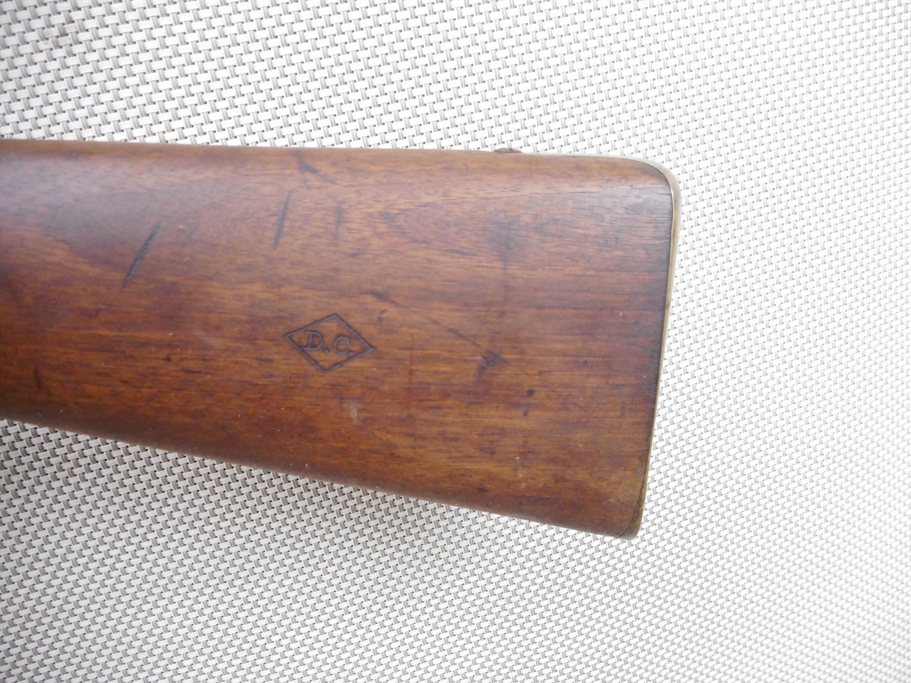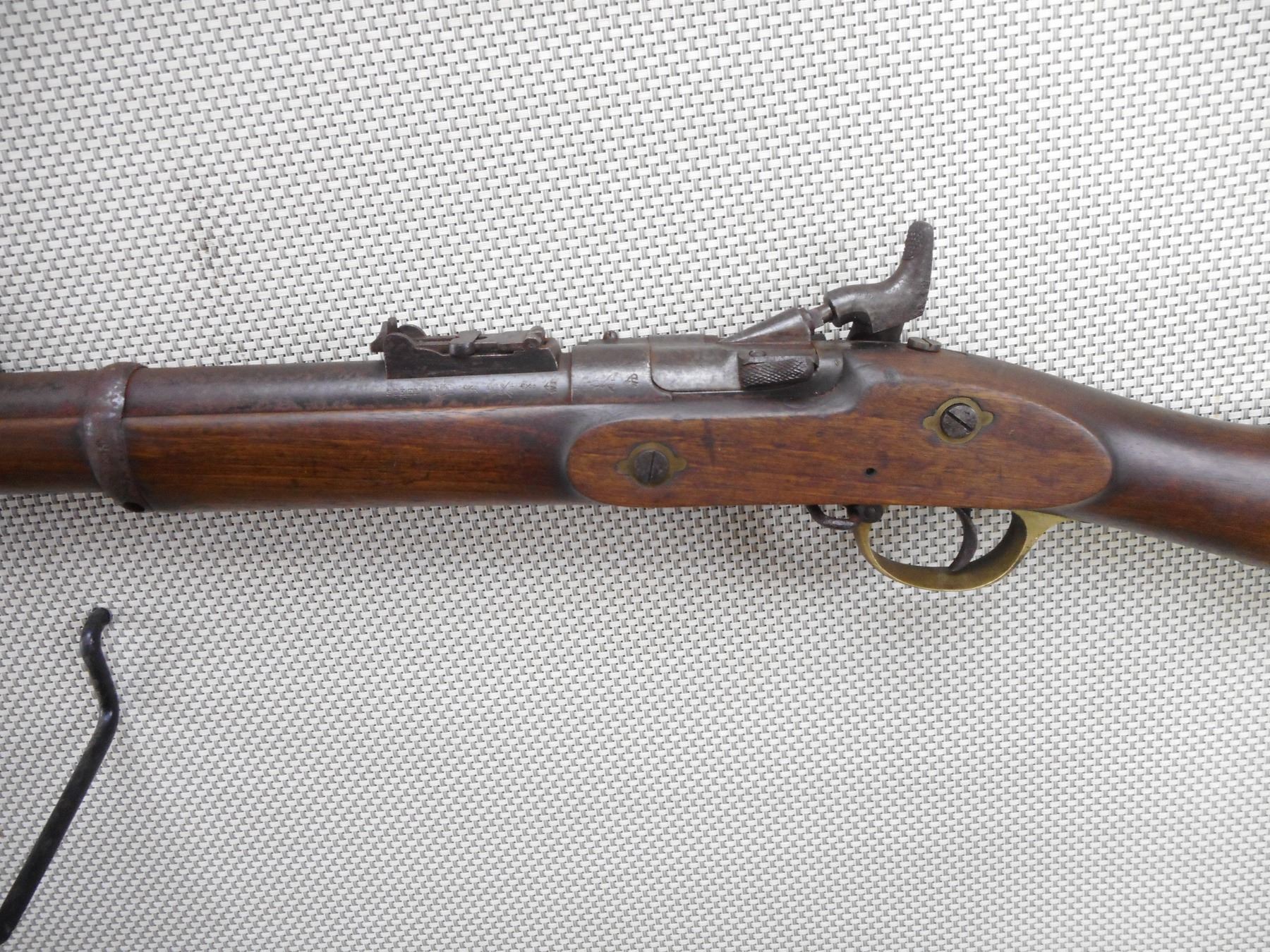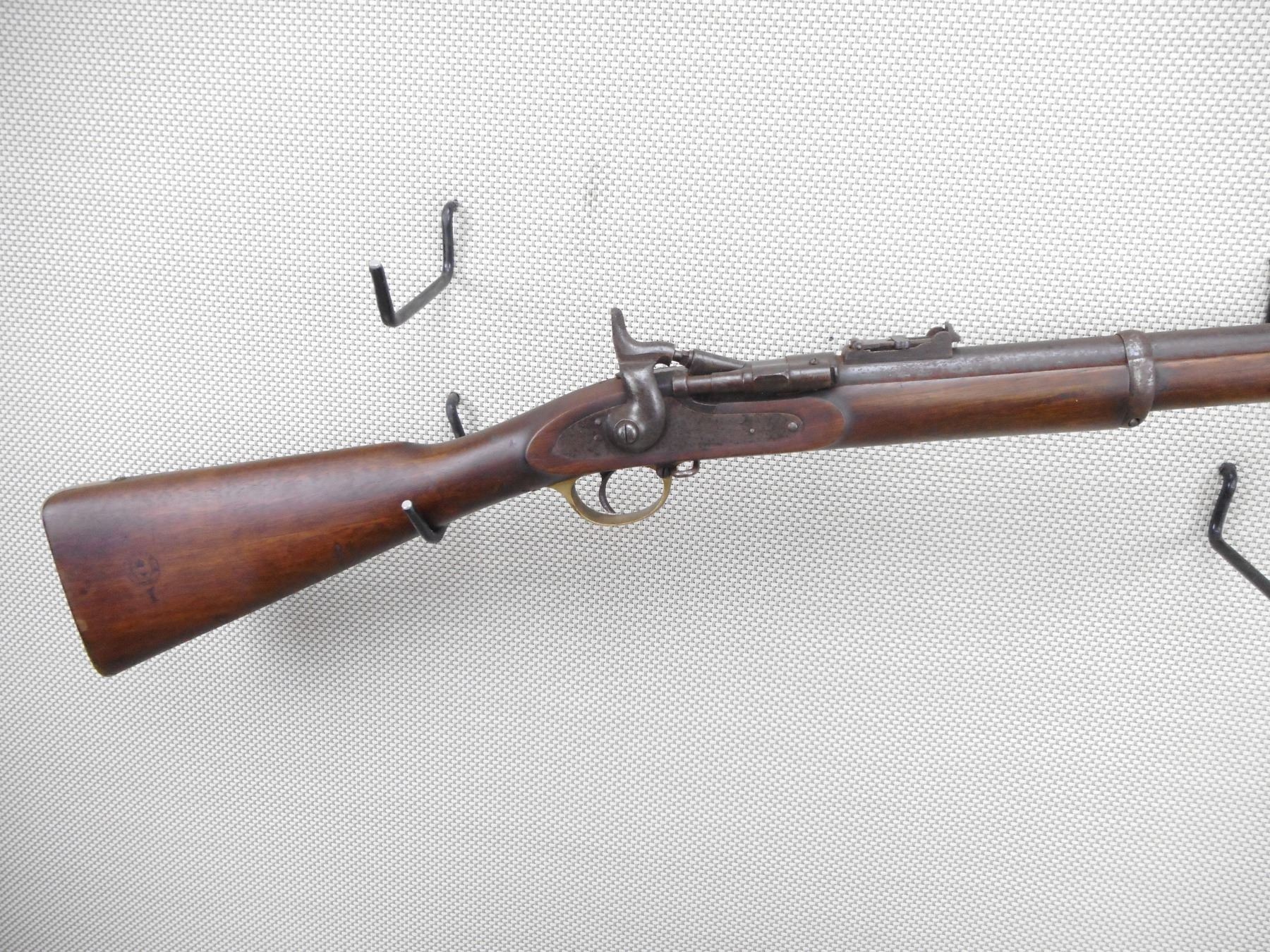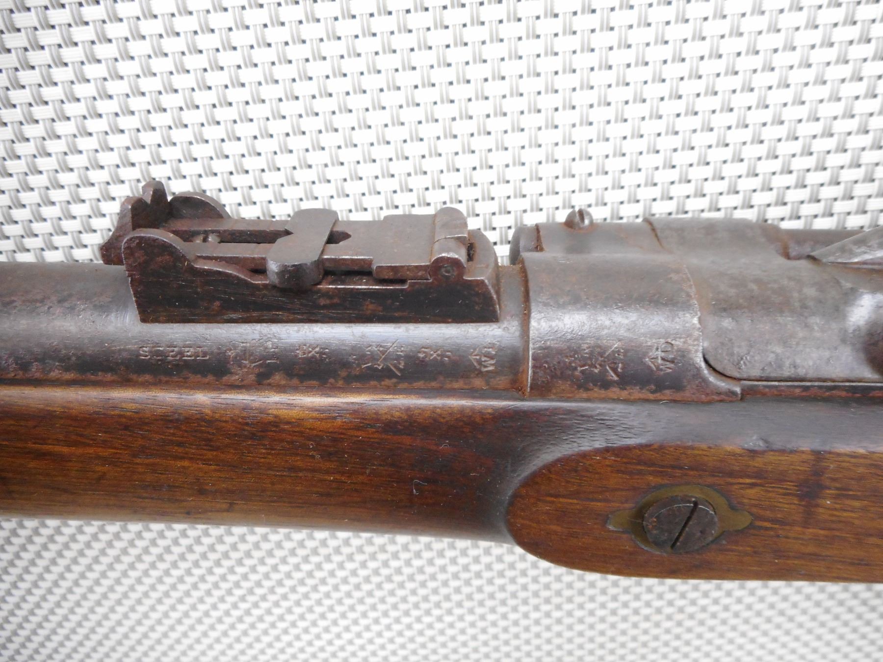 SNIDER ENFIELD , MODEL: MK III , CALIBER: 577 SNIDER , BORE IS POOR. DATED 1871. BLADE FRONT AND ADJUSTABLE REAR SIGHT. ONE PIECE HARDWOOD STOCK WITH BRASS BUTT PLATE. MARKED WITH A DC IN A DIAMOND. REPLACEMENT RAM ROD. SHOWS EXTENSIVE HANDLING MARKS AND LIGHT SURFACE RUST. ACTION: SIDE TIPPING BREACH BLOCK , BARREL LENGTH: 36" , SERIAL # 38 , CONDITION: 6/10 ANTIQUE , CLASS: CANADIAN ANTIQUE CLASS