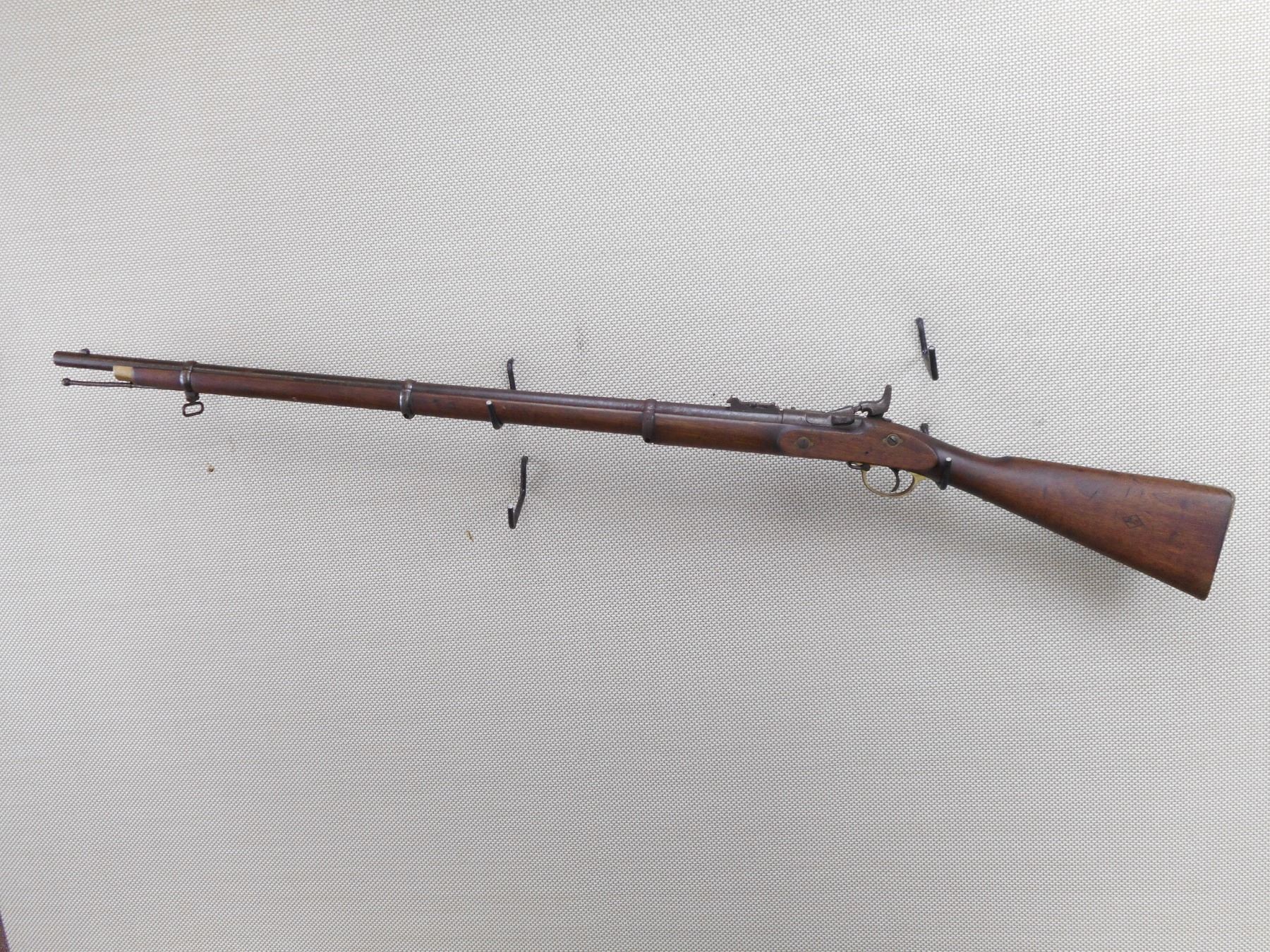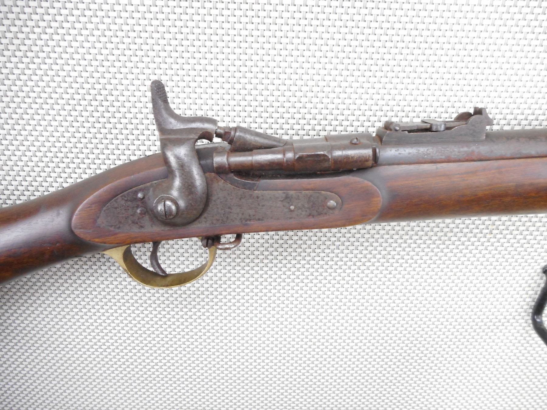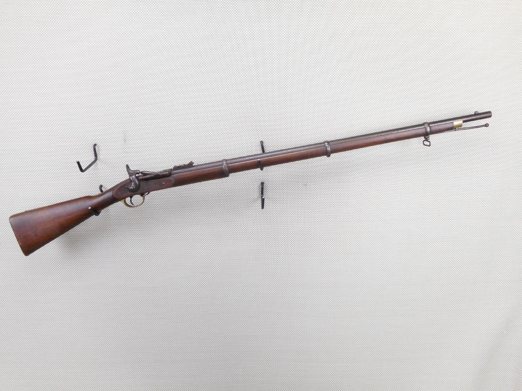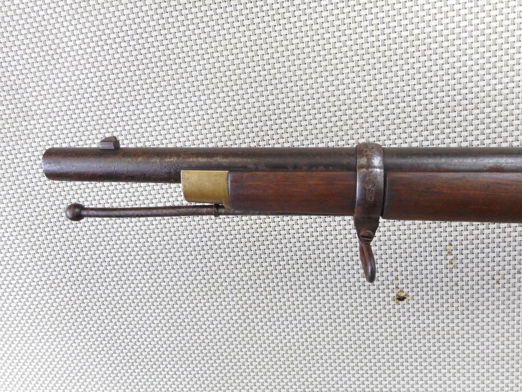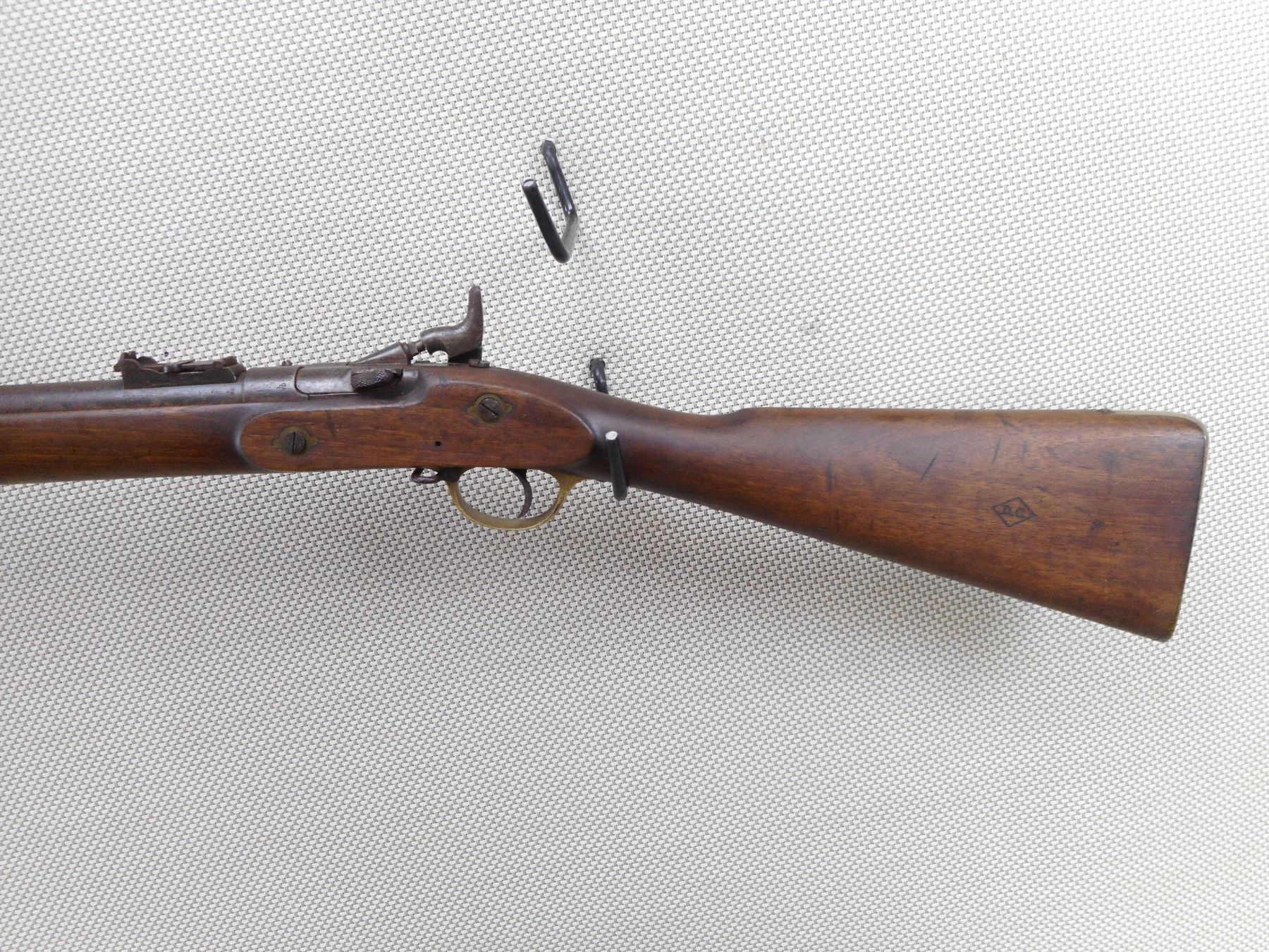 SNIDER ENFIELD , MODEL: MK III , CALIBER: 577 SNIDER , BORE IS POOR. DATED 1871. BLADE FRONT AND ADJUSTABLE REAR SIGHT. ONE PIECE HARDWOOD STOCK WITH BRASS BUTT PLATE. MARKED WITH A DC IN A DIAMOND. REPLACEMENT RAM ROD. SHOWS EXTENSIVE HANDLING MARKS AND LIGHT SURFACE RUST. ACTION: SIDE TIPPING BREACH BLOCK , BARREL LENGTH: 36" , SERIAL # 38 , CONDITION: 6/10 ANTIQUE , CLASS: CANADIAN ANTIQUE CLASS
