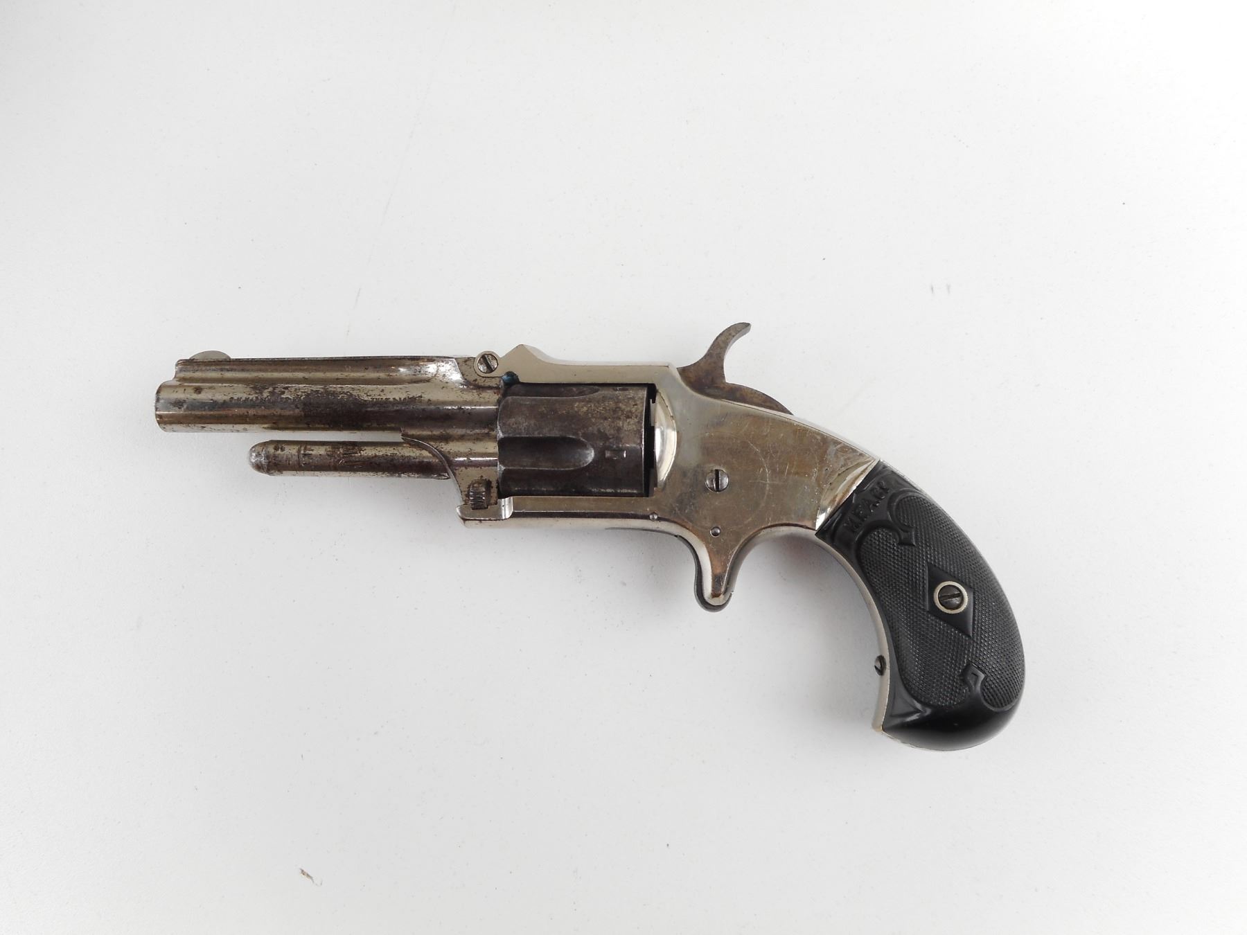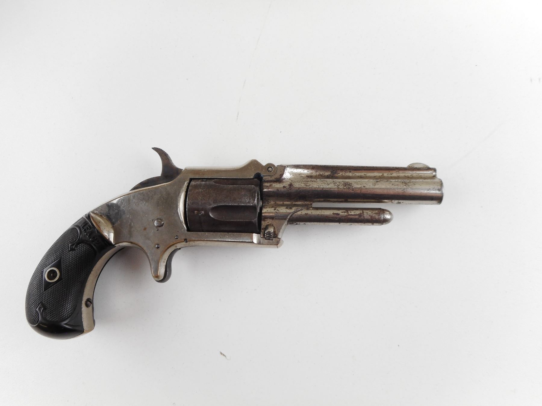 MARLIN , MODEL: 32 STANDARD 1875 , CALIBER: 32 RIM FIRE , 5 SHOT CAPACITY. BORE IS GOOD. HOLDS COCK, INDEXES WELL, ACTION IS TIGHT. BLADE FRONT AND NOTCH REAR SIGHT. MISSING A LARGE PORTION OF THE NICKEL PLATING. CHECKERED BLACK GRIP PANELS WITH MARLIN LOGO. SHOWS SOME HANDING MARKS.ACTION: REVOLVER , BARREL LENGTH: 76MM , SERIAL # 1619 , CONDITION: 6/10 ANTIQUE , CLASS: CANADIAN ANTIQUE CLASS